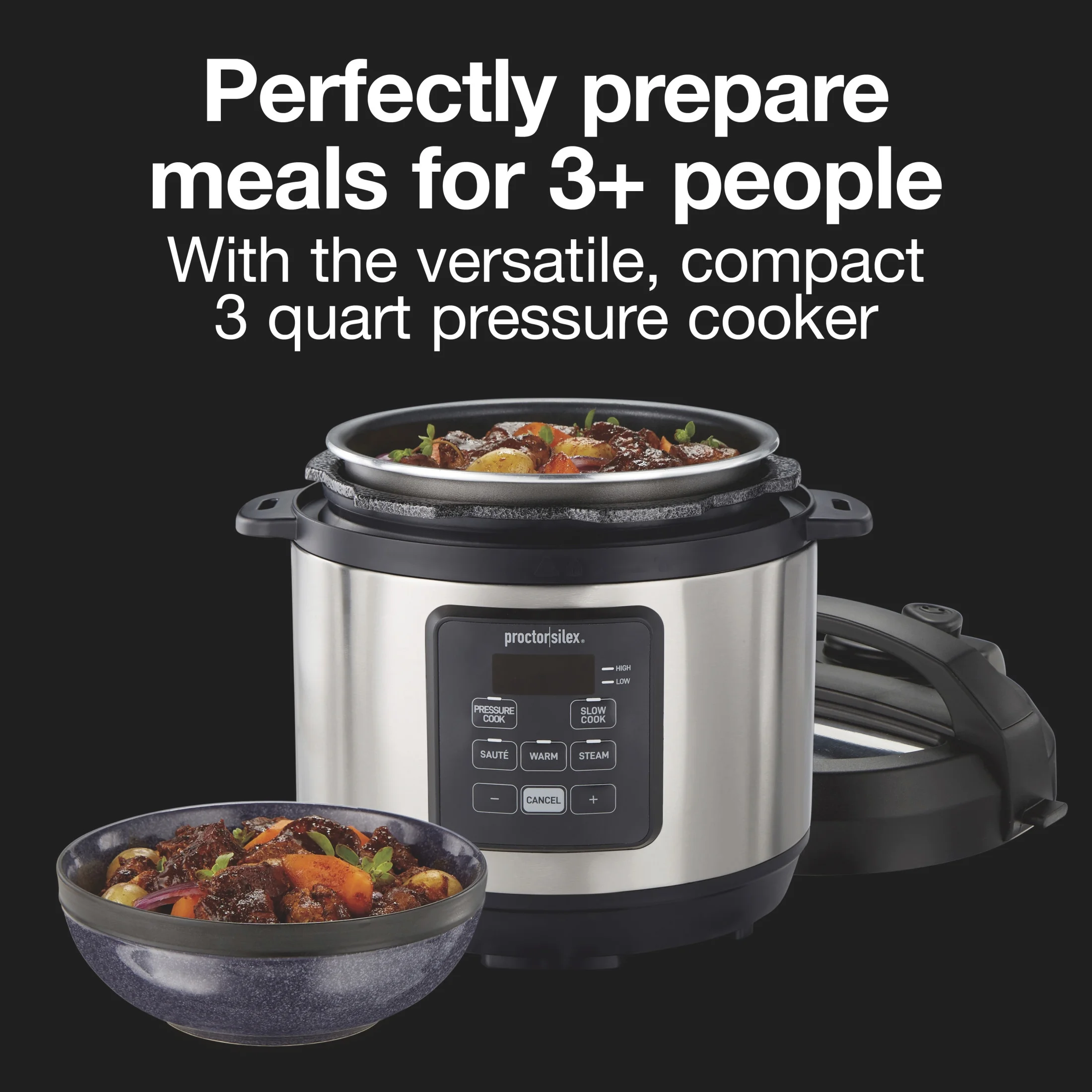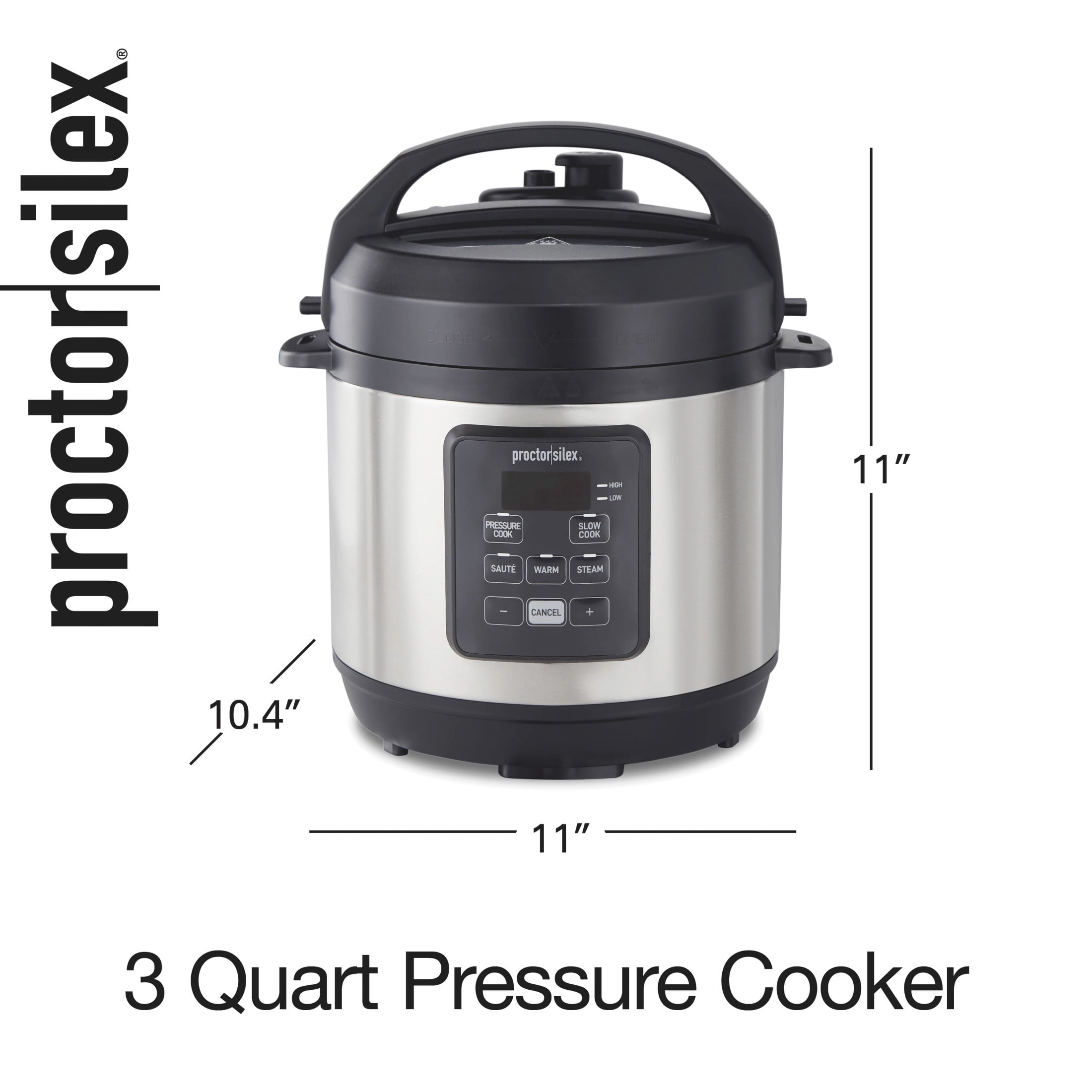 Proctor Silex 3 Quart Simplicity Pressure Cooker, Multi-Cooker, Slow Cooker, Steamer, Sauté, Rice Cooker, True Slow Technology, 34503: PERFECTLY PREPARE MEALS FOR 3+ PEOPLE: Smaller than typical multi-cookers, this compact machine is great for cooking meals for 3+ people and for smaller kitchens. It’s versatile with multiple cooking modes yet takes up less space on the countertop. EASY TO USE WITH SIMPLE COOKING MODES: The pressure cooker has simple direct cooking modes. It pressure cooks, slow cooks on high or low, sautés, steams, or warm foods. Just choose your cooking mode and set the cooking time on the digital countdown timer. FOODS WON’T OVERCOOK: True Slow™ technology with 2 heat settings ensures a gradual rise in temperature, for classic slow cooking results. Food doesn’t overcook and slow cooker meals come out just the way you expect. EASILY BROWN & SAUTÉ MEATS: The brown/sauté button lets you add flavor to meals by browning and sautéing food right in the nonstick pot. PREPARE FOOD UP TO 70% FASTER: With pressure cooking, you’ll get dinner on the table faster than you ever thought possible. Prepare food up to 70% faster with pressure cooking in this 3 quart pressure cooker.