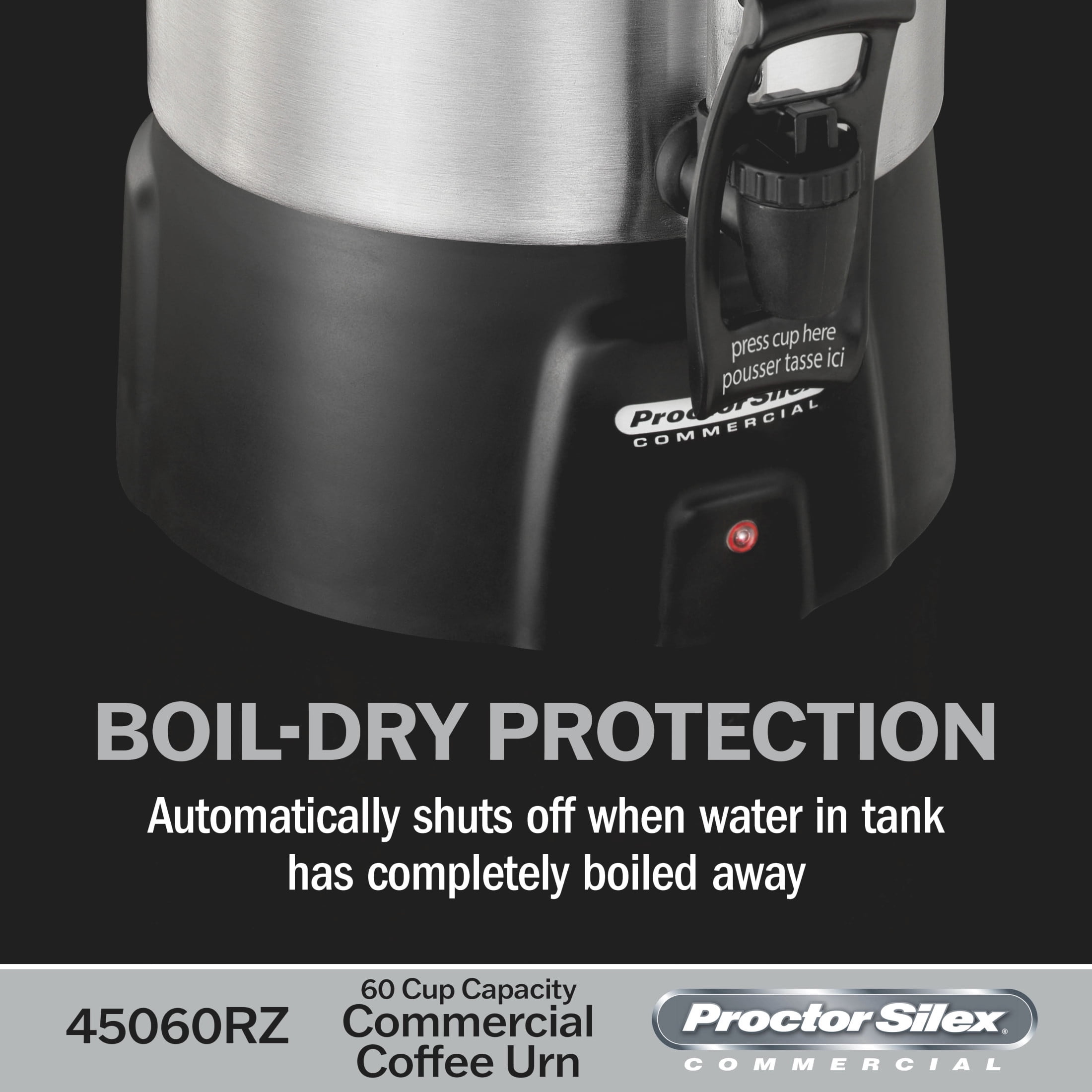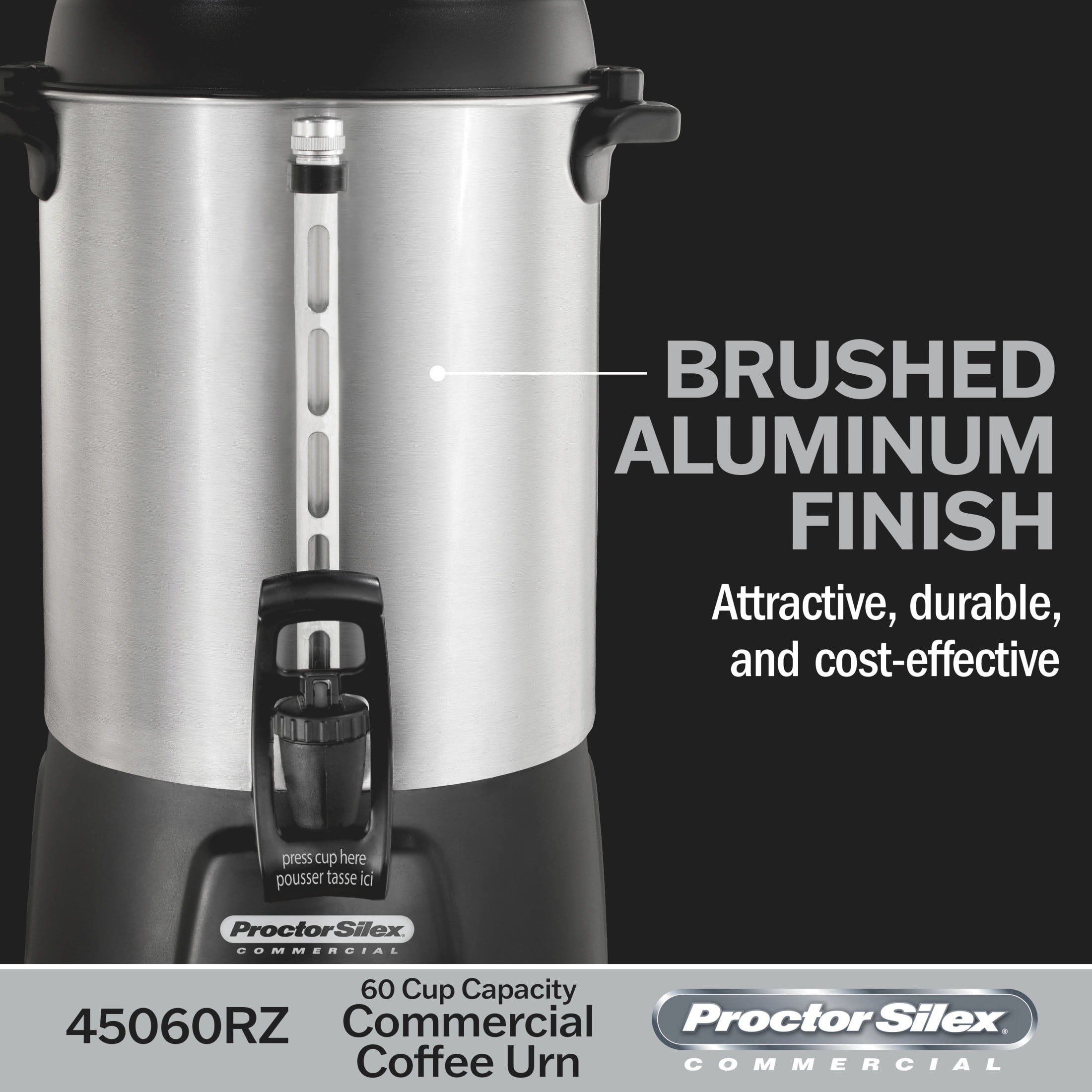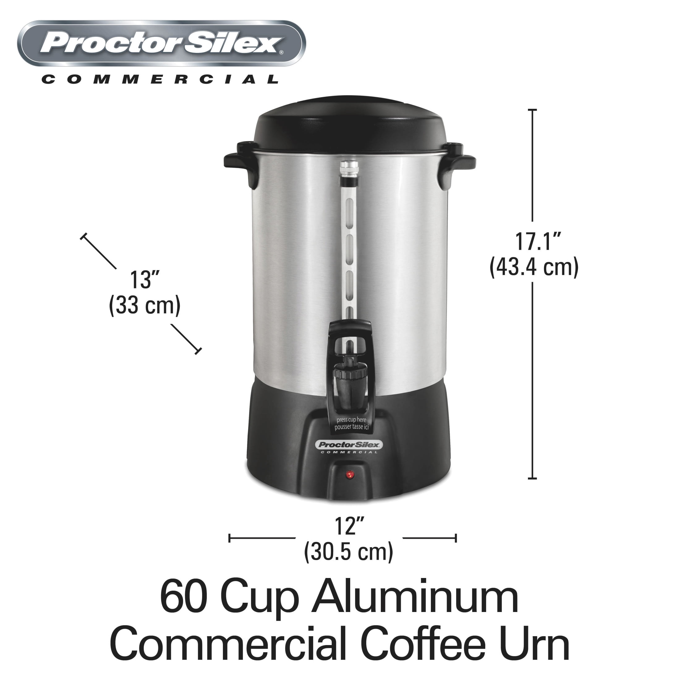 The Proctor Silex Commercial 60 cup Coffee Urn features cup-a-minute brewing and maintains the proper temperature to serve fresh-tasting coffee to large groups and gatherings. Available in 40 cup, 60 cup, and 100 cup sizes, the urns have a durable brushed aluminum finish and have a dual heater system designed to create consistent brews. First the center heater brews coffee and shuts off, and then a gentle warming heater prevents overcooking. The boil-dry protection feature automatically turns the unit off when water in the tank has completely boiled away. Convenient one-hand dispensing fills cups fast, speeding up coffee service lines and the water/coffee window shows when the coffee level is low. The coffee level tube is easy to remove for cleaning, and the metal cover holds the coffee tube in place for easy viewing. The urn includes a permanent plastic filter basket, eliminating the need for paper coffee filters. A twist-and-lock lid minimizes the chance for spillage, and heavy-duty plastic handles provide convenient portability. Approved to UL commercial standards and NSF approved, this product was designed for restaurant and hotel use.