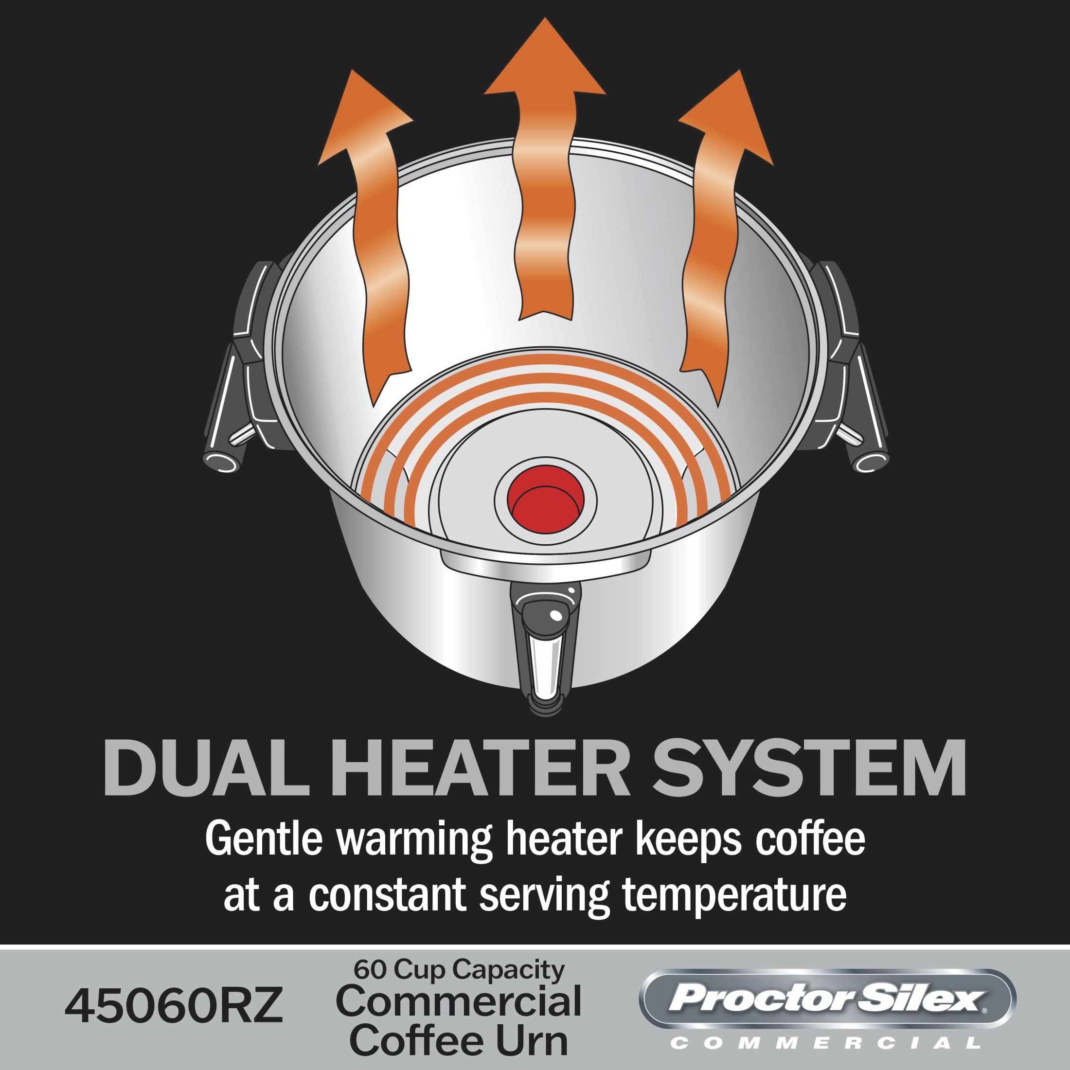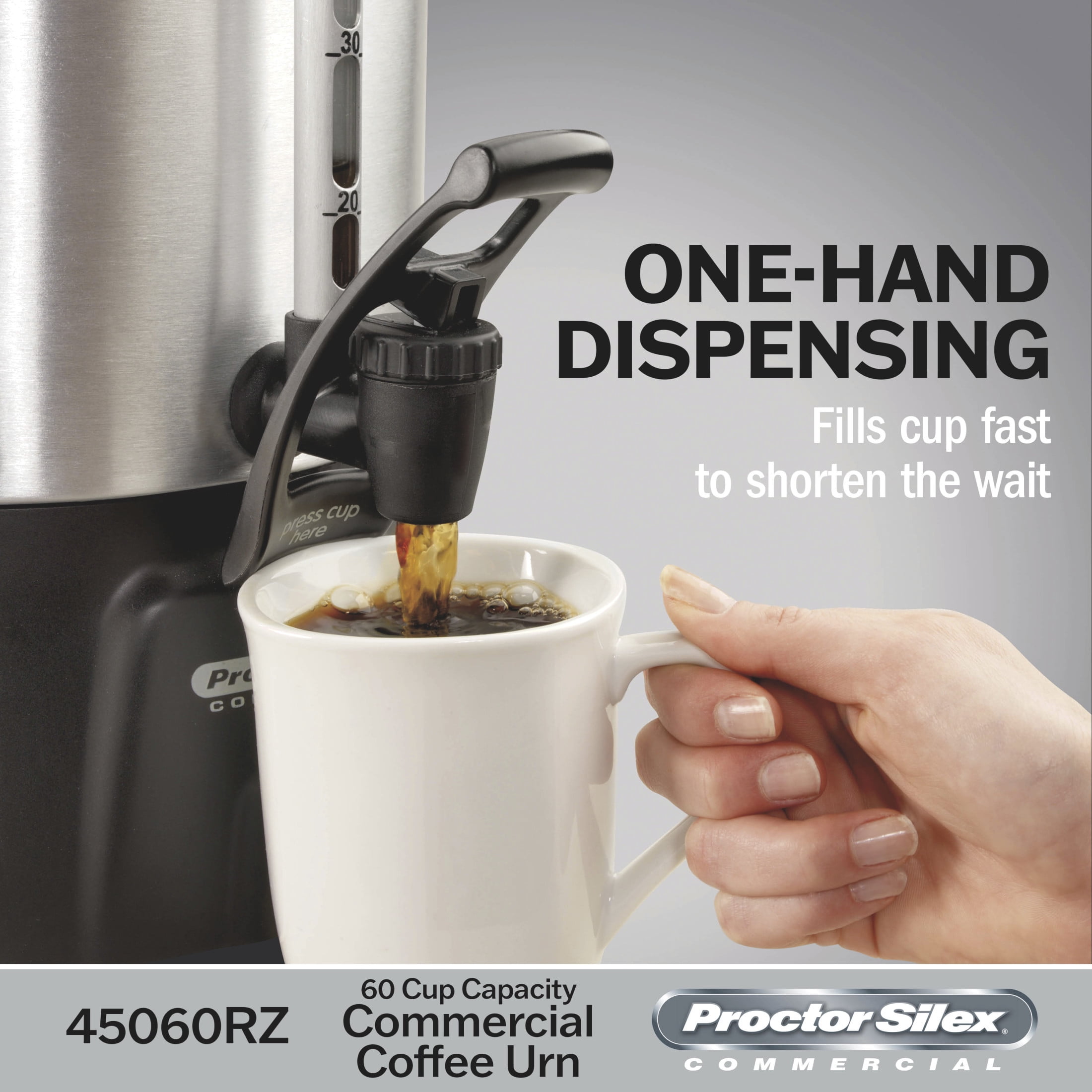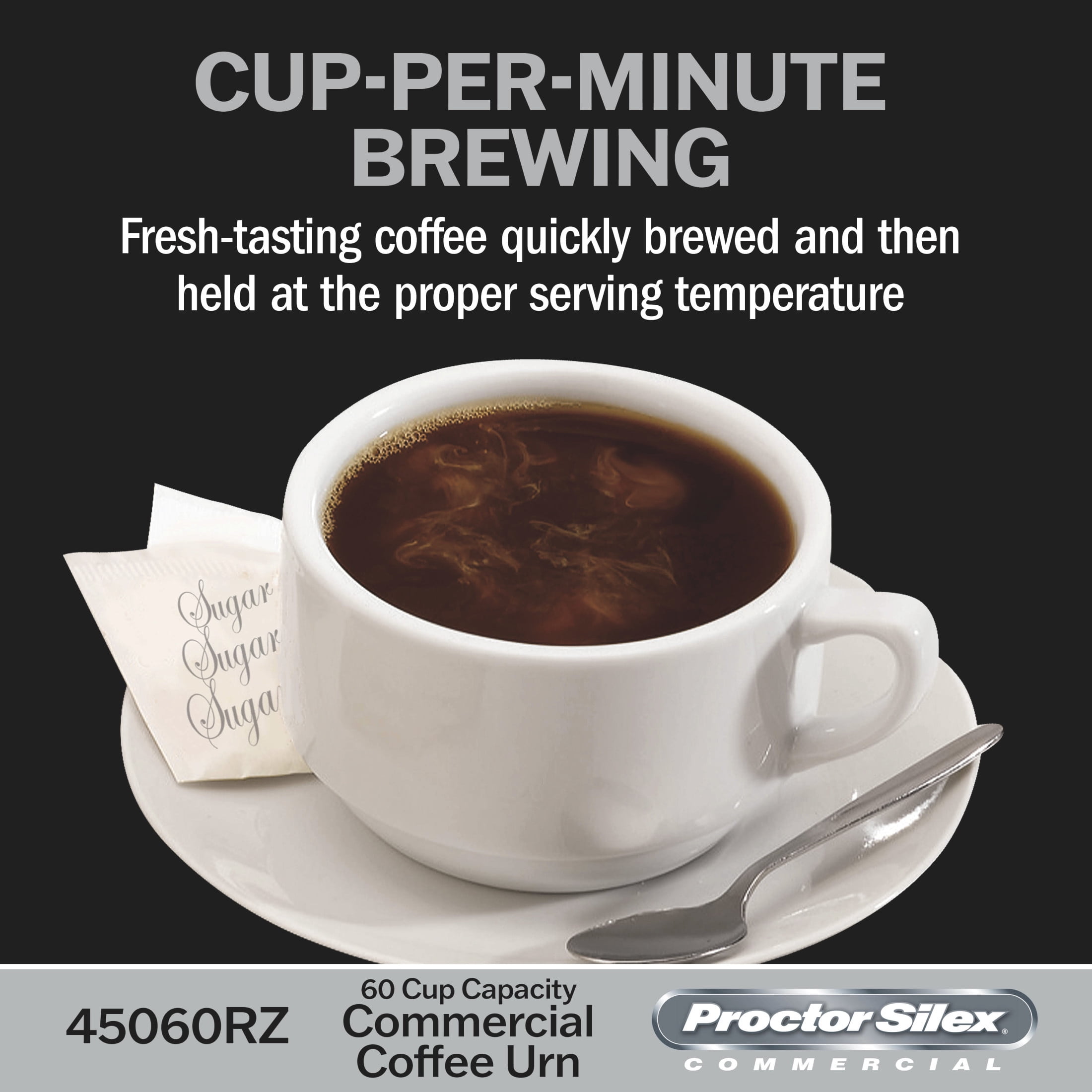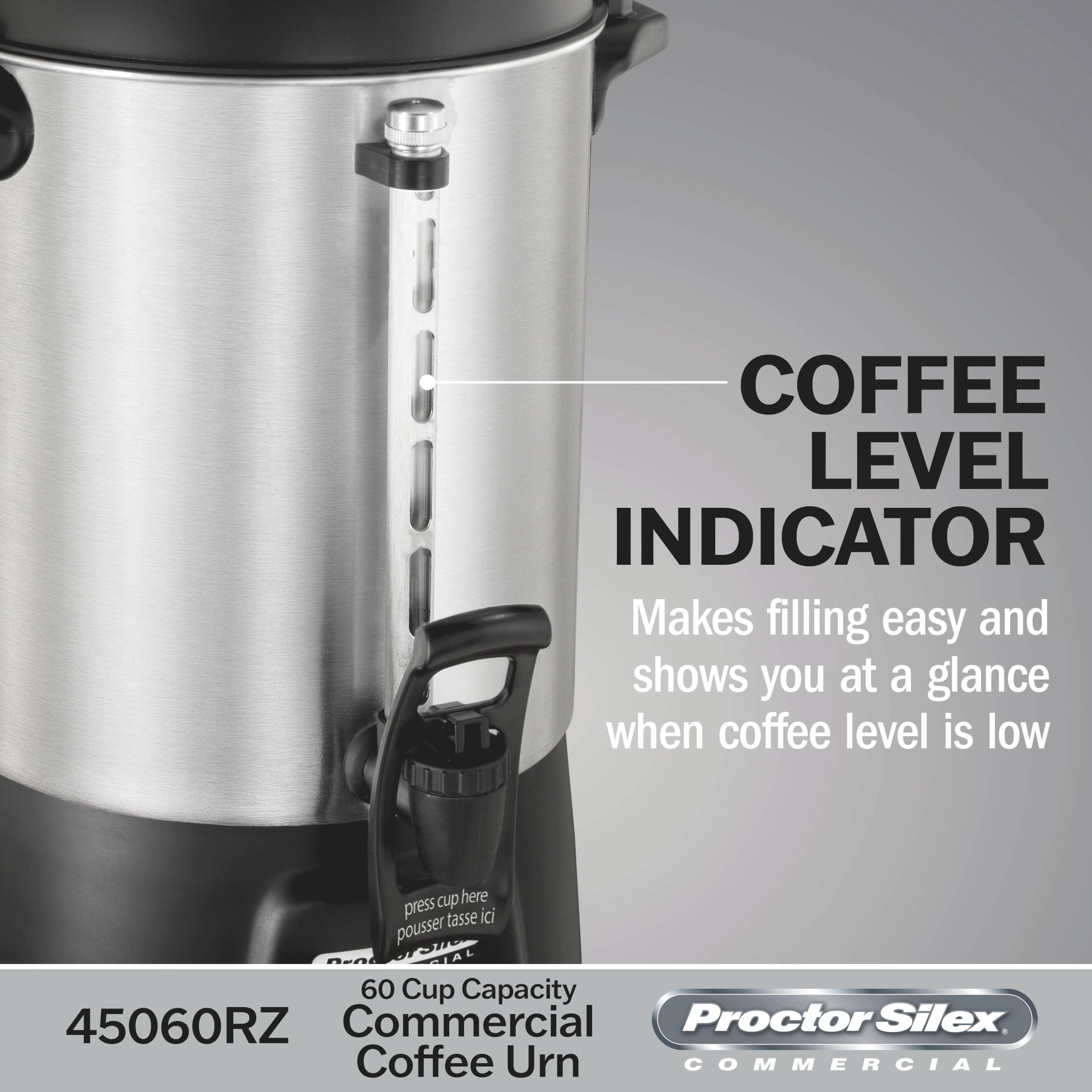 The Proctor Silex Commercial 60 cup Coffee Urn features cup-a-minute brewing and maintains the proper temperature to serve fresh-tasting coffee to large groups and gatherings. Available in 40 cup, 60 cup, and 100 cup sizes, the urns have a durable brushed aluminum finish and have a dual heater system designed to create consistent brews. First the center heater brews coffee and shuts off, and then a gentle warming heater prevents overcooking. The boil-dry protection feature automatically turns the unit off when water in the tank has completely boiled away. Convenient one-hand dispensing fills cups fast, speeding up coffee service lines and the water/coffee window shows when the coffee level is low. The coffee level tube is easy to remove for cleaning, and the metal cover holds the coffee tube in place for easy viewing. The urn includes a permanent plastic filter basket, eliminating the need for paper coffee filters. A twist-and-lock lid minimizes the chance for spillage, and heavy-duty plastic handles provide convenient portability. Approved to UL commercial standards and NSF approved, this product was designed for restaurant and hotel use.