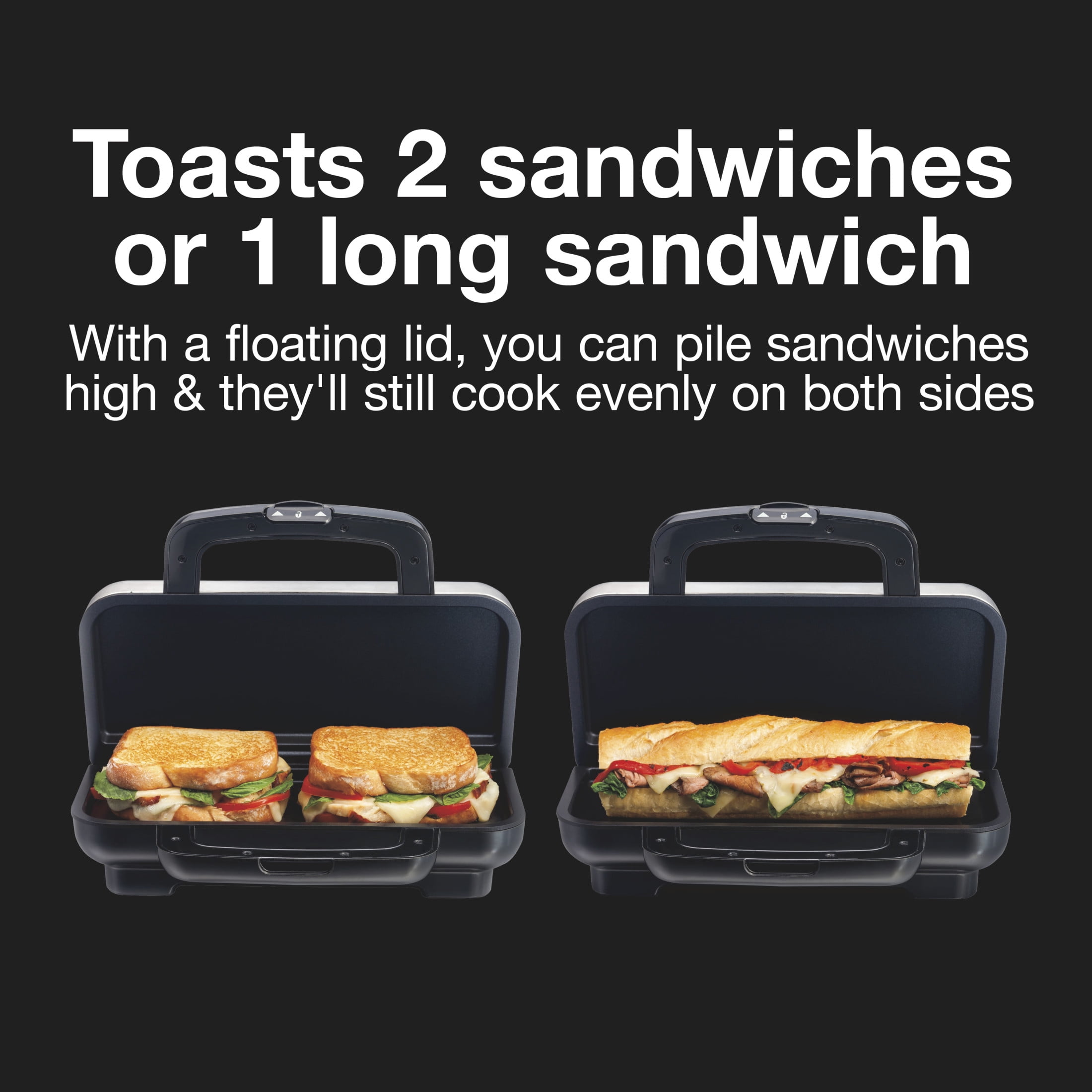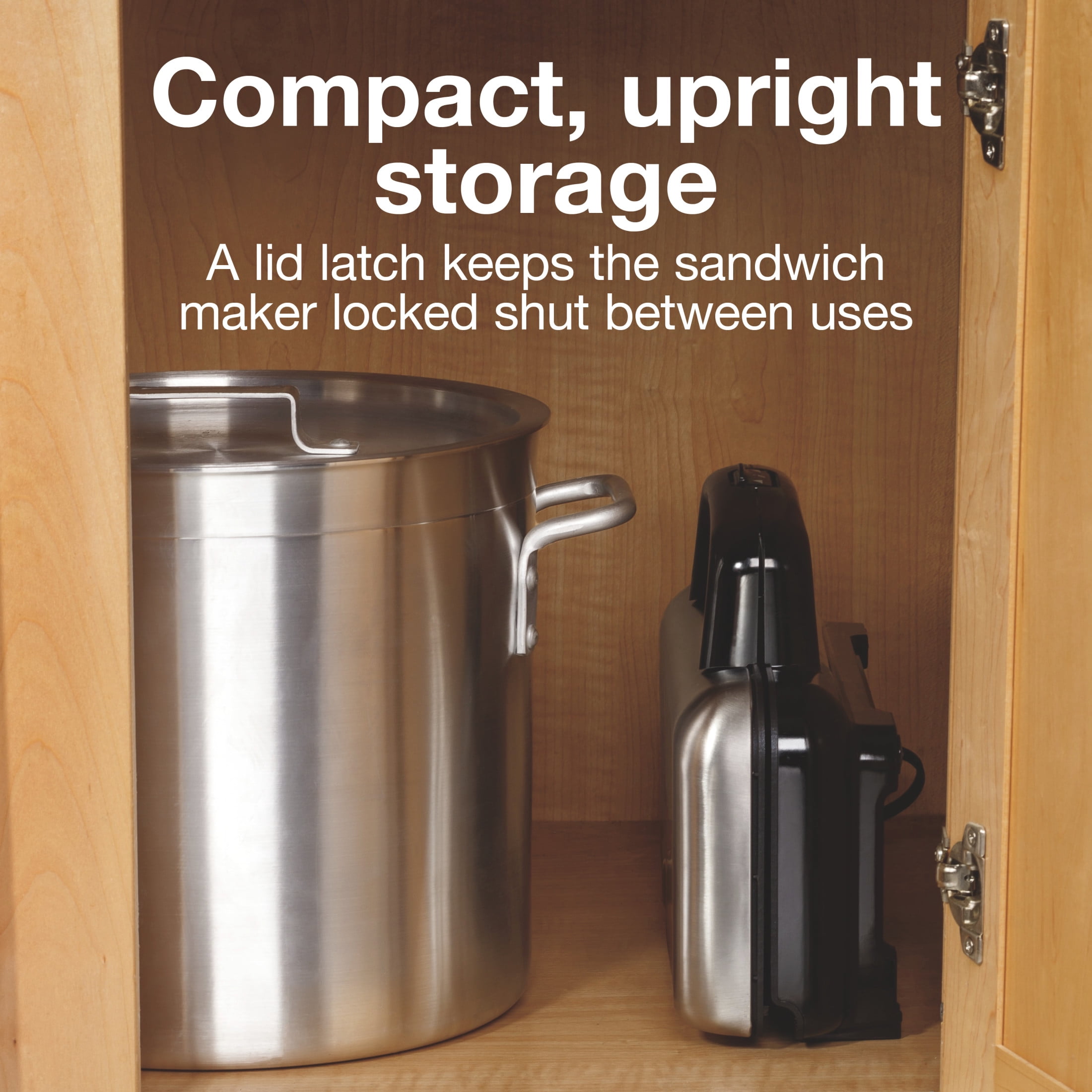 MAKES HOT GRILLED SANDWICHES IN MINUTES: With 700 watts, the grilled sandwich maker easily and quickly makes hot grilled sandwiches of varied thicknesses, from grilled cheese and Reubens to paninis and Mexican tortas in under 5 minutes. EASY TO CLEAN: The durable stainless steel housing and nonstick plates on this hot sandwich maker are simple to clean. Just wipe them down with a damp cloth once they’ve cooled. TOASTS 2 THICK SANDWICHES: The cooking surface accommodates either 2 thick sandwiches or 1 long sandwich. The floating lid evenly presses food, so you can pile sandwiches high and they’ll still cook evenly on both sides. COMPACT, UPRIGHT STORAGE: A lid latch keeps the Proctor Silex sandwich maker shut between uses and makes it easy to store either flat or upright. EASY TO USE: Power and preheat lights let you know when the sandwich maker is on and when it’s time to start cooking.