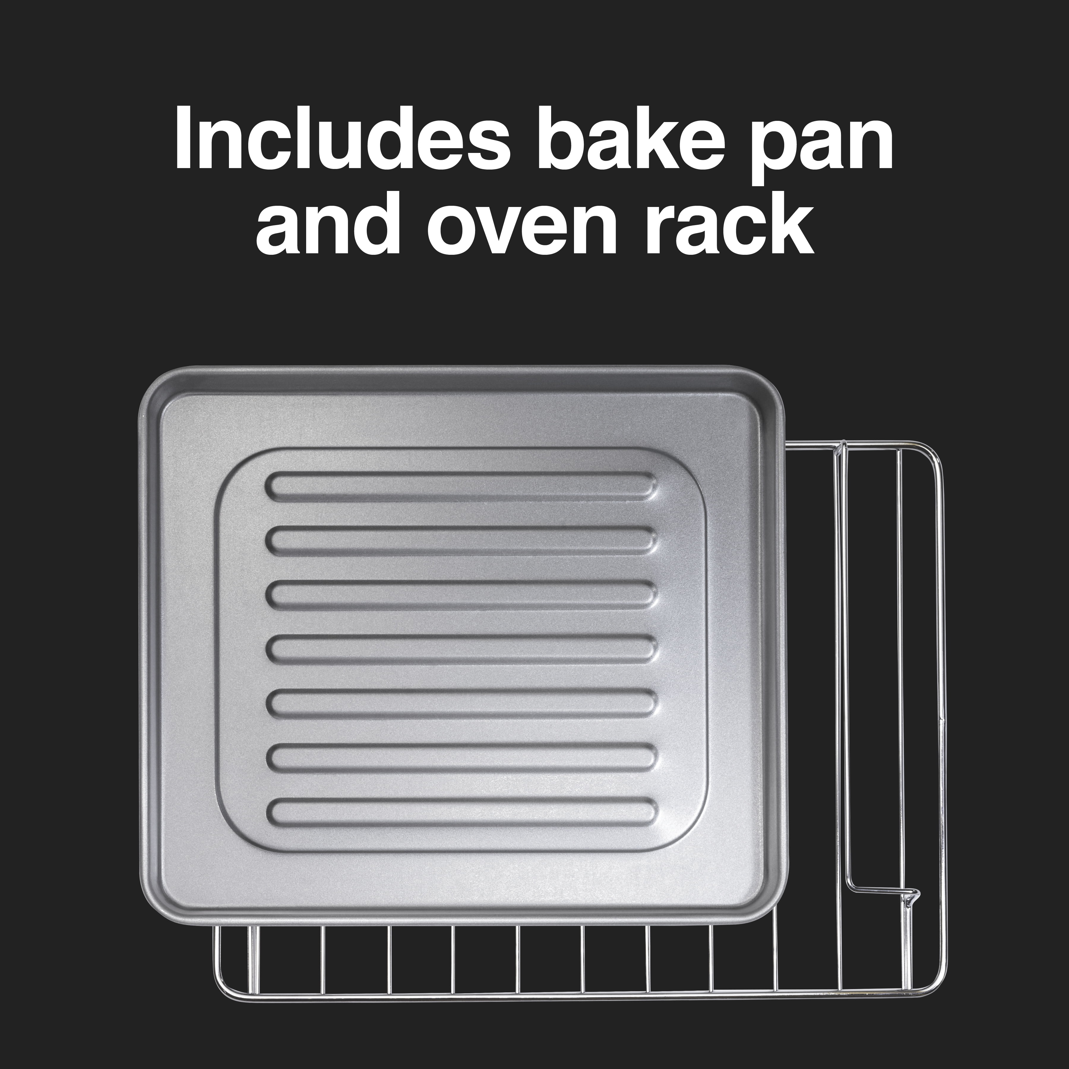 SAVE TIME IN THE KITCHEN: The toaster oven broiler conveniently toasts 4 slices of bread at once — enough for a family — to reduce the time you spend in the kitchen. 3 IN 1 VERSATILITY: The small toaster oven gives you the versatility to cook 3 ways without taking up much space on the countertop. It toasts, broils, and bakes with the Stay On function — great for everyday cooking. Make toast, heat leftovers, and more. EASY-TO-USE MANUAL CONTROLS: This compact toaster oven has simple controls that are straightforward and easy to use. Perfect for anyone who wants a toaster oven that gets the job done without being complicated. Includes a 30 minute timer with ready bell. INCLUDES BAKE PAN & OVEN RACK: The toaster oven comes with a bake pan for toasting and baking, and an oven rack for broiling. EASY TO CLEAN: The built-in crumb tray drops down to easily remove crumbs from the bottom of the toaster oven.