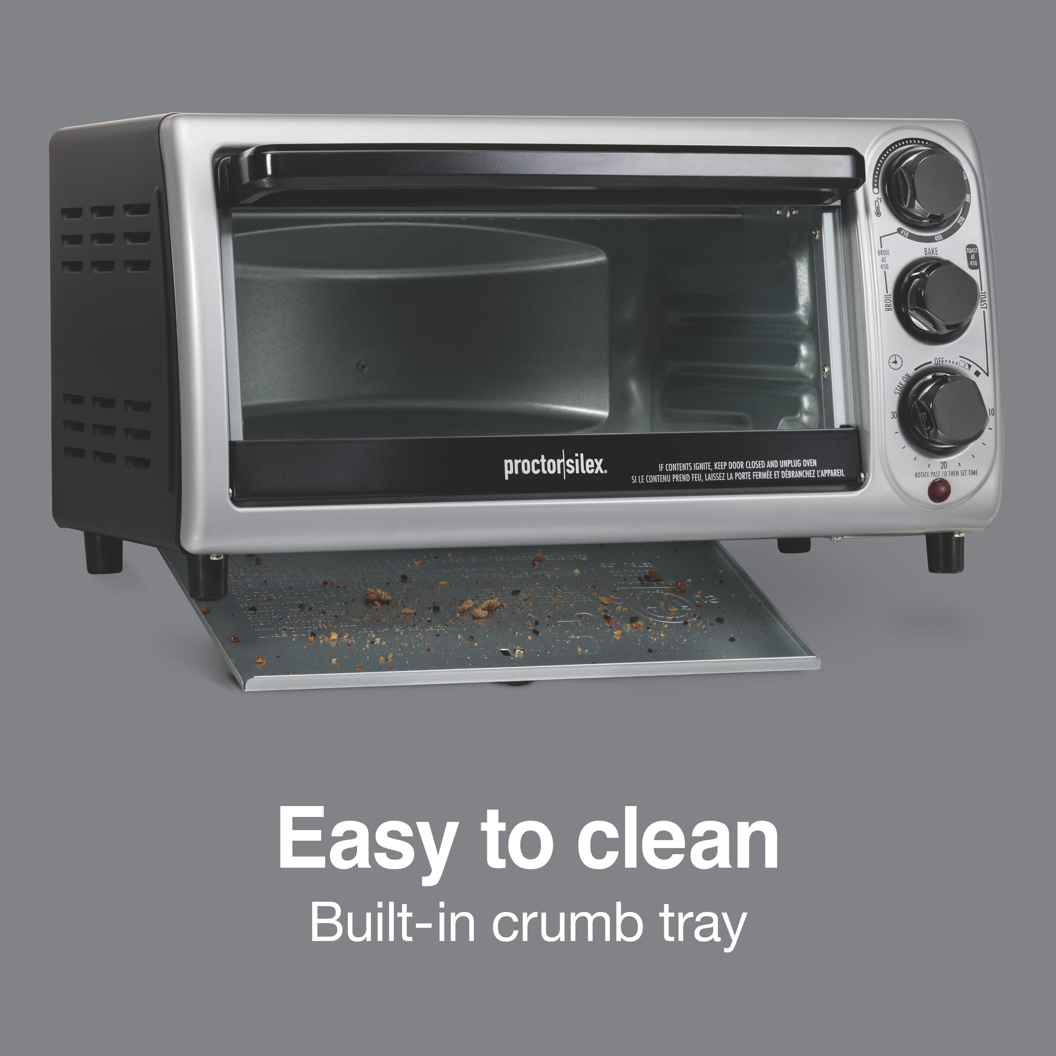 Conveniently toast 4 slices of bread at once to save time in the kitchen with the Proctor Silex® Modern Toaster Oven. It gives you the versatility to cook 3 ways — toast, broil, or bake with the Stay On function, yet it won’t take up much space on your kitchen countertop. It’s perfect for everyday jobs, like making toast, cooking frozen meals, and reheating leftovers, yet can do more, like bake a small batch of brownies or broil chicken breasts for dinner. The toaster oven broiler has simple manual controls that are straightforward and easy to use. It’s great for seniors or anyone who wants a toaster oven that efficiently does the job without being complicated. The toaster oven has a 30 minute timer with auto shutoff and a ready bell that rings when the cooking cycle is complete. A baking pan and oven rack are included, and the built-in crumb tray drops down to easily remove crumbs from the bottom of the toaster oven. Whether you’re cooking a slice of frozen pizza or making a tuna melt, you’ll easily cook a variety of foods in the toaster oven, with temperature options ranging from 150-450° F. Includes 3 year limited warranty.
