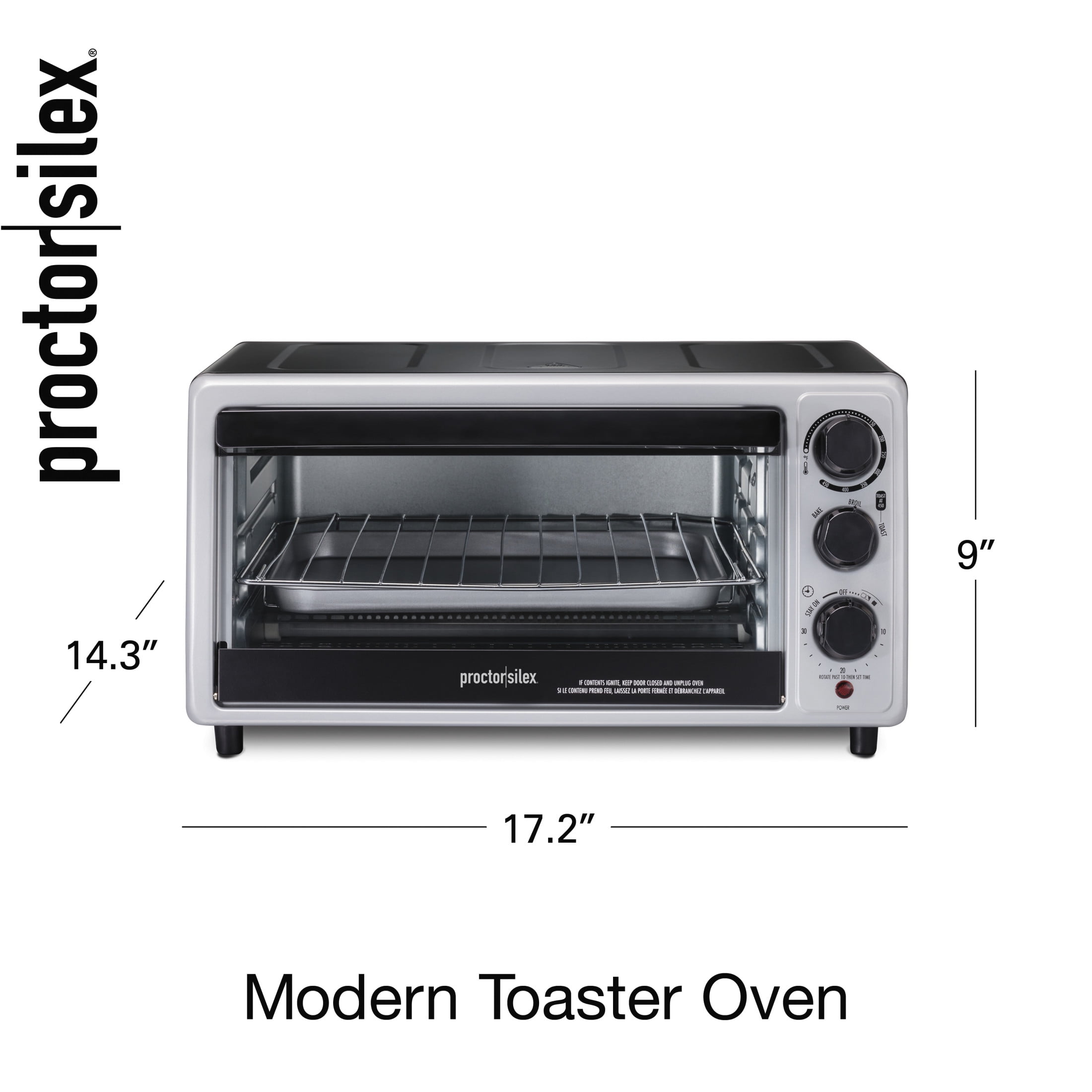Conveniently toast 6 slices of bread at once to save time in the kitchen with the Proctor Silex® Modern Toaster Oven. It’s powerful with 1500 watts and gives you the versatility to cook 3 ways — bake, broil or toast. It’s perfect for everyday jobs like making toast, cooking frozen meals and reheating leftovers yet can do more, like bake a small batch of brownies or broil chicken breasts for dinner. The toaster oven broiler has simple manual controls that are straightforward and easy to use. It’s great for seniors or anyone who wants a toaster oven that efficiently does the job without being complicated. The toaster oven has patented contoured knobs, a 30 minute timer with Stay On function for baking, ready bell and auto shutoff. A baking pan and oven rack are included, and the slideout crumb tray makes cleanup easy. Whether you’re cooking a slice of frozen pizza or making a tuna melt, you’ll easily cook a variety of foods in the toaster oven, with temperature options ranging from 150-450° F. Backed by a 3 year limited warranty.