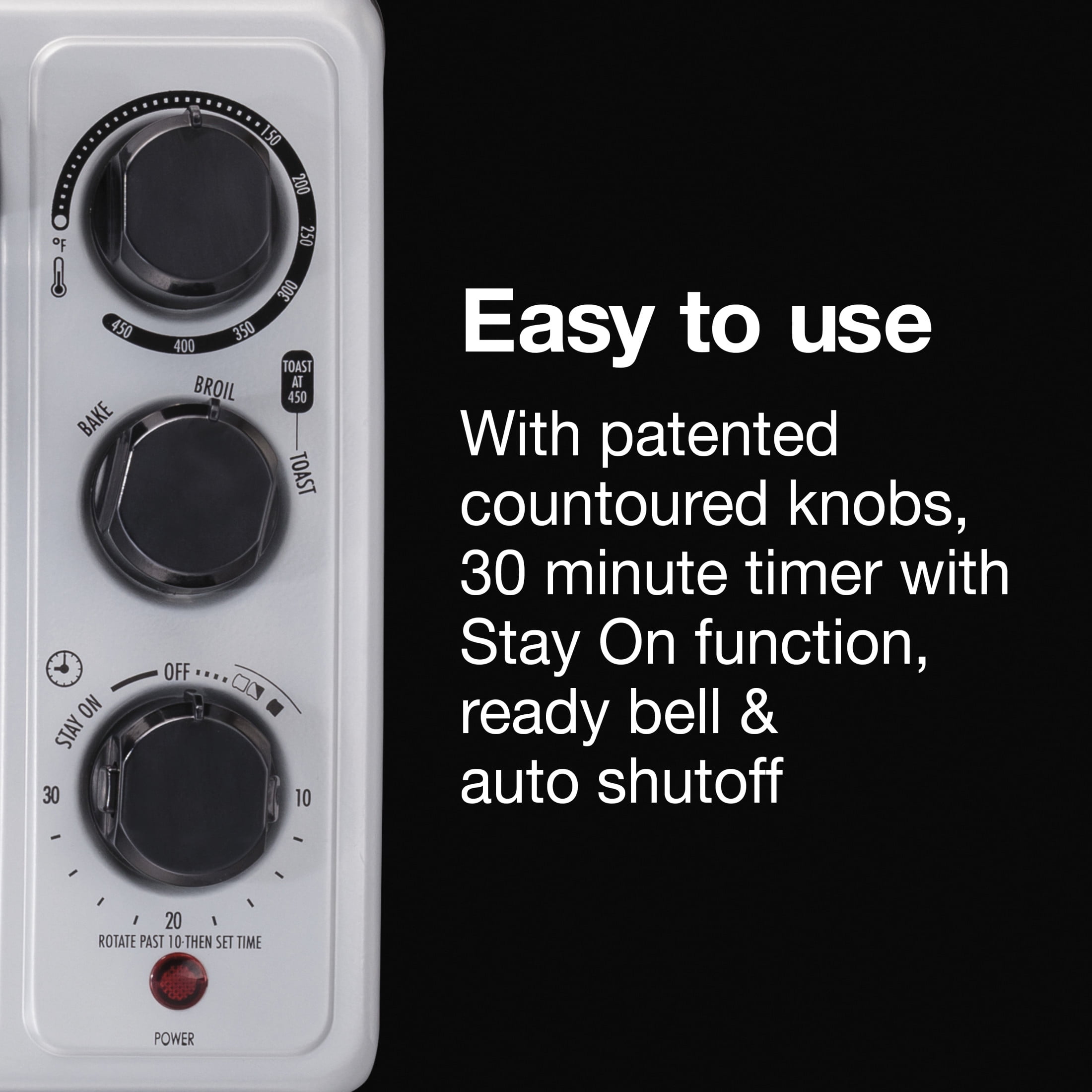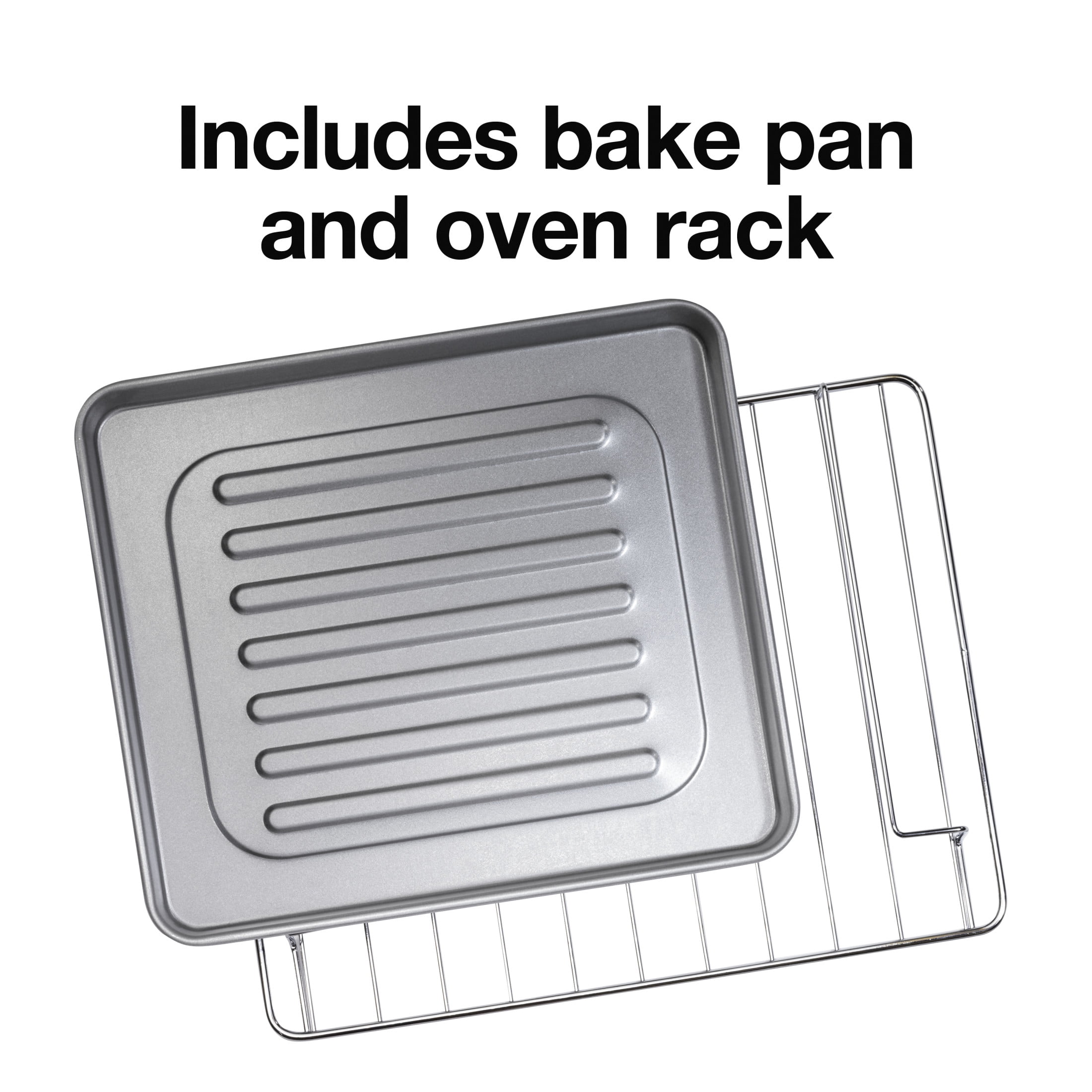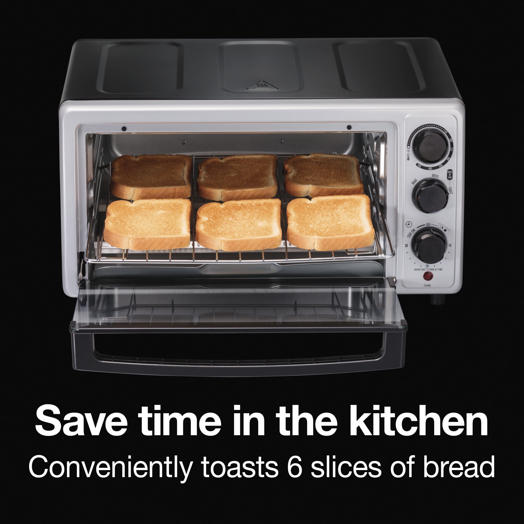 TOAST, BAKE & BROIL SETTINGS. Temperature is adjustable between 150ºF–450ºF. FITS 6 SLICES OF TOAST OR 12” PIZZA. Spacious interior gives you room for cooking everything from snacks to sheet pan suppers. 30-MINUTE TIMER. With ready bell, auto shutoff and optional stay-on setting. EASY-TURN CONTOURED KNOBS. Patented design makes grasping and selecting settings easier than ever. FRONT-ACCESS CRUMB TRAY. Tray slides out from the front of the toaster oven making cleanup simple and quick.