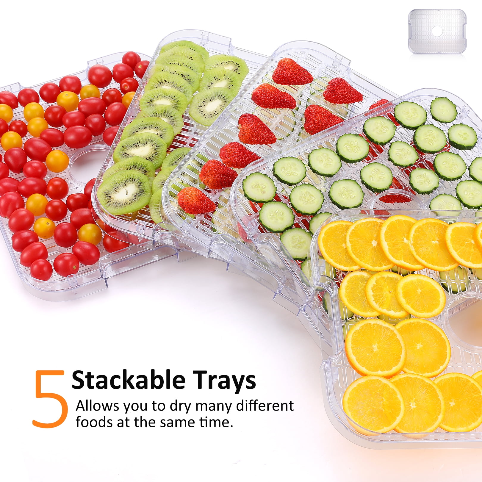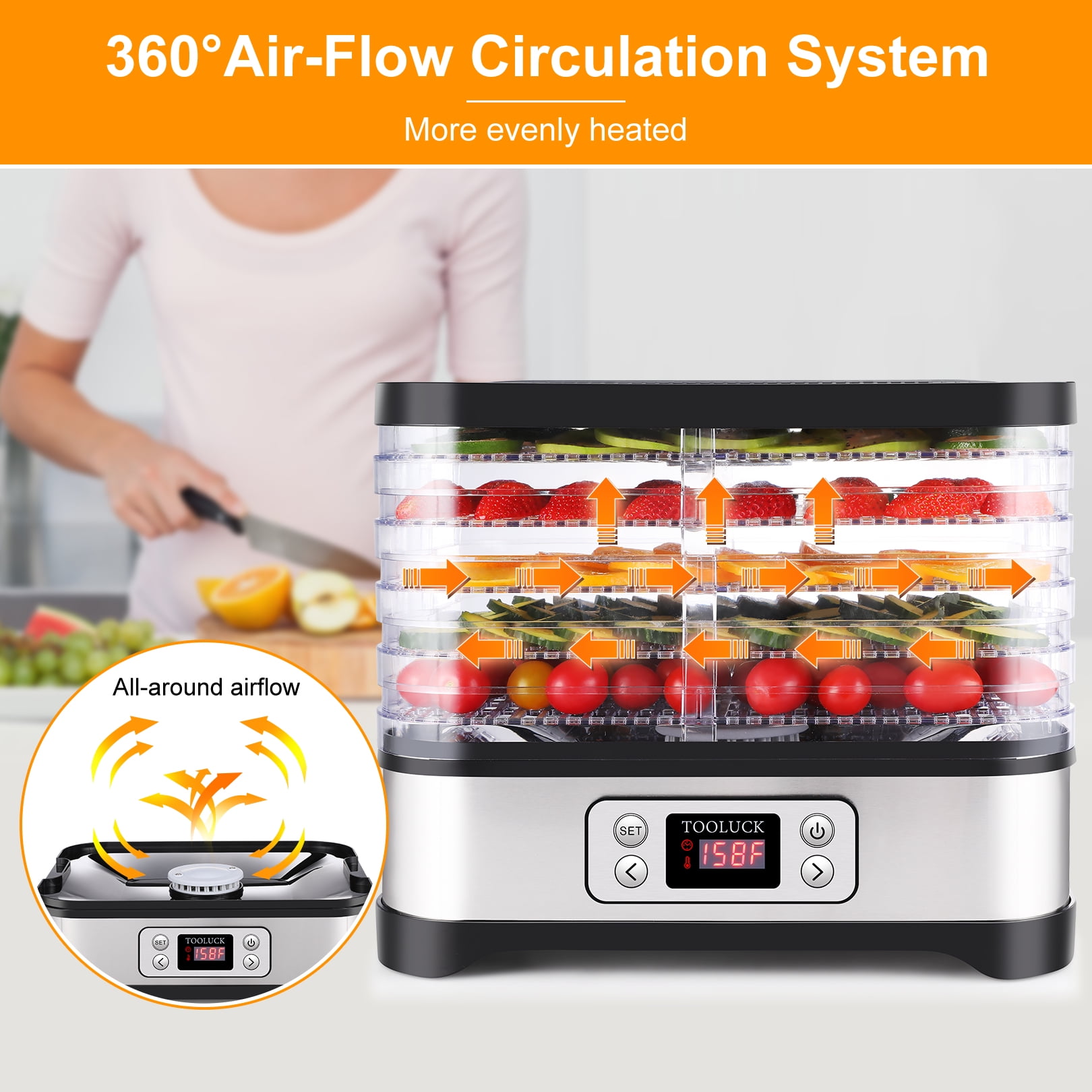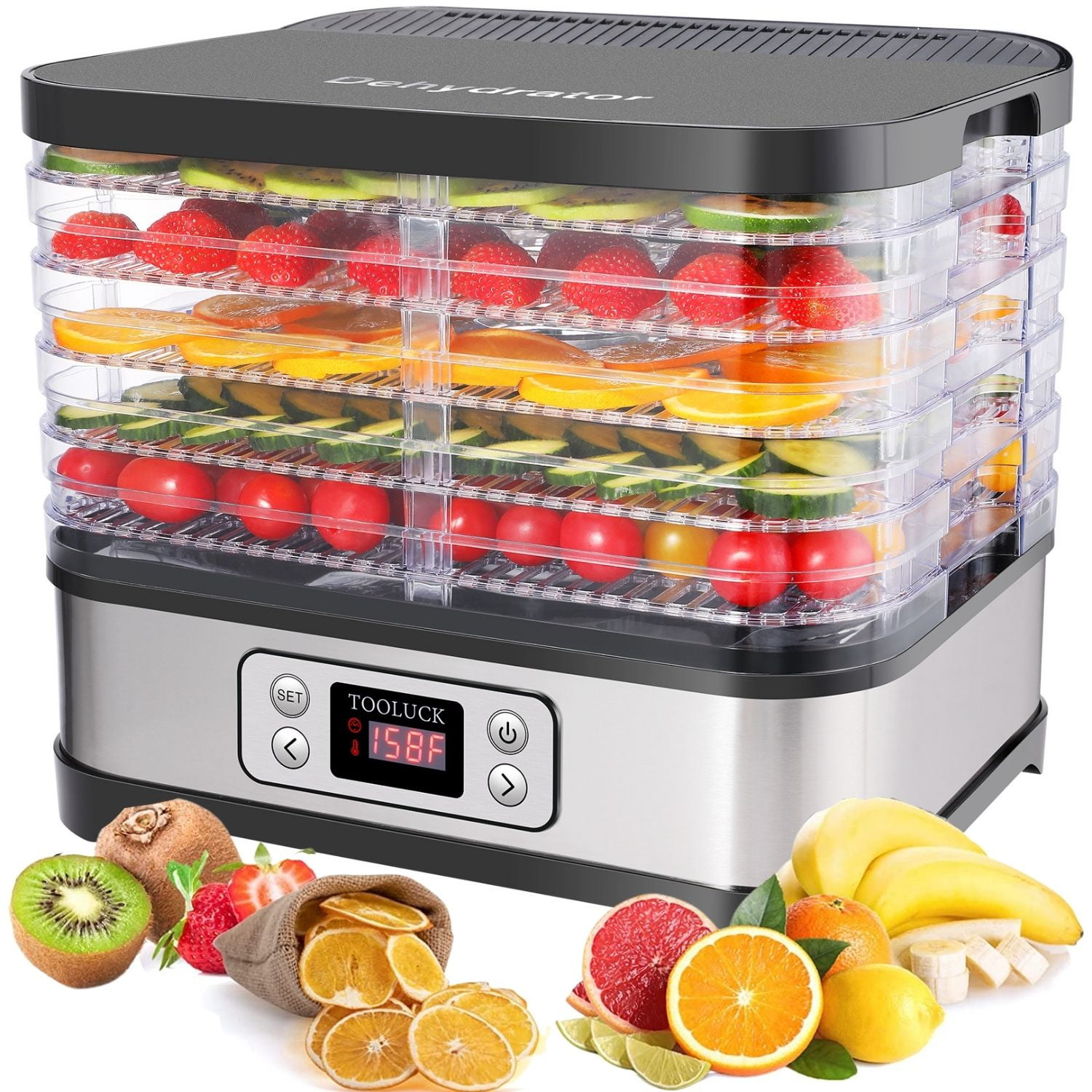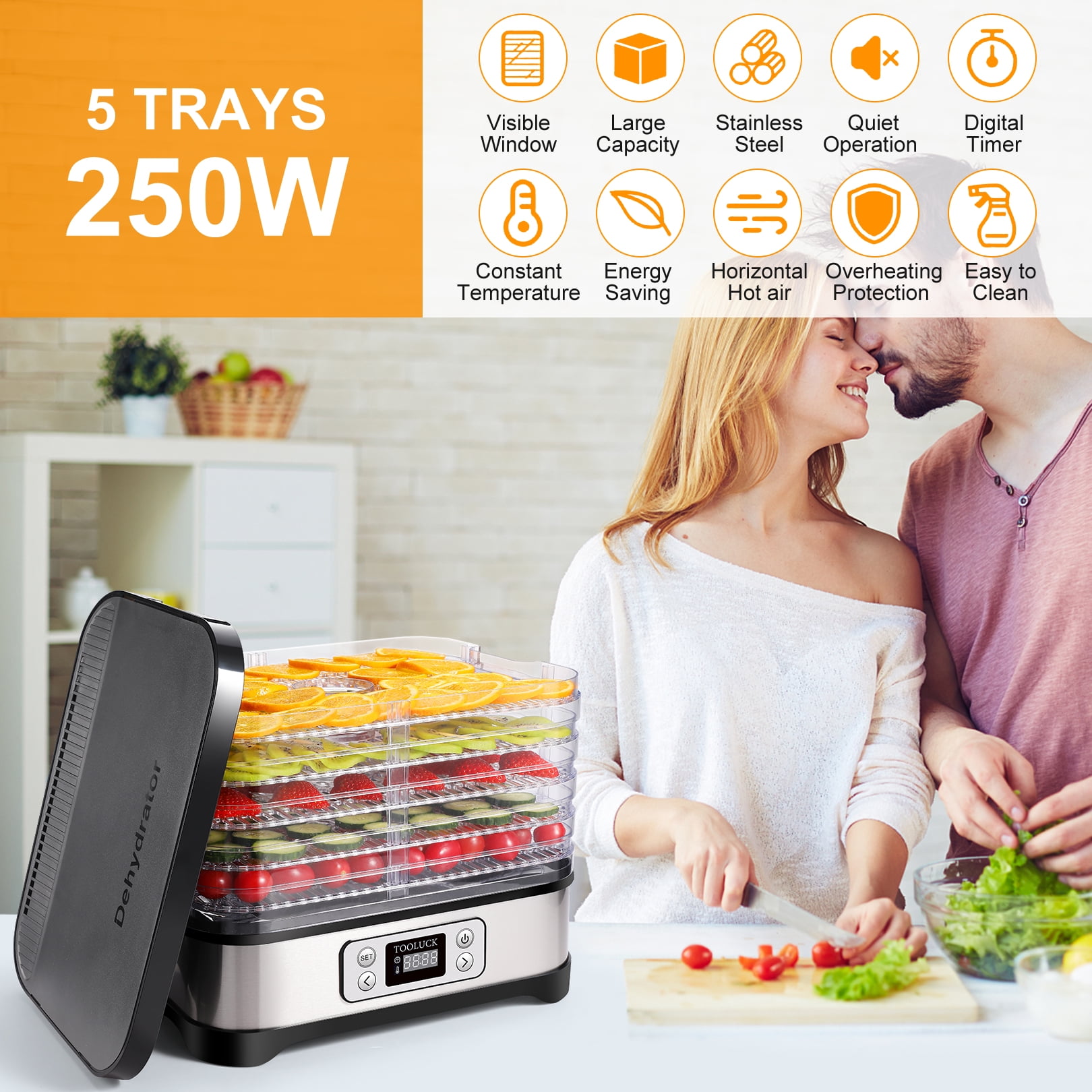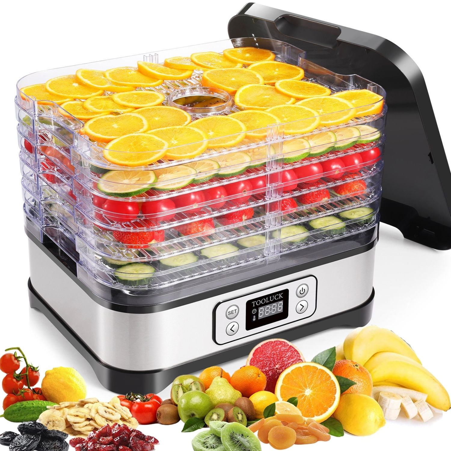 ????Highlights: Adjustable Temperature from 95ºF to 158ºF 72-hour timer with auto shutoff and clear lid so you can easily check food Comes with 5 Trays Expandable in Height. Continuous airflow provides even drying Bottom-mounted Fan with 250 Watts of Drying Power. ????More updated-Food and Fruit Dehydrator ????Powerful Drying Capacity: Tooluck compact food dehydrator is equipped with a drying power of 250W, providing an efficient food drying process. It can remove excess water from food without affecting its natural juice, taste and nutrition-the retention rate of vitamins and minerals is as high as 97%. ????Adjustable Temperature and Timer: The temperature of the food dehydrator can be adjusted between 95°F-158°F (35-70°C) and is equipped with a 1-72H timer. You can choose the best time and temperature according to the food, make delicious food, retain more nutrients, and it will automatically shut down after the work is completed. ????5 Food Grade Trays: The food and dried meat dehydrator are equipped with 5 BPA-free trays, which can be stacked together to save space. It can dry all kinds of food at the same time, enough to hold a large part of the food, achieve uniform drying, save space, and provide you with great convenience. ????Easy to Use: The jerky dehydrator is simple to use and set up, with an LED display that clearly displays the temperature and time you set, and at the same time tells you the remaining working time during work. The perspective window allows you to monitor the progress of the dehydrator. The 360°circulating airflow dissipates heat evenly and efficiently, and the noise is not large during work. The sound is less than 48dB, which is equal to the noise level recorded in the library. ????Easy to Store and Clean: The dehydrator is detachable, and the tray can be placed in the dishwasher for easy cleaning and storage; suitable for drying fruits, vegetables, meat, scented tea, nuts, mushrooms, beef jerky, and other home-cooked foods; can also be used for Make snacks for your pet. If you have any questions about the product, please contact us, and we will reply to you as soon as possible. ????Specifications: Color: Black Material: Stainless Steel, Plastic Rated Voltage: 120V Rated Frequency: 60Hz Rated Power: 250W Size: 32 x 25 x 20 cm/ 12.6 x 9.8 x 7.9 inches Features: With 5 Stackable Trays