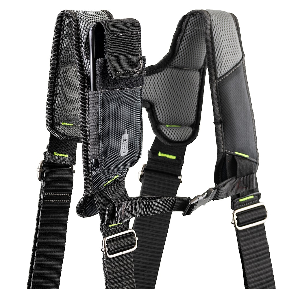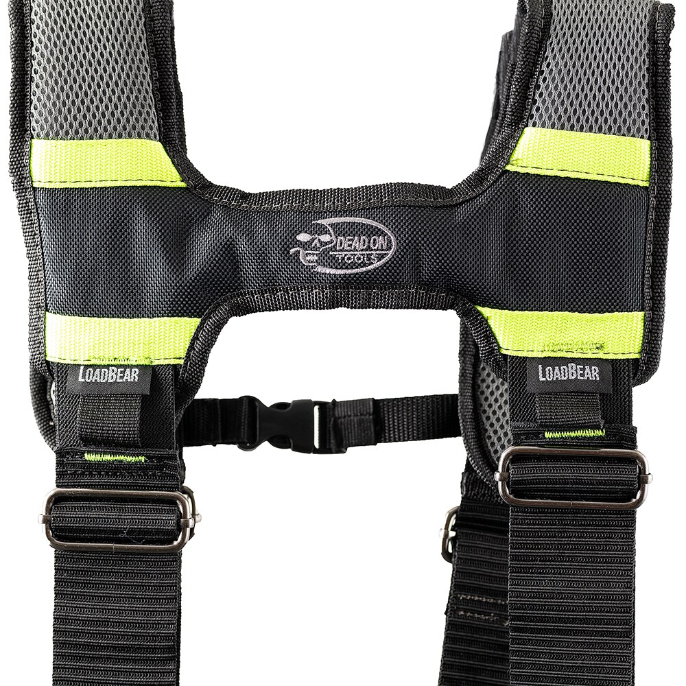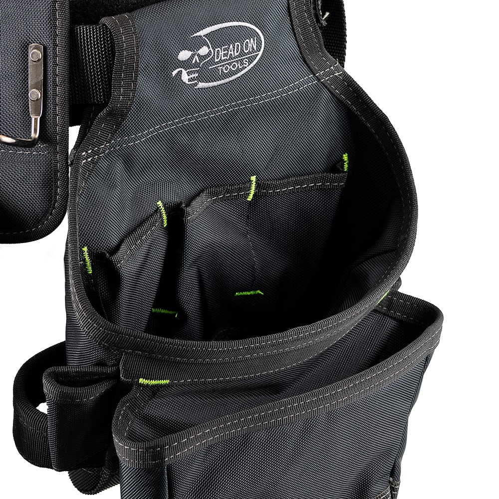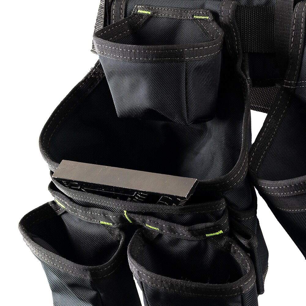 Made from an industry leading 2-ply, 1680 denier heavyweight poly fabric for lasting durability. Pouches and suspenders can be removed or adjusted for customized tool organization. Barrel-bottom, reinforced pouches allow extra carrying capacity. Tool bag set features one steel hammer holder and an additional loop for and an additional loop for hammers or other long-handled tools, cats-paw sleeves and a tape measure clip. Infinity belt can be adjusted up to a 52” waist using thick steel grommets. LoadBear®stretch suspension technology allows the weight of the tool belt to move comfortably with your body while at work. Suspenders have moisture-wicking padding and feature a cell phone pocket that fits most smart phones.