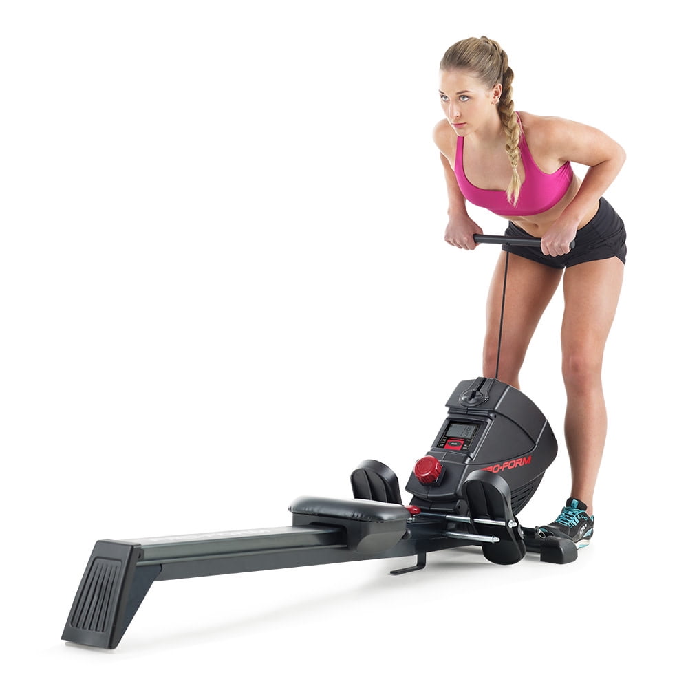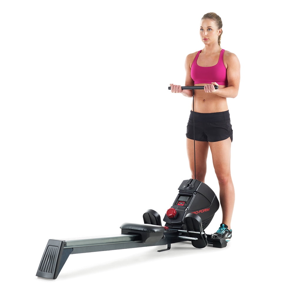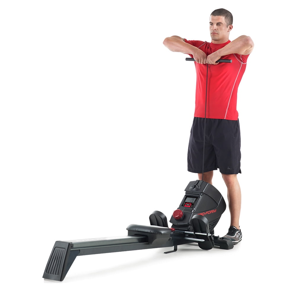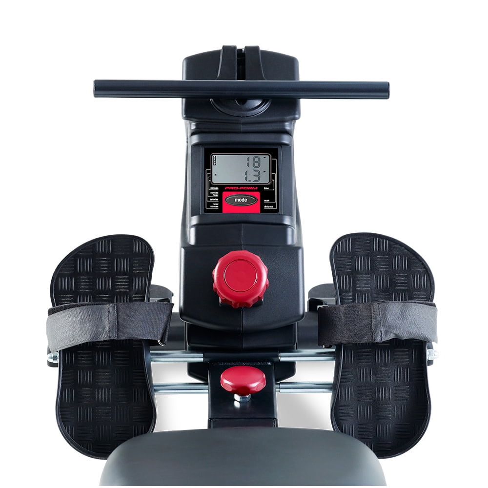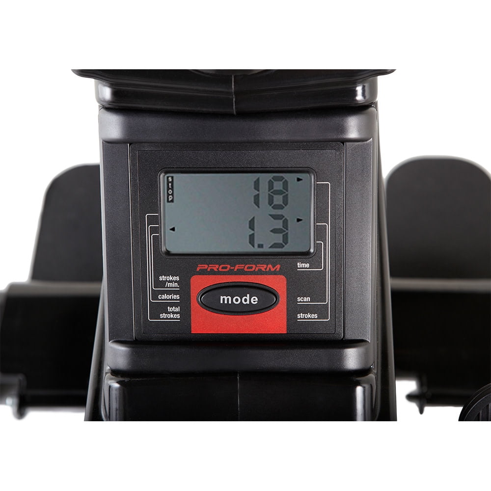 Get a full-body workout with the ProForm 440R rowing machine. Rowing provides a versatile, comprehensive workout experience – strengthening upper and lower body muscle groups while burning a high amount of calories and enhancing cardiovascular health. Perfect for strength training, cardio, and weight-loss focused exercise routines, the 440R is a valuable addition to any home gym. Effortlessly choose between 8 levels of resistance with the simple push of a button, making it easy to customize every workout to your preferences. Pivoting pedals with adjustable foot straps offer a snug fit for any foot, and a Soft Touch ergonomic handle protects your grip and allows for a comfortable training experience. Enjoy the versatility of an adjustable molded seat that glides along an oversized aluminum rail that provides an enjoyable ride for users of most heights. A large LCD monitor, mounted directly on the face of your machine, allows you to keep an eye on your workout stats as you train. When your workout is finished, utilize an innovative SpaceSaver design to fold your rower into itself for compact vertical storage.