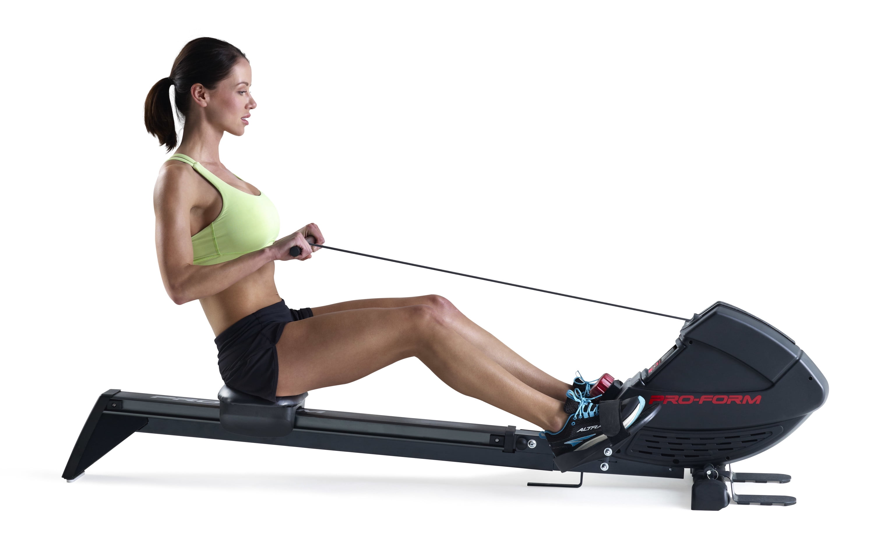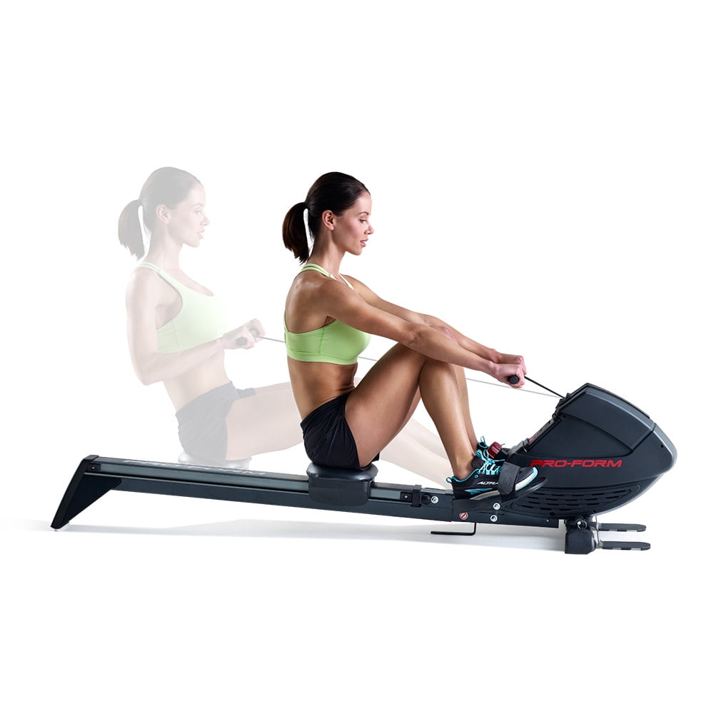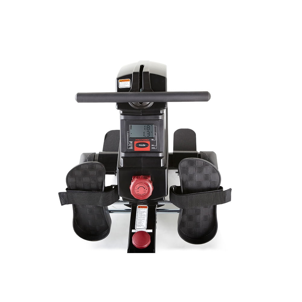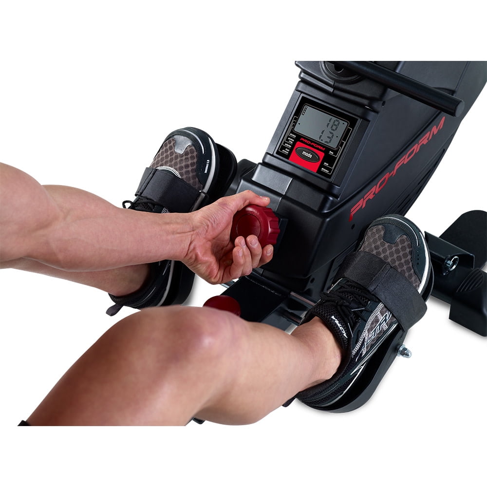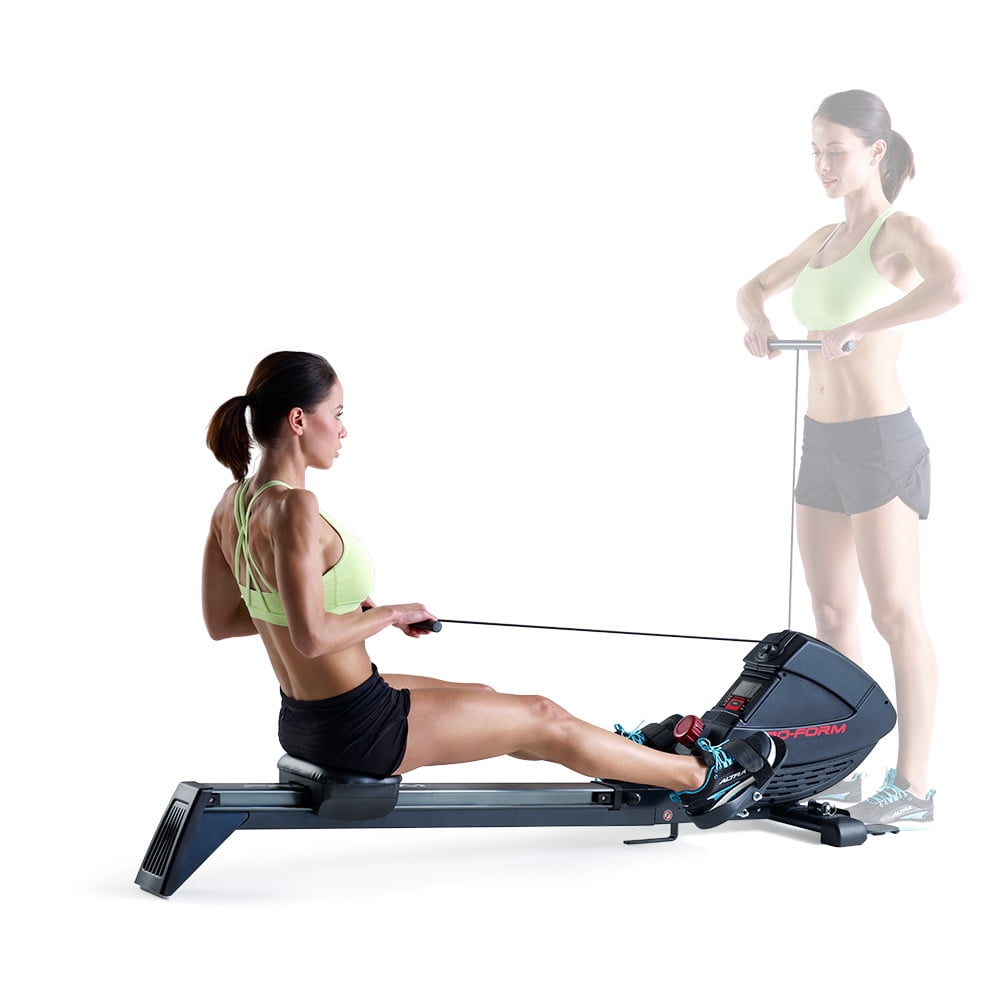 Get a full-body workout with the ProForm 440R rowing machine. Rowing provides a versatile, comprehensive workout experience – strengthening upper and lower body muscle groups while burning a high amount of calories and enhancing cardiovascular health. Perfect for strength training, cardio, and weight-loss focused exercise routines, the 440R is a valuable addition to any home gym. Effortlessly choose between 8 levels of resistance with the simple push of a button, making it easy to customize every workout to your preferences. Pivoting pedals with adjustable foot straps offer a snug fit for any foot, and a Soft Touch ergonomic handle protects your grip and allows for a comfortable training experience. Enjoy the versatility of an adjustable molded seat that glides along an oversized aluminum rail that provides an enjoyable ride for users of most heights. A large LCD monitor, mounted directly on the face of your machine, allows you to keep an eye on your workout stats as you train. When your workout is finished, utilize an innovative SpaceSaver design to fold your rower into itself for compact vertical storage.