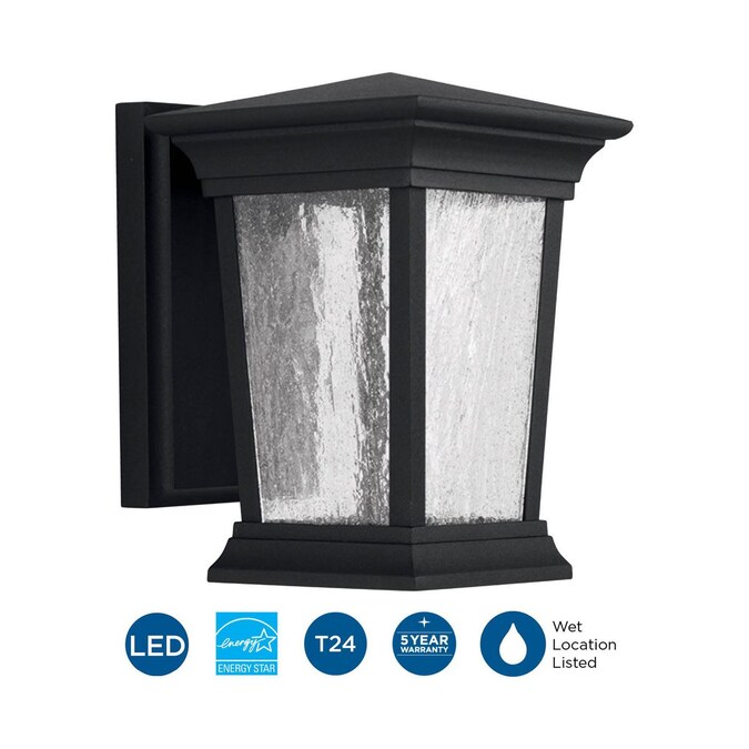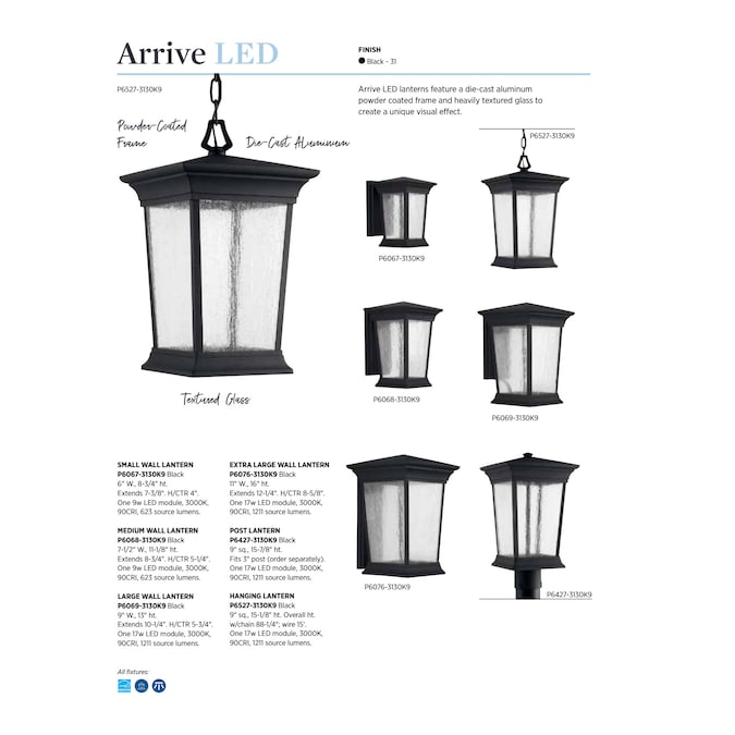 Arrive LED lanterns feature a die-cast aluminum, powder coated frame and heavily textured glass. One-light small wall lantern. 90+ CRI, 3000K, 623 lumens. Energy Star.