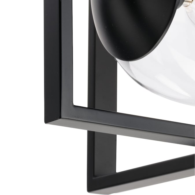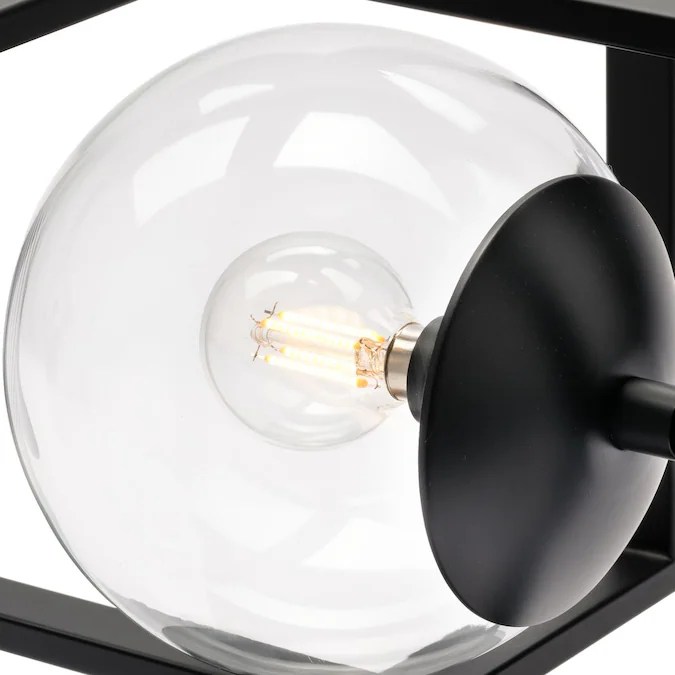 - The clear globe shade softens and contrasts with the frame’s sharp corners