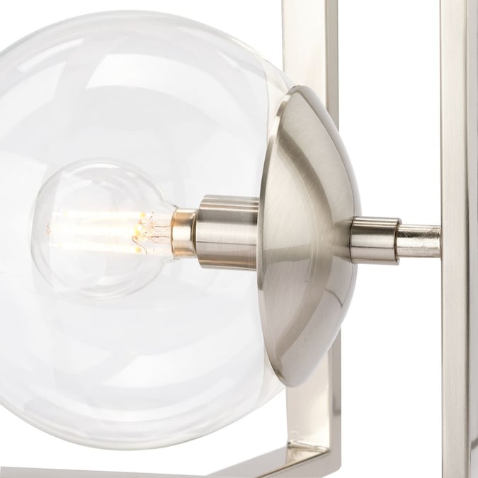 - The clear globe shade softens and contrasts with the frame’s sharp corners