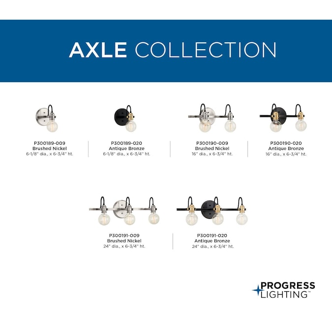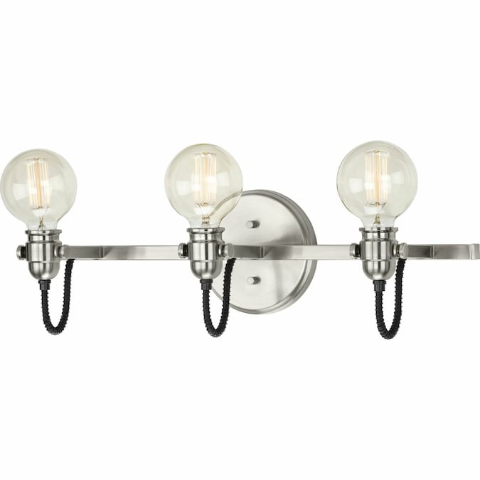 Mix old and new for charming character with the Axle Collection 3-Light Brushed Nickel Vintage Bath Vanity Light. The round backplate and vintage light bases are coated in a beautiful brushed nickel finish. The working gooseneck arms provide customizable tilt adjustment. For ideal illumination, use 3 medium base bulbs that are sold separately (60w max – LED/CFL/incandescent). We recommend using vintage bulbs to enhance the wall light’s timeless industrial aesthetic. The bath light is compatible with dimmable bulbs. The bath light’s vintage design is ideal for any entryway, hallway, foyer bedroom, sitting room, living room, or bathroom in farmhouse, urban industrial, and vintage electric style settings. It’s time to breathe new life into the mundane every day with timeless and truly transformative lighting. Make your purchase today to begin your journey to a whole new lighting experience. Progress Lighting products are designed for exceptional quality, reliability, and functionality.