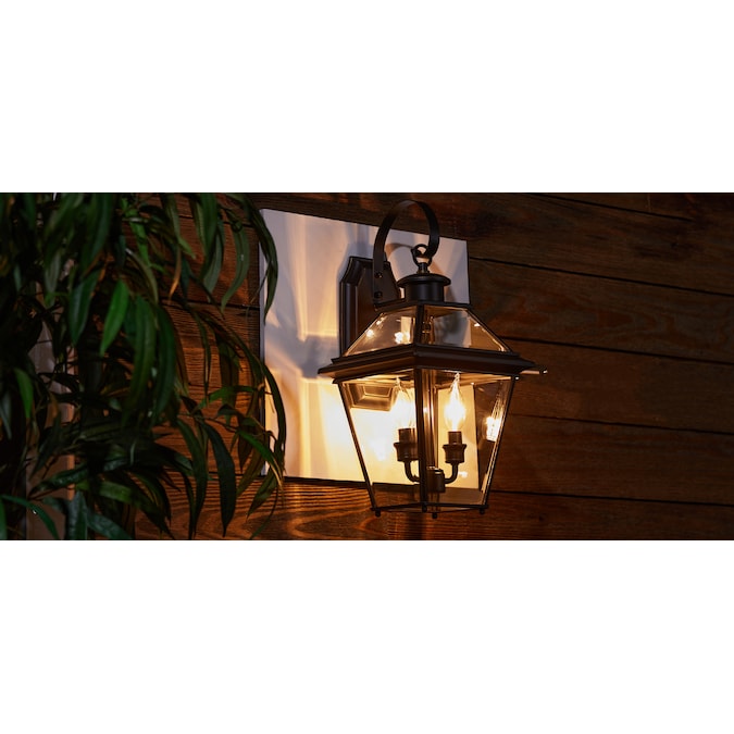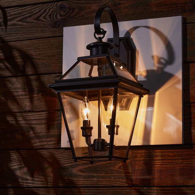 The two-light wall lantern from the Burlington outdoor collection is constructed from aluminum for durable, weather-resistant performance. An antique bronze finish complements the clear beveled glass. Open bottom design allows individuals to replace lamps without removing any glass shade.