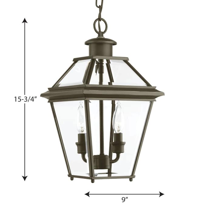The two-light hanging lantern from the Burlington outdoor collection is constructed from aluminum for durable, weather-resistant performance. An antique bronze finish complements the clear beveled glass. Open bottom design allows individuals to replace lamps without removing any glass shade.