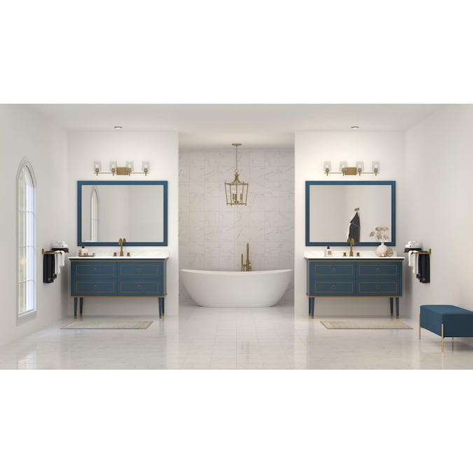 - Clear glass shades provide a contemporary take on a traditional bath design