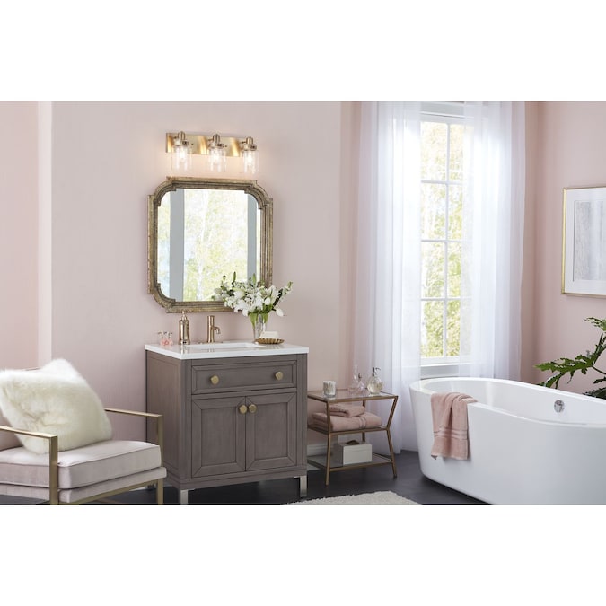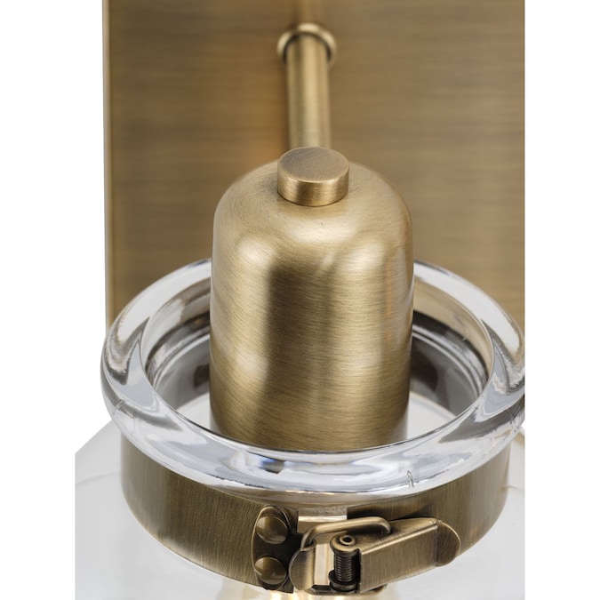 The Calhoun Collection offers an apothecary style bath light that features thick glass shades with a handmade appearance held in place by mechanical latches reminiscent of antique spice jars. A rectangular backplate and polished arms are coated in a golden vintage brass finish. Use a vintage or clear light bulb for a variety of looks. Compatible with dimmable bulbs (not included). Features a steel construction and is damp location rated for long-lasting use. Includes mounting hardware for quick and simple installation. Create different looks by mounting the light fixture up or down.