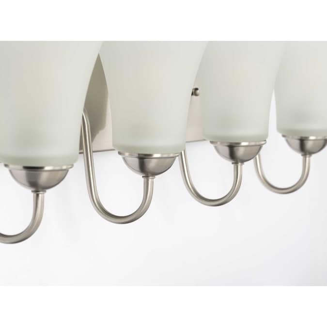 Dismiss shadows with an alluring design of the classic four-light bath. Charming, bell-shaped, etched glass shades and clean, curved arms add subtle character showcased against a curved, brush nickel backplate. The classy fixture makes a divine addition to bathroom mirrors and dining room or other living areas in transitional interiors.