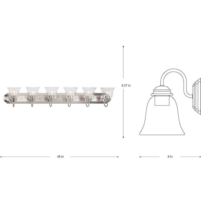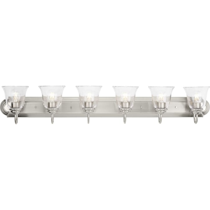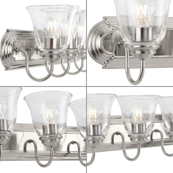 For transitional bathroom or vanity settings that seeks illumination, look no further than this clear glass vanity light collection. It features an updated transitional design finished in Brushed Nickel complemented by clear glass flared shades that offer classic appeal. An extended backplate with scalloped edges provides generous coverage for easy installation This versatile fixture can be mounted with glass facing up or down to provide the perfect amount of even illumination.