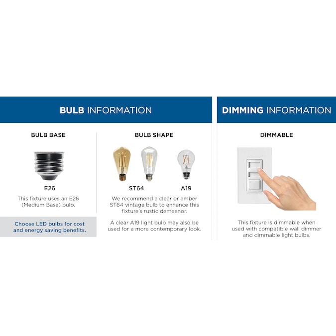- Uses 1 medium base bulb that is sold separately (100 W max – LED/CFL/incandescent); compatible with dimmable bulbs