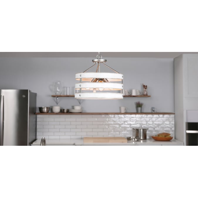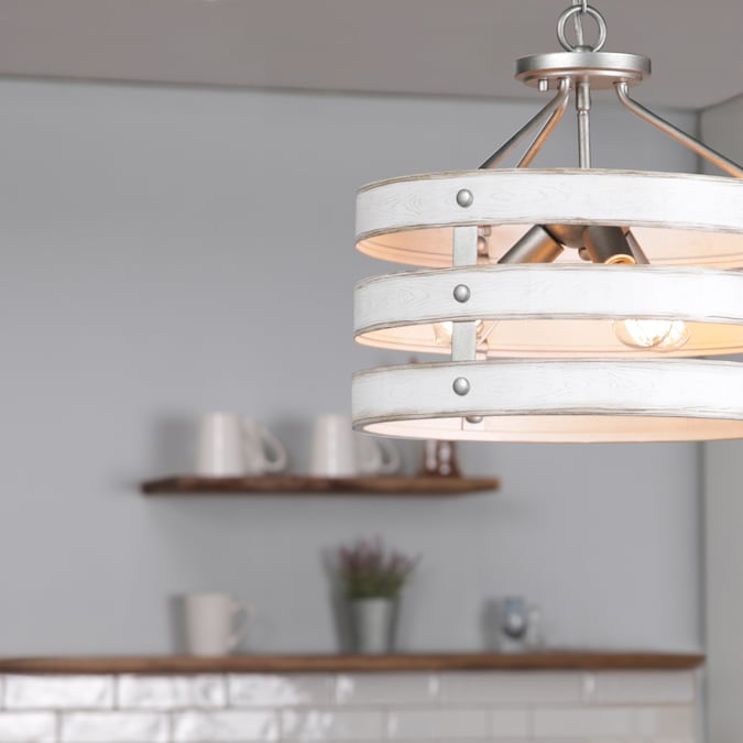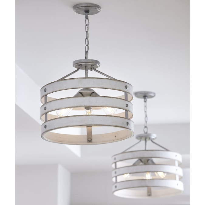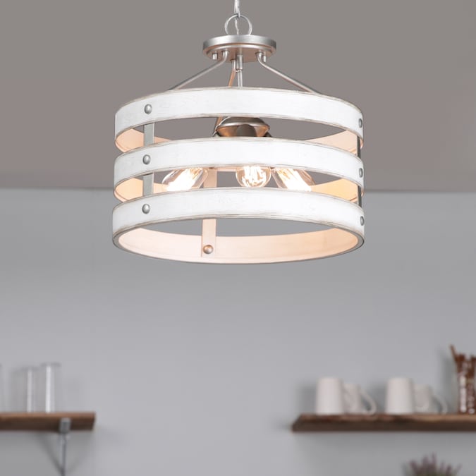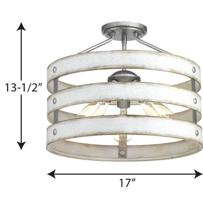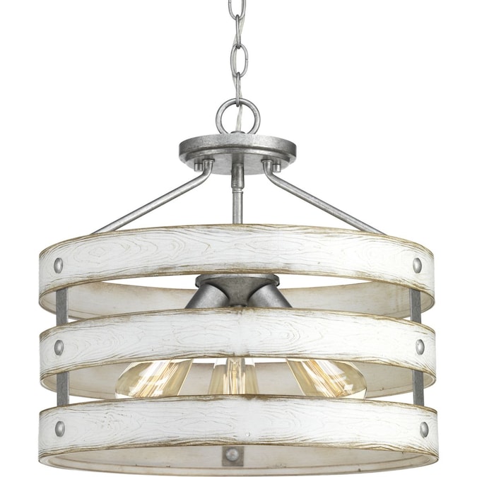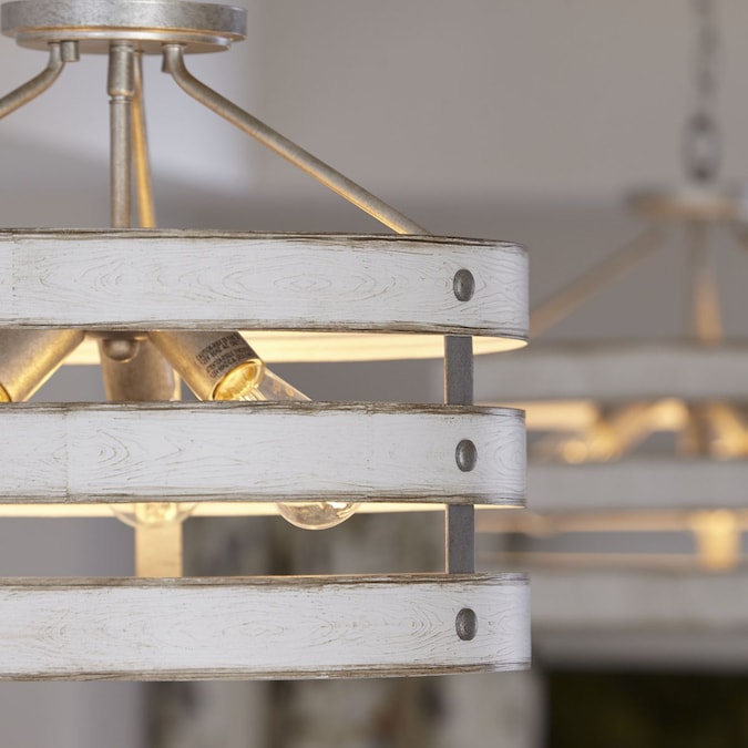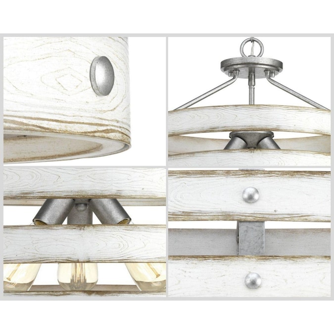 - Three circular antique white embossed wood grain bands create an open-cage design