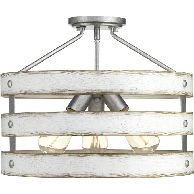 Three circular bands wrap together to create an open design for Gulliver. Dual toned frame color combinations of galvanized with antique white accents. A hand painted wood grained texture complements rustic and modern farmhouse home decor, as well as urban industrial and coastal interior settings.