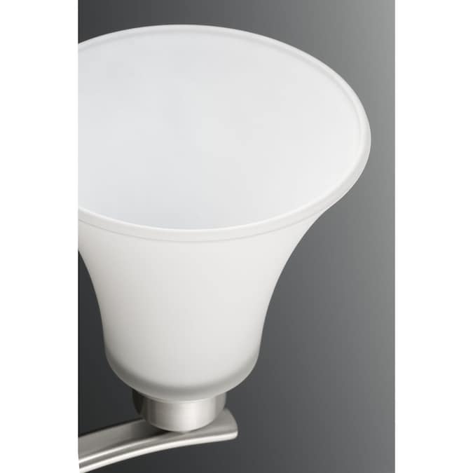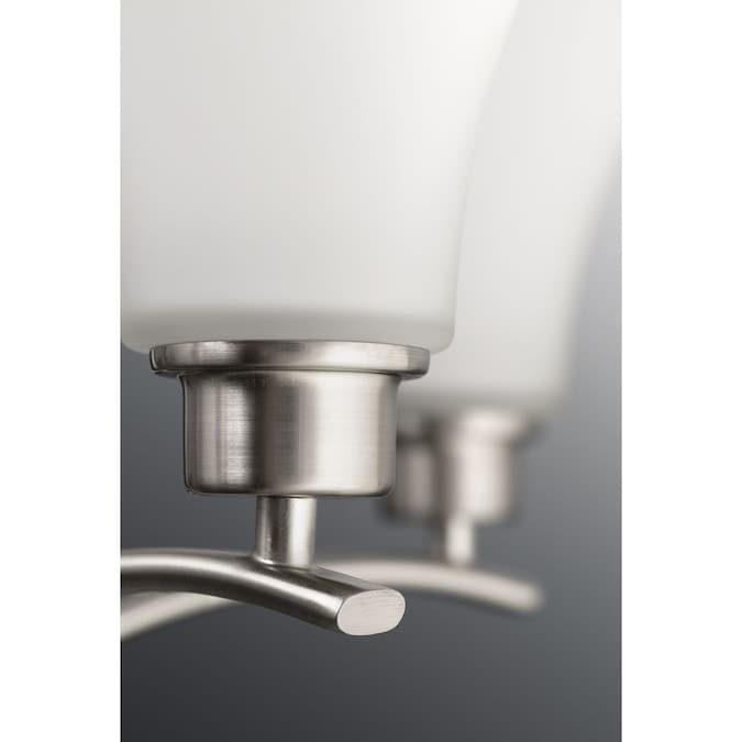 Gleeful simplicity defines the Joy Collection. Refreshing and fashionable, arcing forms of metal and fluted glass shades are enhanced by a classic Brushed Nickel finish. Four white etched glass complete the look and allows you to coordinate well with other fixtures from this collection. Bring joy into your heart and into your home with this wonderful four-light bath fixture.
