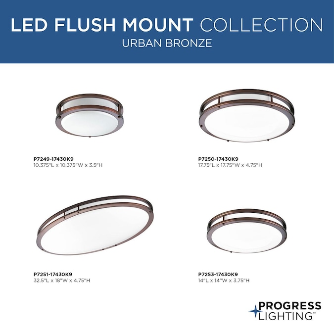 One-Light Urban Bronze LED close-to-ceiling. Surface mount round with clean modern lines and white acrylic diffuser. DC LED light engine with 1765 delivered lumens at 3000K and 90+ CRI.