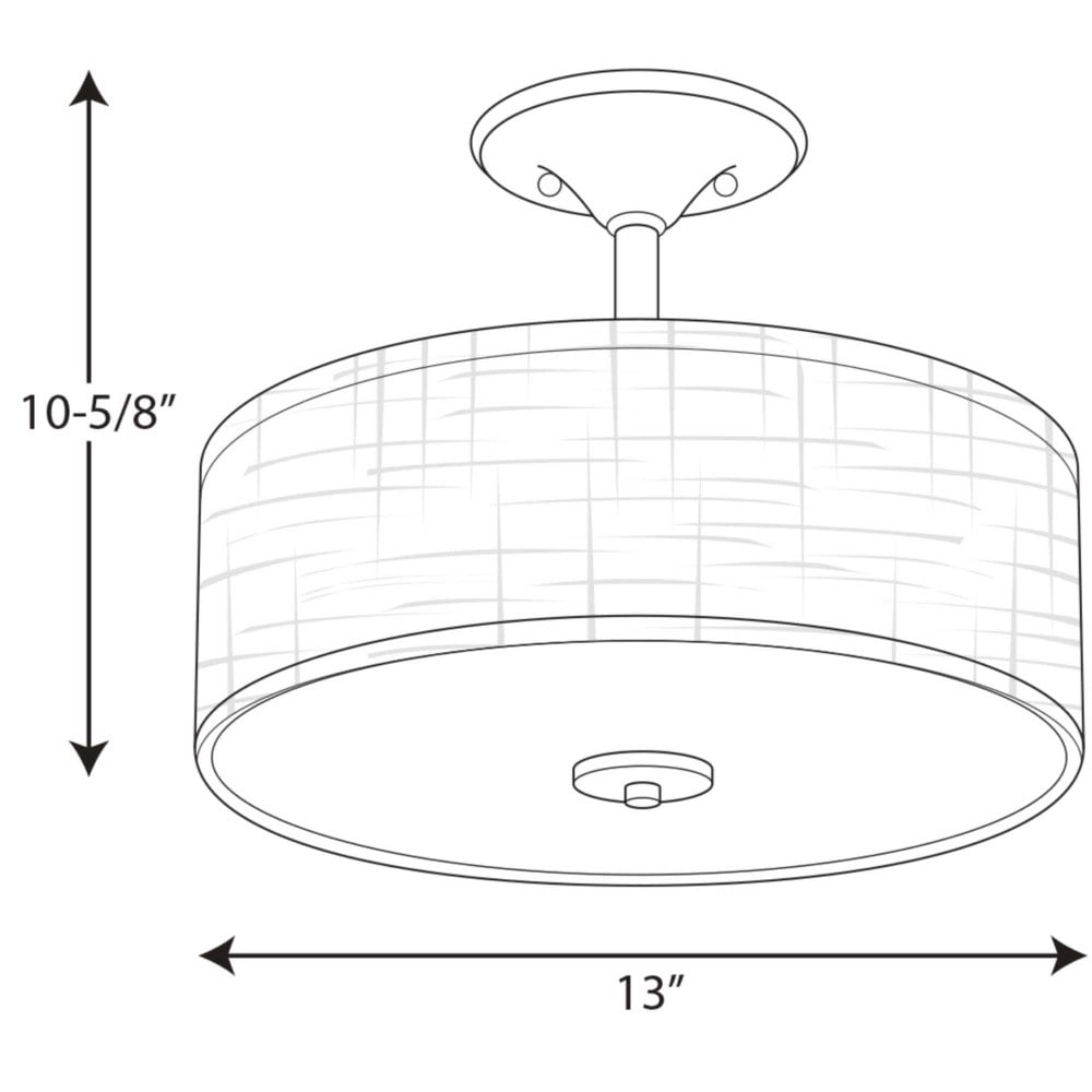 Brushed Nickel finish Etched glass diffuser provides softened illumination Off-White Linen shades Meets California title 24 – Ja8 – 2016 Inspire Collection One-Light 13″ LED Semi-Flush Mount