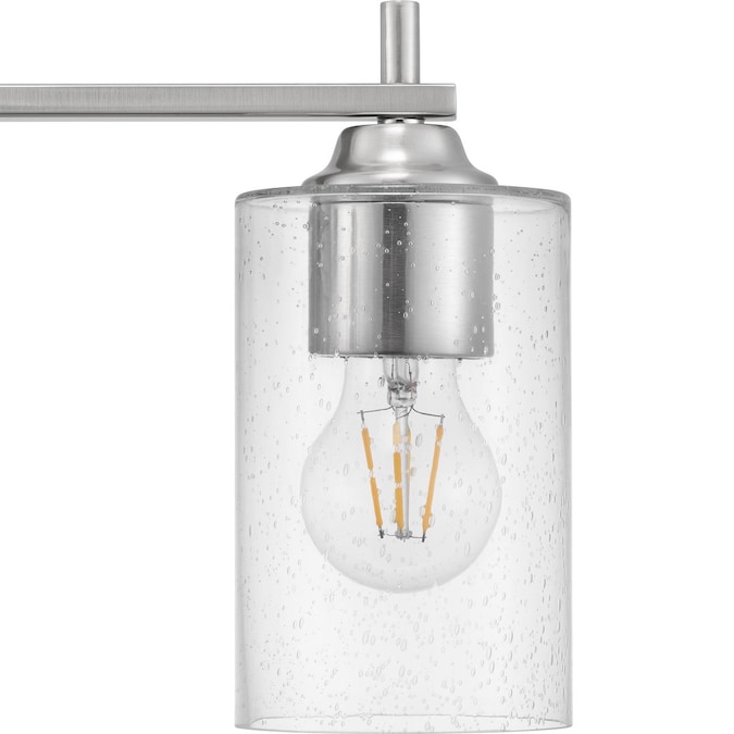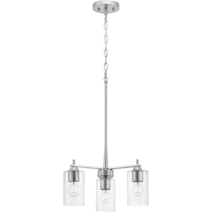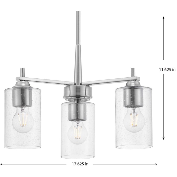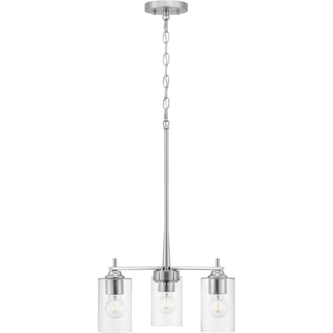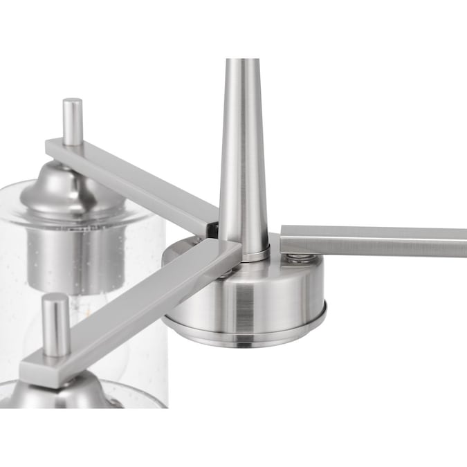 Contemporary lines fuse with traditional seeded glass shades, giving Morehouse a transitional appeal that works with many decor styles. A slimmed down center column and three linear arms are anchored by metal cups holding seeded glass shades directed down. A brushed nickel finish adds a timeless touch.