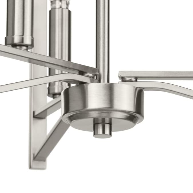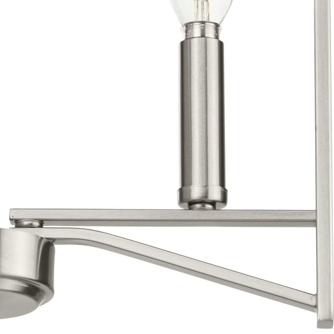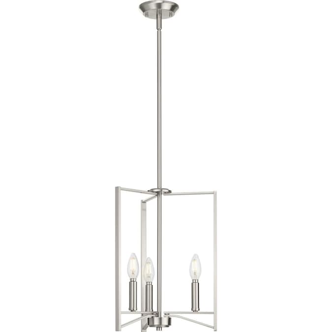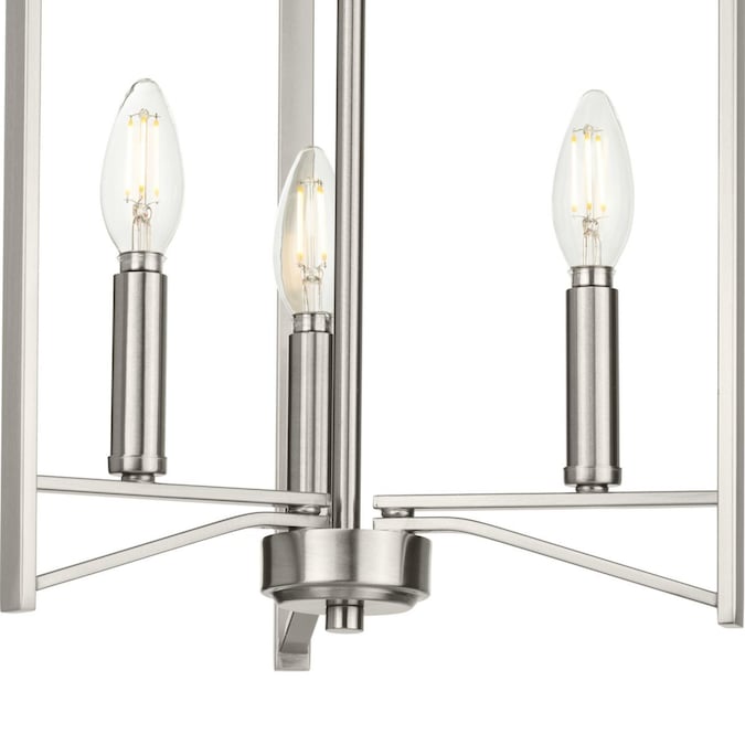 Celebrate geometric interplay with the Roxobel Collection. A trio of rectangular forms create a contemporary silhouette finished in subtle brushed nickel. Three candelabra bases sit within the open cage design heightening the modern style of the fixture and delivering bright ambient illumination to dining rooms in modern spaces.