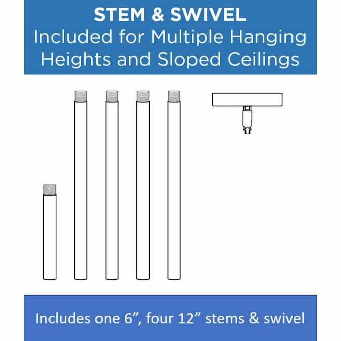 - Measures 16-in height x 13.25-in width x 73-in installed length (adjustable); includes one 6-in, four 12-in stems and swivel; includes installation instructions, mounting hardware