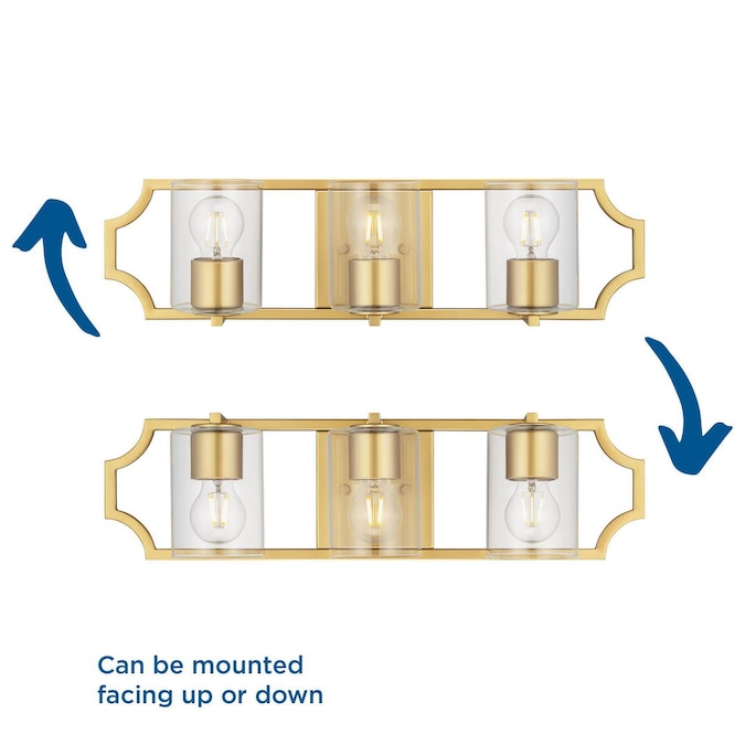 An open rectangular backplate finished in soft Vintage Gold offers distinctive style to the Teigen vanity light. Elegant scalloped edges create a sophisticated pattern against the wall. Three clear glass cylinder shades emit crisp illumination while bringing a modern touch. This versatile fixture can be mounted up or down to bring the perfect amount of light to New Traditional bathrooms.