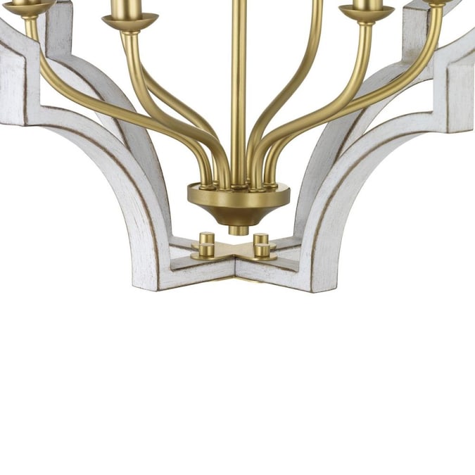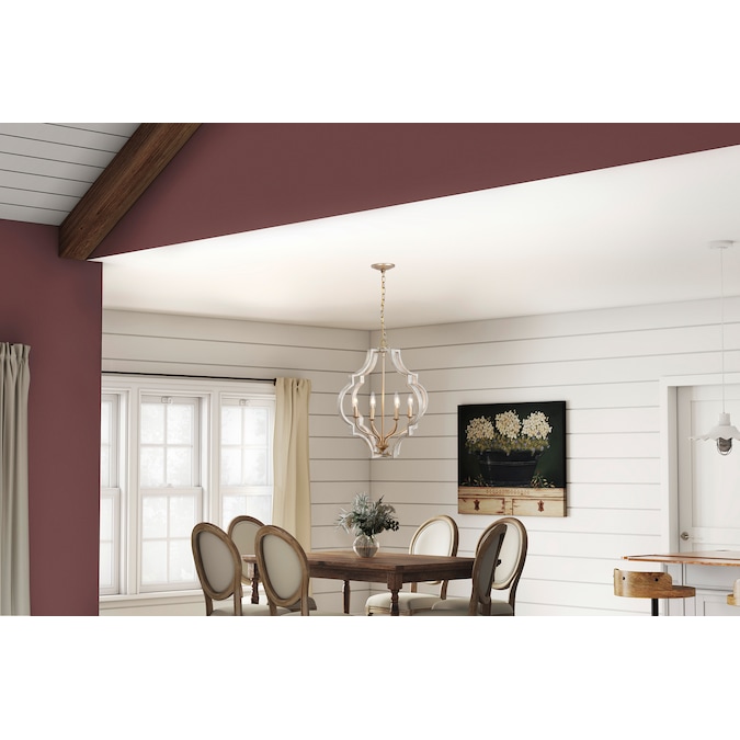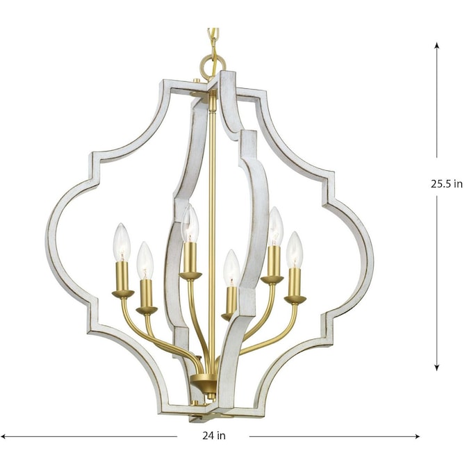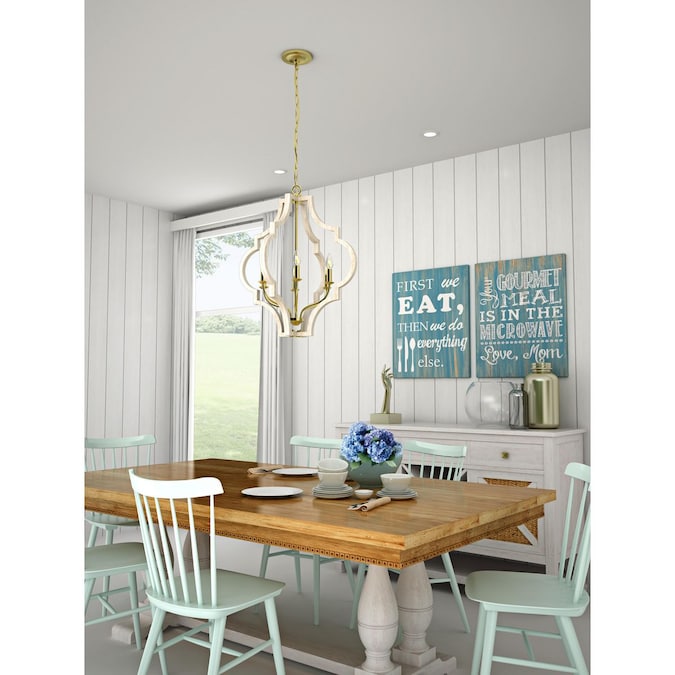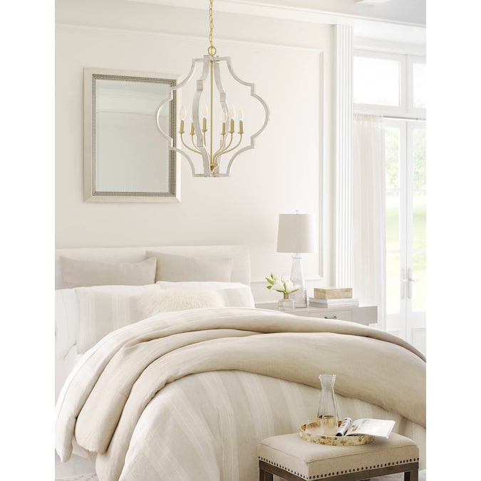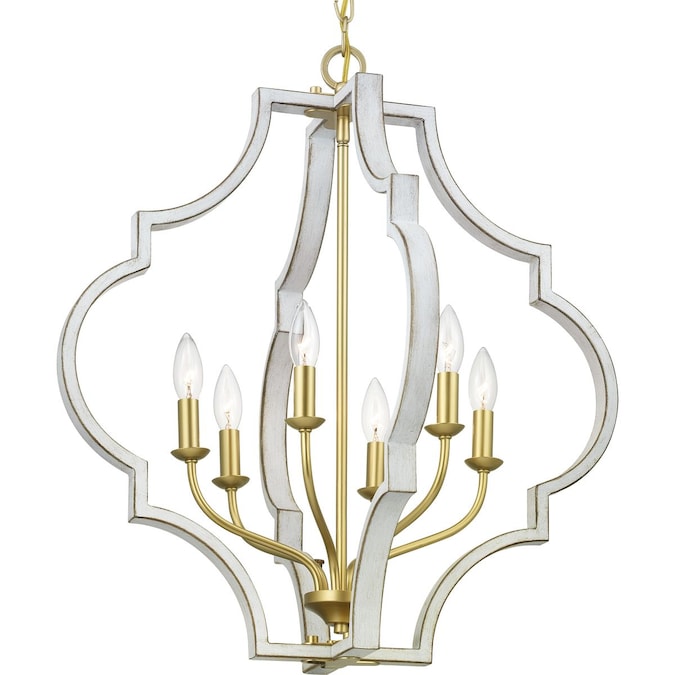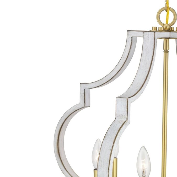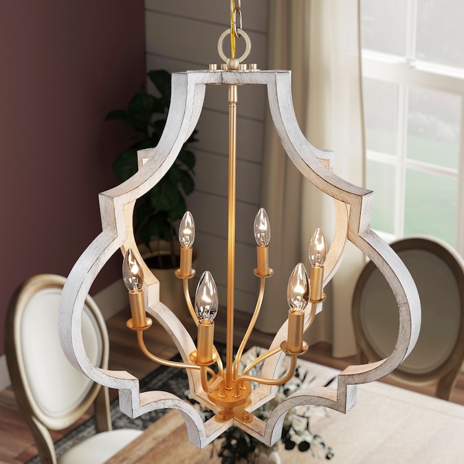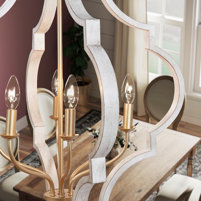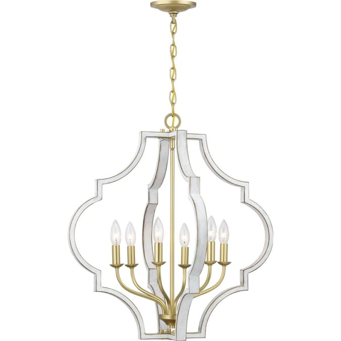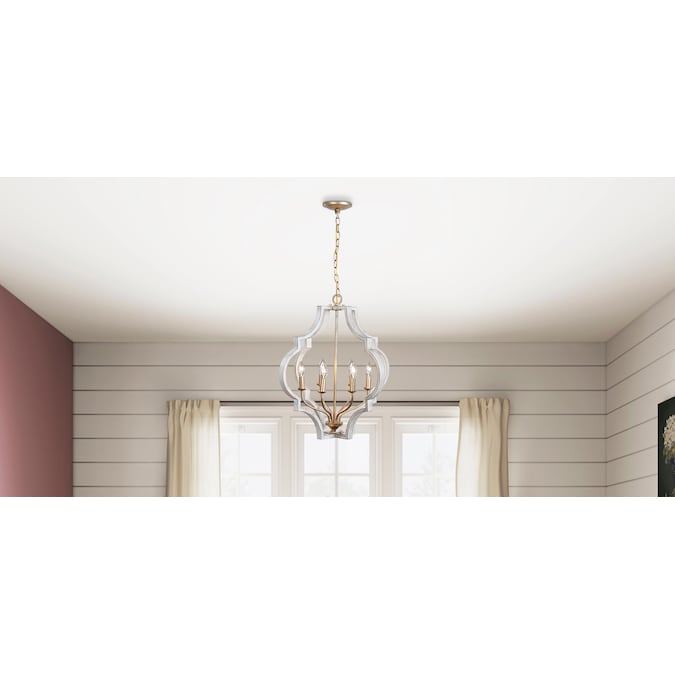 A classic quatrefoil frame is updated with a mixed metal finish in this pendant. Vintage gold is paired with antique white for a beautiful two-toned finish. Candelabra base bulbs blend traditional styling with transitional flair.