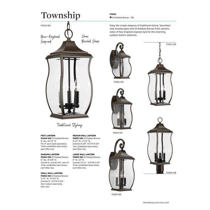 Enjoy the simple elegance of traditional styling in this three-light post lantern. Township’s clear beveled glass and Oil Rubbed Bronze finish contains notes of New England-inspired style for this new outdoor lantern collection.