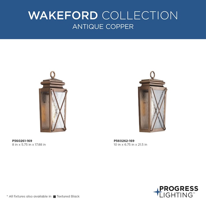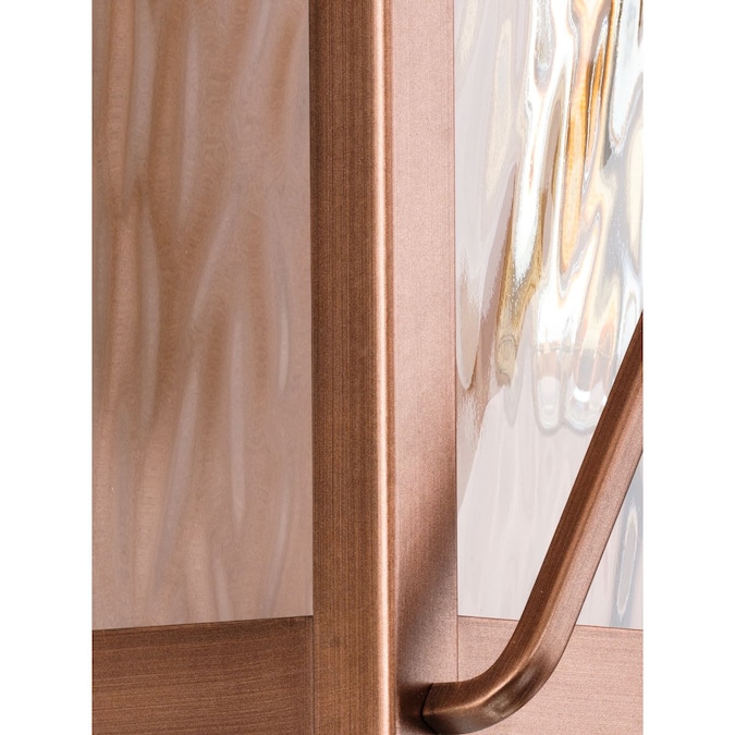 Integrate a nostalgic look with modern sophistication with the Wakeford Collection 1-Light Antique Copper Clear Water Transitional Outdoor Small Wall Lantern Light. A cross-brace design with elements of crown molding trim all coated in an antique copper finish gives the lantern a nostalgic look. A light source glows through textured water glass panes for vintage aesthetic.