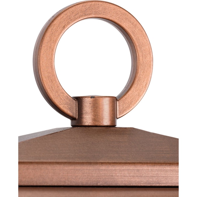 - A cross-brace design with elements of crown molding trim all coated in an antique copper finish gives the lantern a nostalgic look