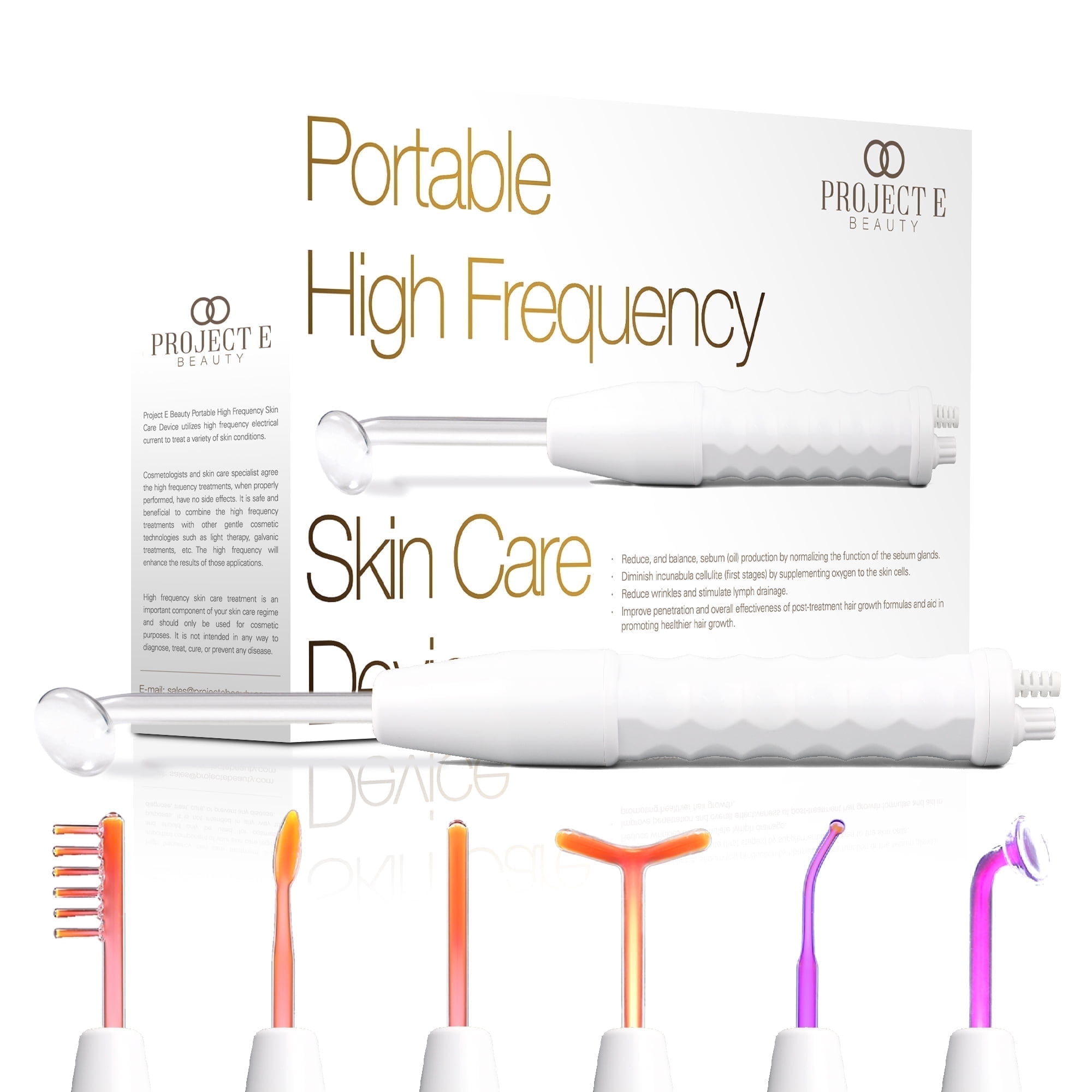 ALL-IN-ONE SKIN TREATMENT – Bring back youthful skin with this high frequency device that helps reverse the signs of aging. Other benefits include: increased blood circulation and collagen production, reduced wrinkles and age spots, tighter skin, brighter complexion, improved acne, faster wound healing, minimized pore sized, tighter skin, increased hair growth, and alopecia treatment. WITH SIX ELECTRODES – Your purchase comes with 6 different electrodes. Use the mushroom electrode for broad areas, the hook electrode for small areas, the spoon electrode for the under eye, the comb electrode for the scalp, and the straight electrode for delicate skin. FOUR TREATMENT METHODS – This high frequency beauty device uses 4 treatment methods: indirect high frequency, direct high frequency, hair care method, and spark method. The method to be used is based on the part to be treated: hair, face, or body. PORTABLE & EASY TO USE – Project E Beauty products are made from high quality materials safety, comfort, and durability. It has a compact design and only weighs 900g for easy storage and transportation. Simply plug the wand to operate, no need for external batteries. CONVENIENT SKINCARE – Use it 2 to 3 times a week, for 10 to 15 minutes per area. Use the electrode on one area for no more than 10 seconds. Carefully read through the instructions prior to first use.
