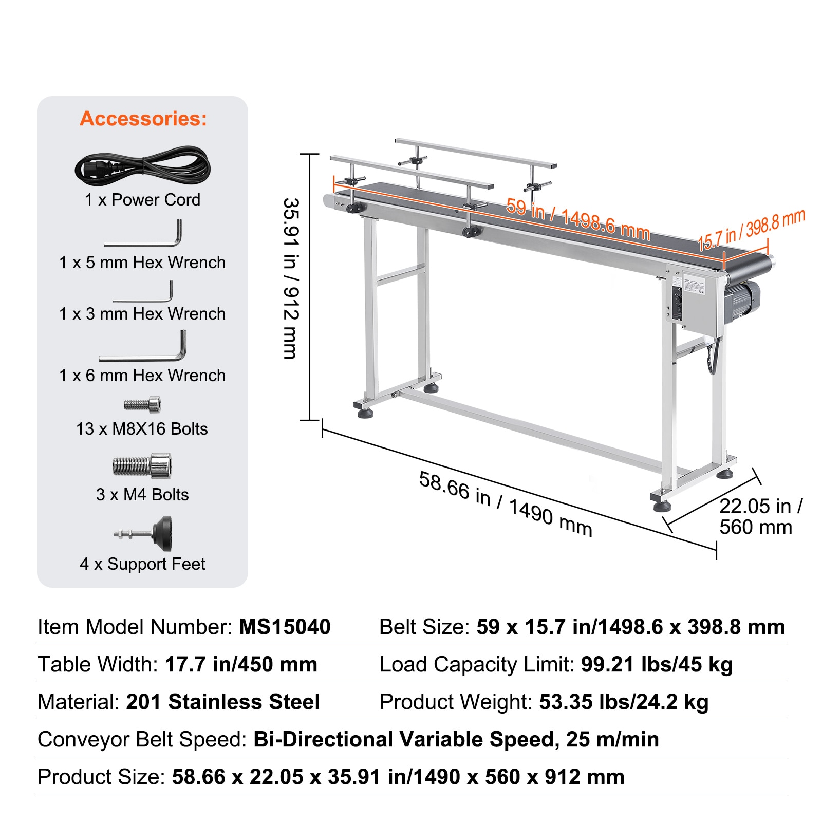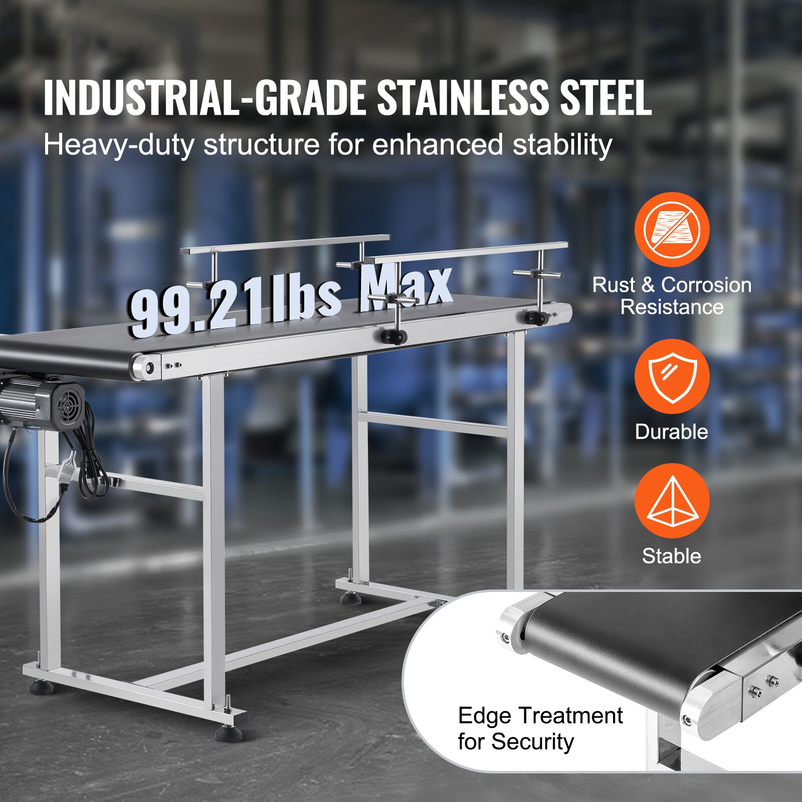 Looking for a heavy-duty, high-performance conveyor system; Our SVOPES motorized belt conveyor is designed for seamless transportation in industrial environments; Made with robust stainless steel and a durable PVC belt, it ensures smooth operation for long periods; The conveyor features adjustable speeds, bi-directional movement, and built-in overheat protection, making it a perfect choice for demanding tasks like inkjet coding and other manufacturing processes.