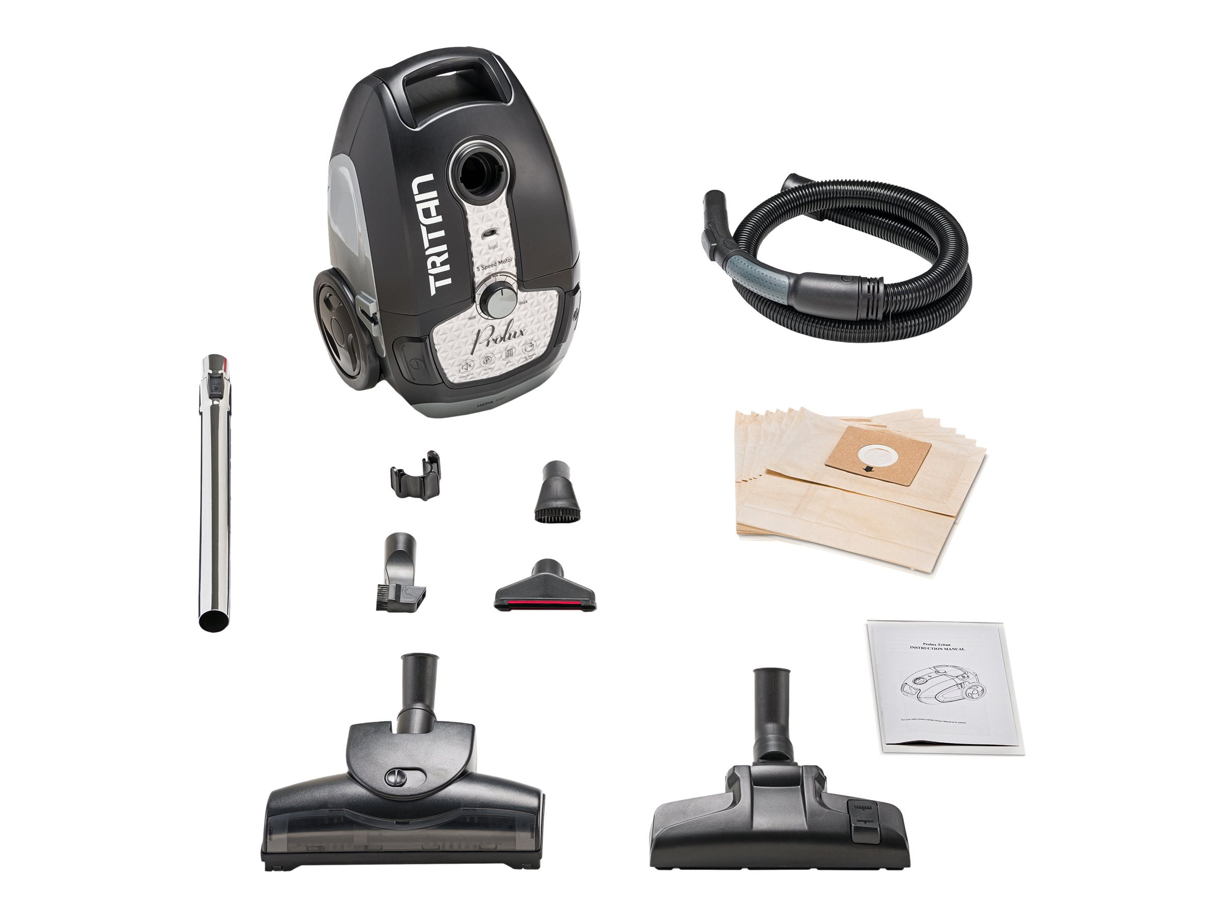 BIG SUCTION IN A COMPACT BODY – The Prolux Tritan is a powerful deep cleaning vacuum cleaner that is designed to clean carpet, rugs, hardwood floors, tile, and more! With its onboard tools, rubber wheels that will protect your floors, and self-retracting cord it’s incredibly simple and easy to use! ANTI-ALLERGY SEALED HEPA FILTRATION – This high-quality vacuum is great for those prone to allergies! Our vacuum cleaner pulls allergens off of your floor and with its 3 stage filtration the air in your home stays fresh and clean. Bagged design and sealed HEPA filtration will keep all of the dust inside to be easily disposed of. LIGHTWEIGHT AND SCRATCH FREE – This vacuum is very lightweight and is designed with rubber wheels to avoid scratching your floors! Big clunky vacuums can scratch and scrape your floors, so we provide a vacuum that glides across your floors with ease. ATTACHMENTS CONVENIENTLY LOCATED ONBOARD – Gone are the days of losing your vacuums accessories! Our vacuum cleaners come with tools conveniently attached to your wand using the provided caddy. These tools include a duster brush, for all your dusting needs. Crevice tool to get in between cushions and against walls. Upholstery tool for couches and car interiors. Also includes two main heads! One with a spinning brush roll for carpet and one which excels on any hard floor type.