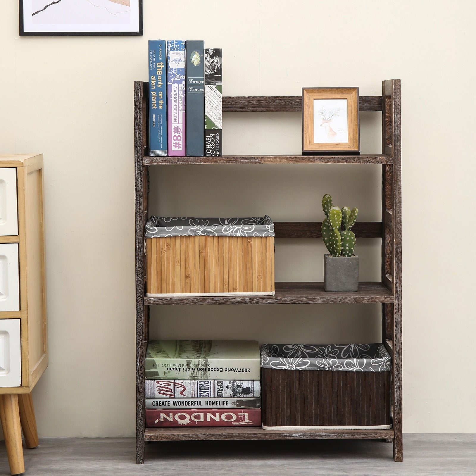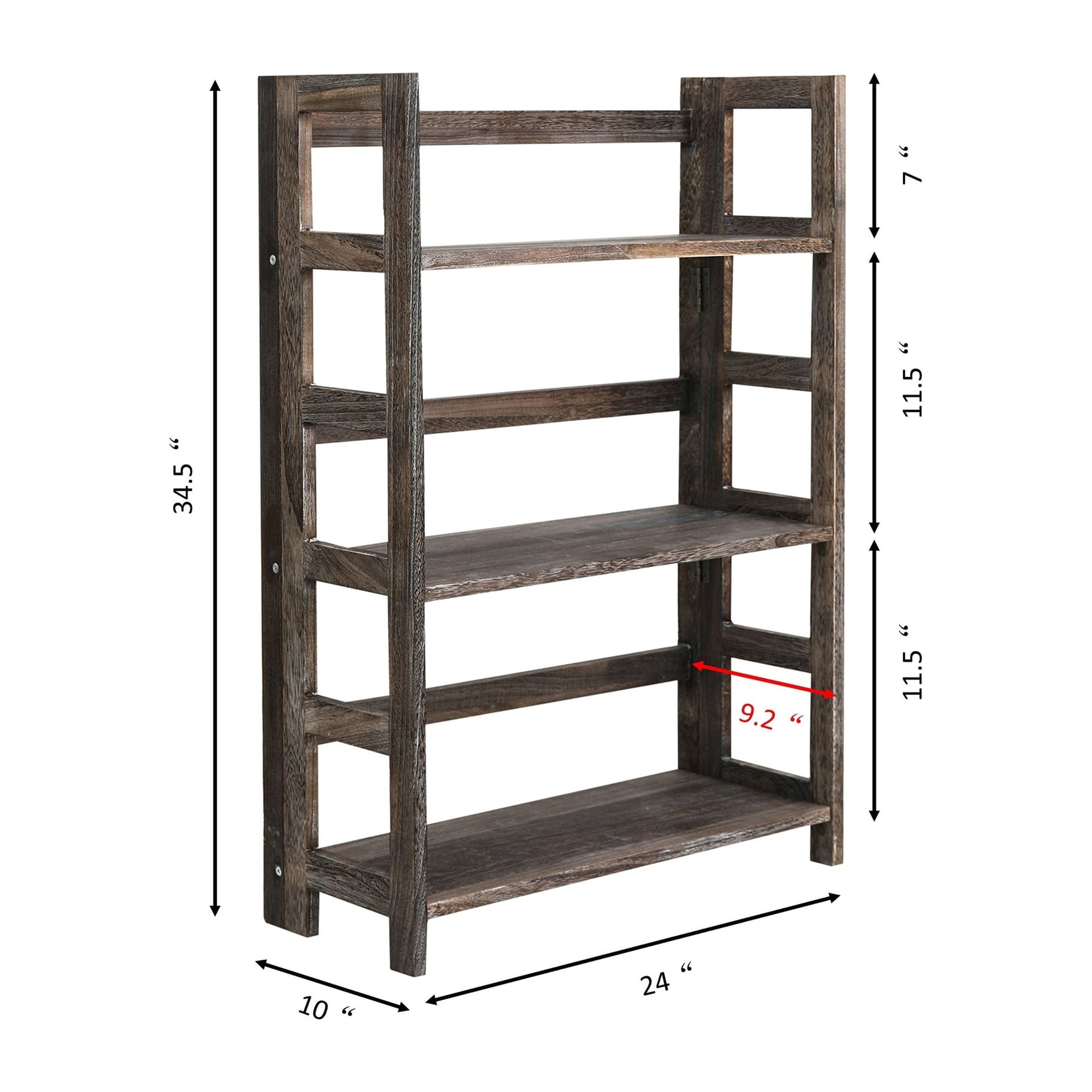 Hickory Folding Bookshelf, is a sturdy bookshelf constructed from high quality paulownia wood that gives it a country-style looks as well as durability. Ideal for any living space, the bookshelf three layers shelves also provides abundant storage space for books, decorations or plants. If you want to move the bookshelf, the clever foldable design makes it easy to transport and storage. 3 Tiers Product Dimensions24″ W x 10″ D x 34.5″ H 4 Tiers Product Dimensions24″ W x 10″ D x 48″ H DurableConstructed from high quality Paulownia Wood. It is build for daily use. Three or Four Tiers Storage SpaceProvide storage to organize any items. Ideal for any living space. Easy StorageThe bookshelf foldable design makes it both convenience and easy for transport and storage. No Assembly RequiredThe bookshelf is pre-assembled. Just open the box and the bookshelf is ready to used.