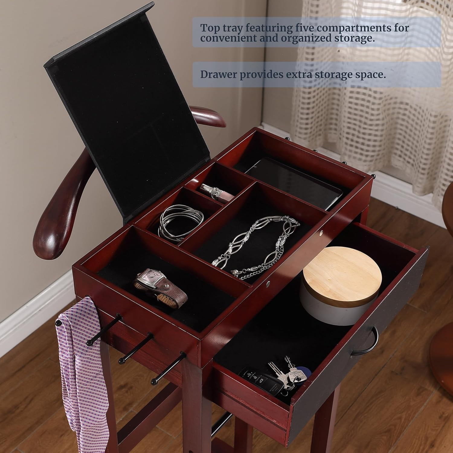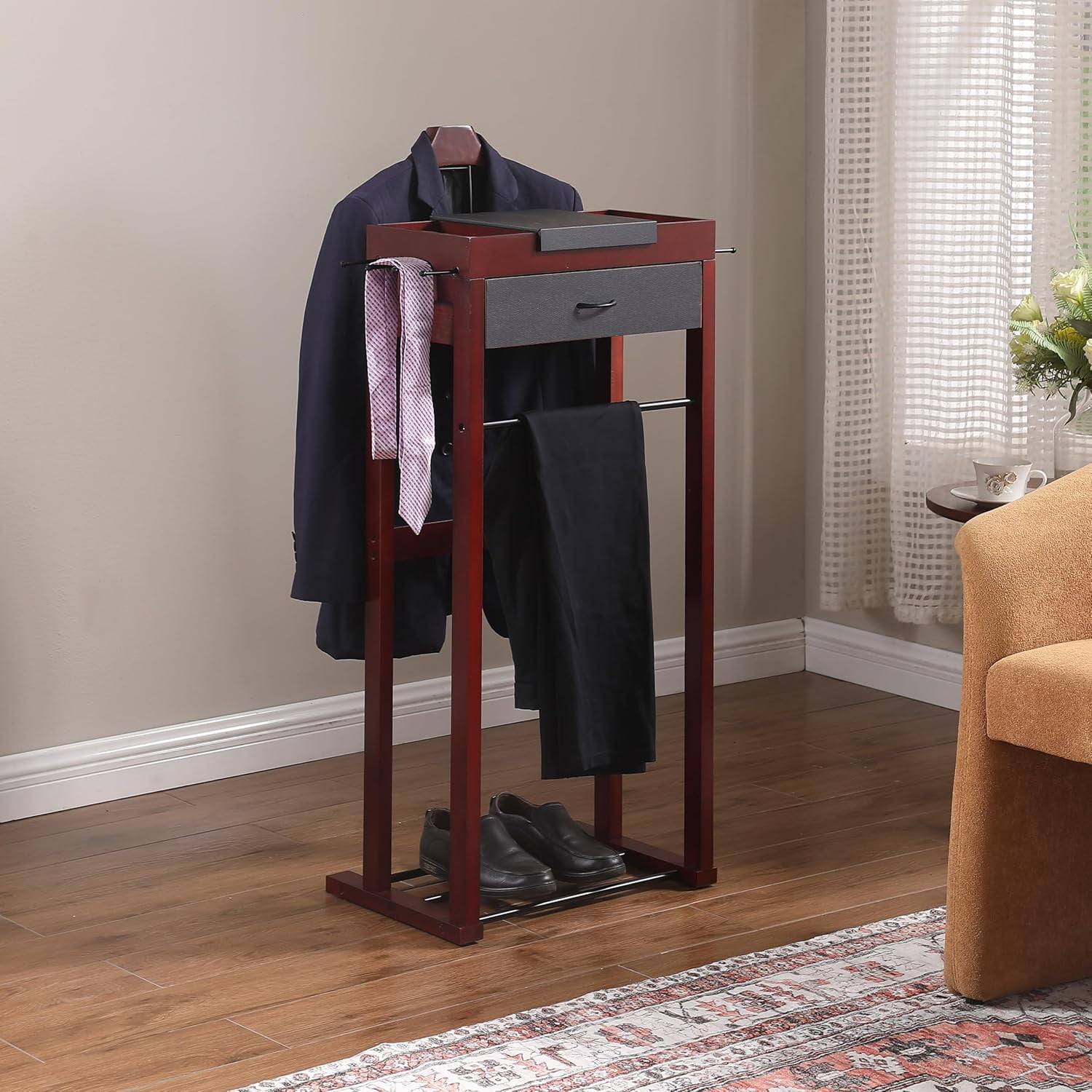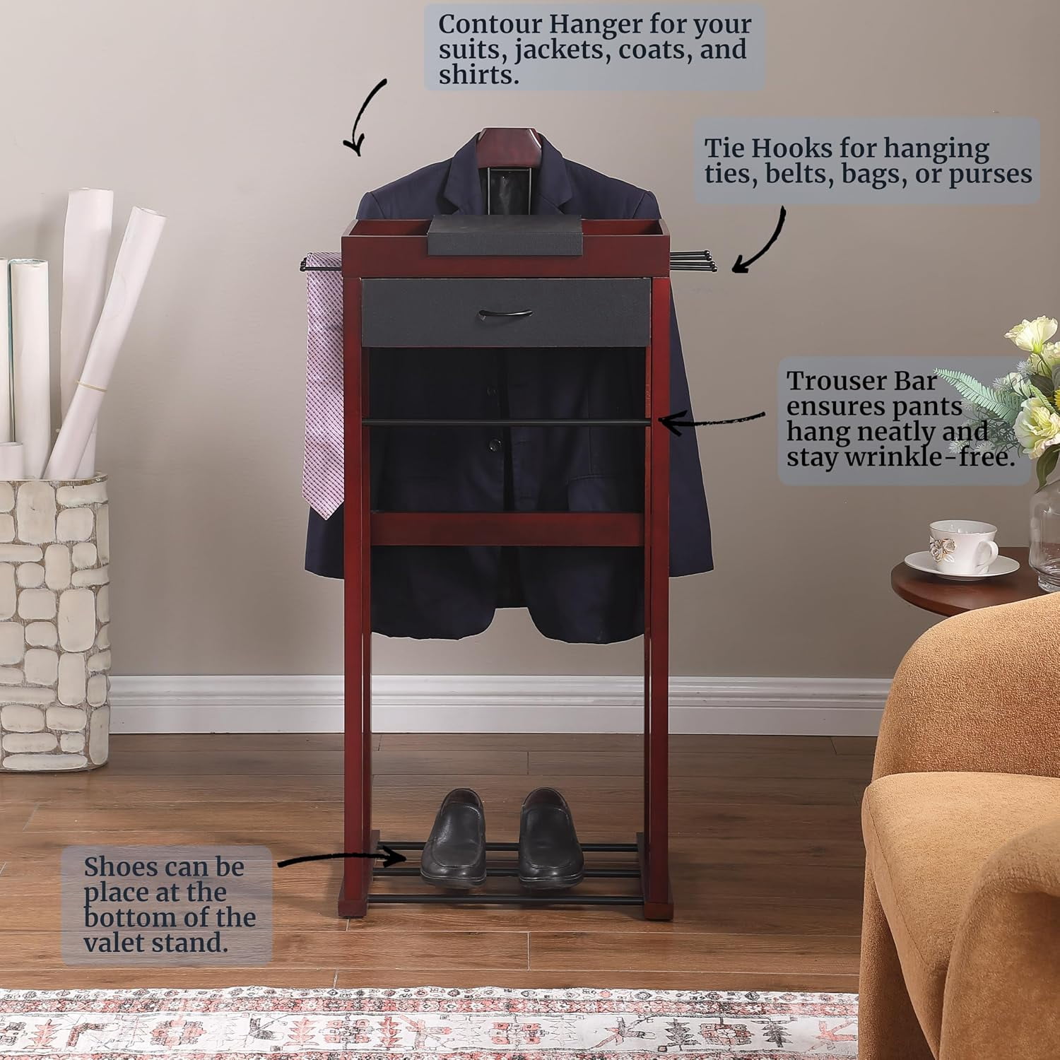 Contour Hanger – Featuring a sleek contour hanger positioned atop the valet stand, its meticulously crafted design is specifically tailored to support suits, jackets, coats and shirts with precision. This thoughtful construction ensures garments retain their shape and stay free from wrinkles. Trouser Bar and 8 Tie Belt Hooks – Featuring a Trouser Bar and 8 Tie Hooks, this organizer ensures pants hang neatly, free of wrinkles. Utilize the 8 Tie Hooks for hanging ties, belts, bags, or purses, making it ideal for garment organization. Top Tray – The top tray offers five compartments for convenient organization, including three with a magnetic flip cover for added privacy. It’s perfect for neatly storing your watch, cell phone, rings, or jewelry. Ideal for discreetly organizing your gear and accessories. Drawer – Stylish center drawer with a black handle. This drawer provides extra storage space, allowing you to effortlessly organize your personal belongings with a touch of sophistication. With everything neatly tucked away in the center drawer, your essentials remain easily accessible, ensuring a clutter-free and elegant living space. Shoe Rack – Shoes can be place at the bottom of the valet stand, along with the hanger and tray at the top. All the garment and accessories can be organized in one place.