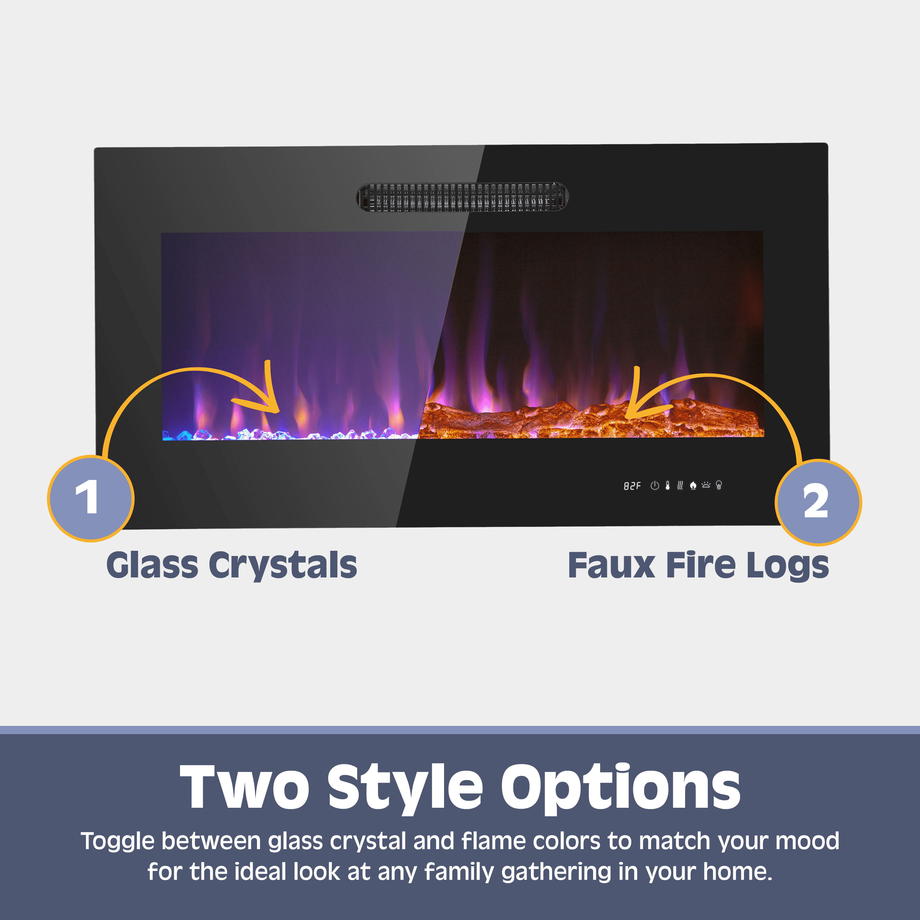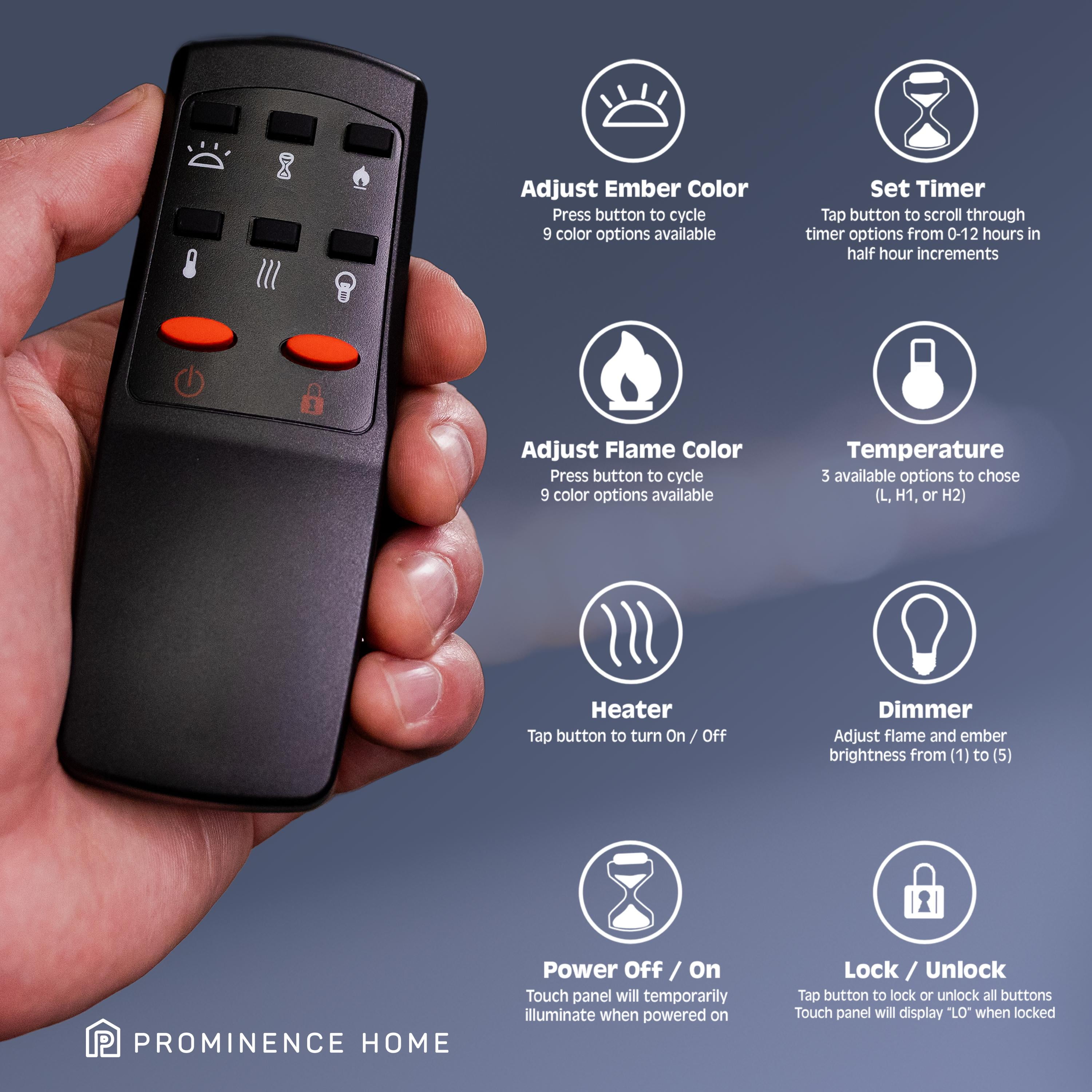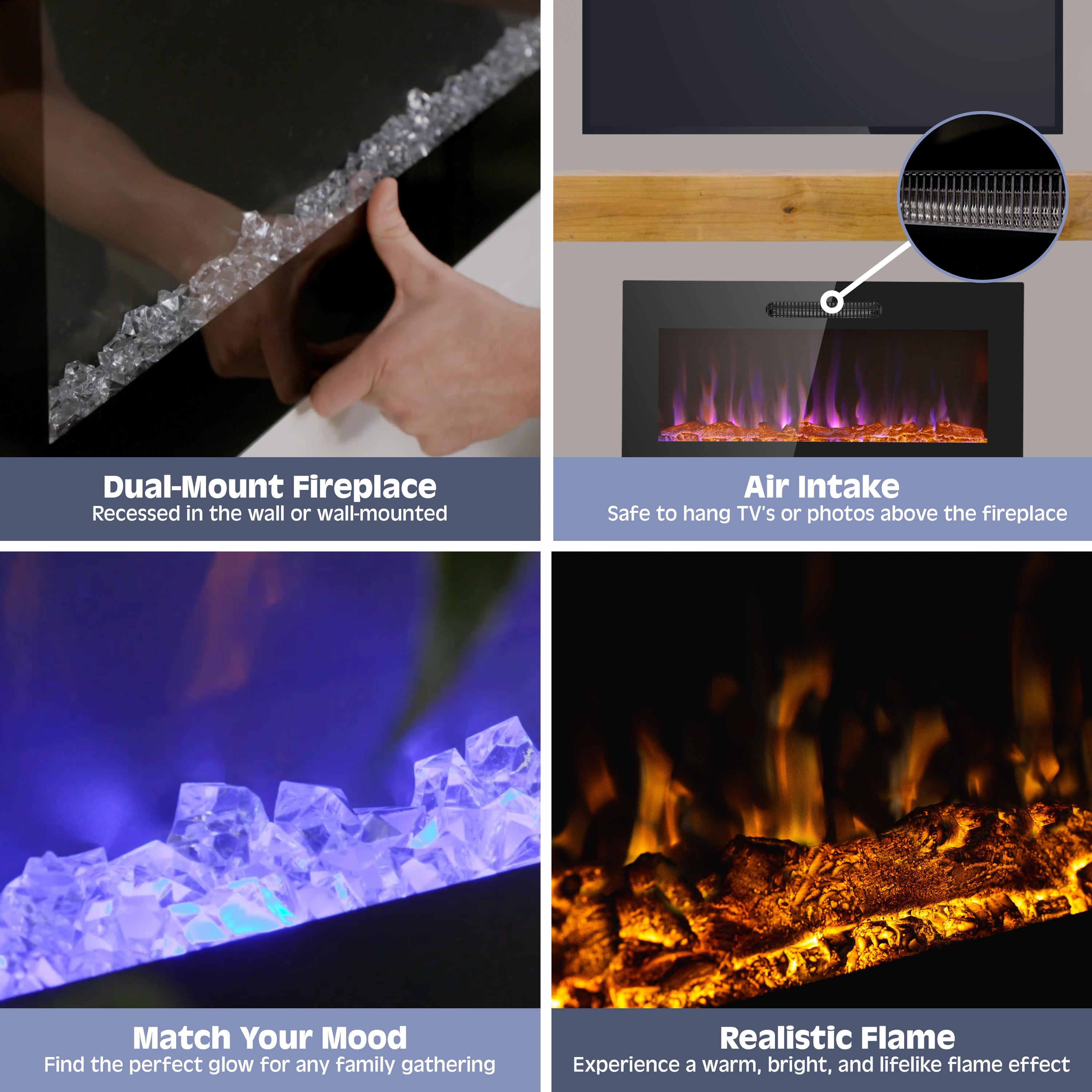 DUAL-MOUNT FIREPLACE OPTION: This electric fireplace can be recessed in the wall or be wall-mounted. Our fireplace comes with easy-to-follow instructions to help homeowners install the unit exactly as they want it for a functional and decorative home heating look. SLEEK FUNCTIONAL HOME HEATING DESIGN: With the low profile black stainless steel frame air intake above the fireplace allows for safe hanging of TV’s or Photos while still offering adjustable heating temperature from 0℉ to 158℉ (5050 BTU / 1500 Watts / 12 Amps) for ambient heating. REALISTIC FLAME: High intensity LED lights provide a warm, bright and lifelike flame effect. Choose from 9 flame colors and 9 ember effects top ranging from a quiet glow to a raging blaze. Both the heat and flame settings can be operated through remote control. COMES WITH TWO EMBER OPTIONS: Equipped with faux fire logs and glass crystals that resemble burning coals, replicating the look and feel of a traditional fireplace. Toggle between ember and flame colors to match your mood for the ideal look at any family gathering in your home. SAFETY: ETL Certificate approved for over-heat protection and comes with a timer from 0-12 hours. Shop with confidence when you buy from Prominence home with our limited lifetime warranty.