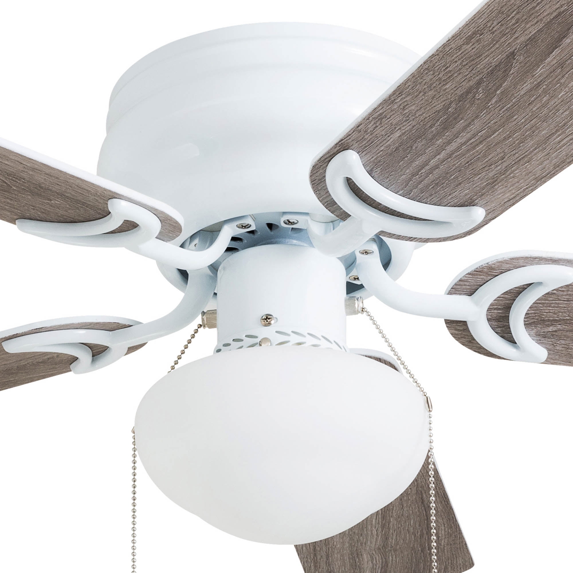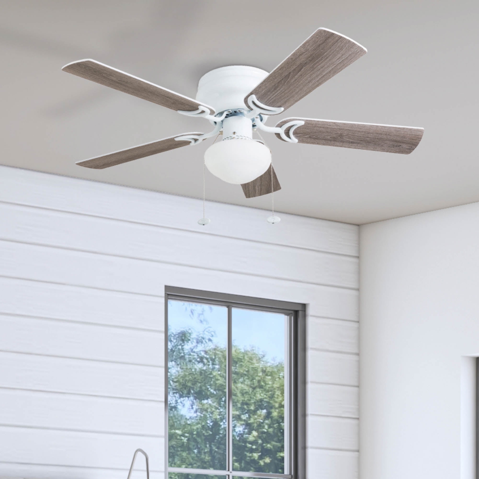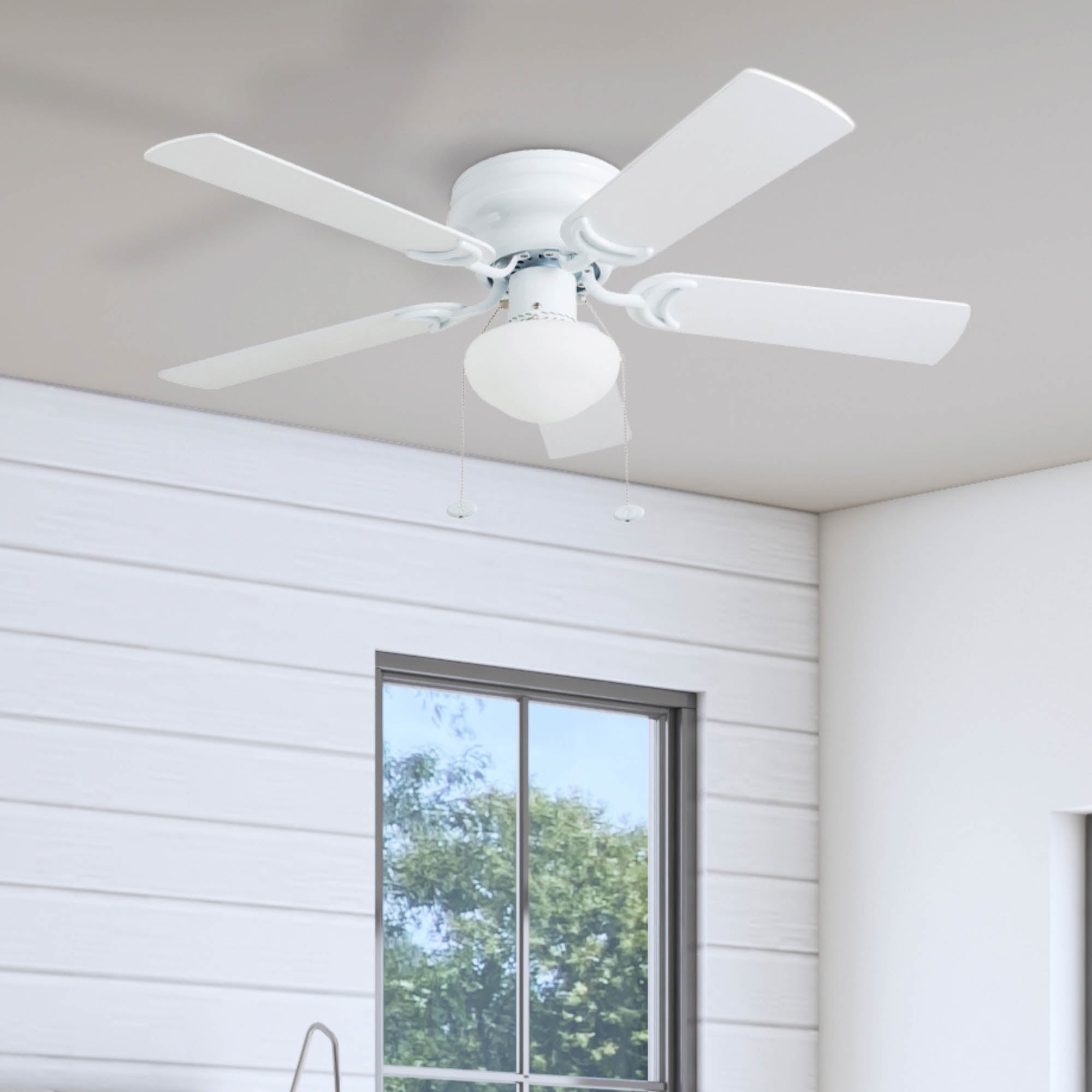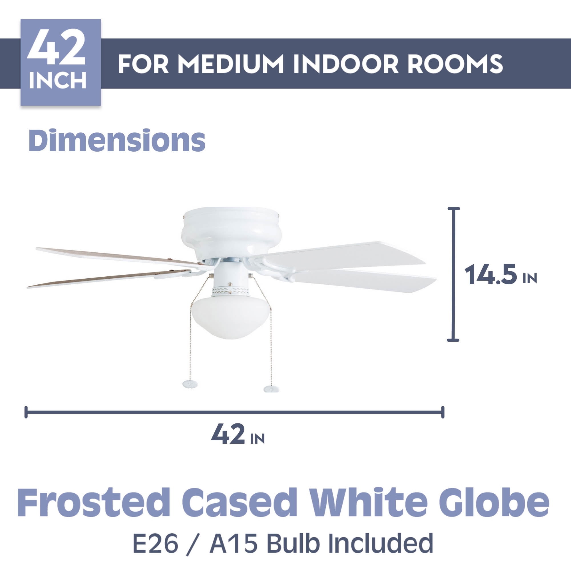 LOW PROFILE DESIGN: Hugger ceiling fan, built for rooms where extra space is needed. SMALL TO MEDIUM SIZED ROOMS: Perfect for rooms around 350 square feet such as living rooms, bedrooms, dining rooms or family rooms. QUIET, REVERSIBLE MOTOR: Conveniently quiet, 3 speed – reversible motor. Can be run in the winter to aid in rotating warm air and cutting down on energy costs. TWO-SIDED CEILING FAN BLADES: Get the perfect finish match with our reversible ceiling fan blades. Each side has a unique finish. FLUSH MOUNT: Two piece CRS hugger mounting system included PULL-CHAINS INCLUDED: Included for quick and easy on/off adjustments. This fan is also compatible with universal ceiling fan remote controls. FROSTED OPAL GLOBE LIGHT: One A15 /E26 (included) with purchase HANGING MEASUREMENTS: This fan measures 14.49 inches from ceiling to bottom of fan