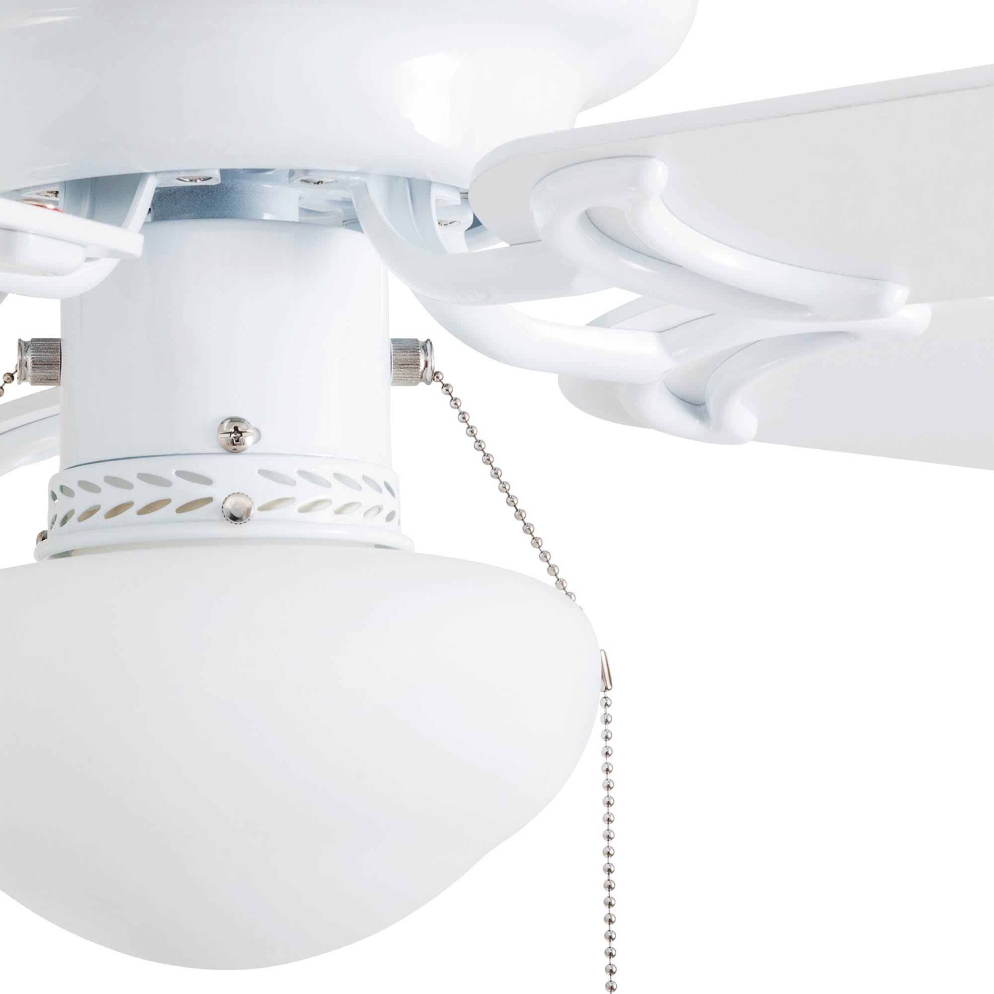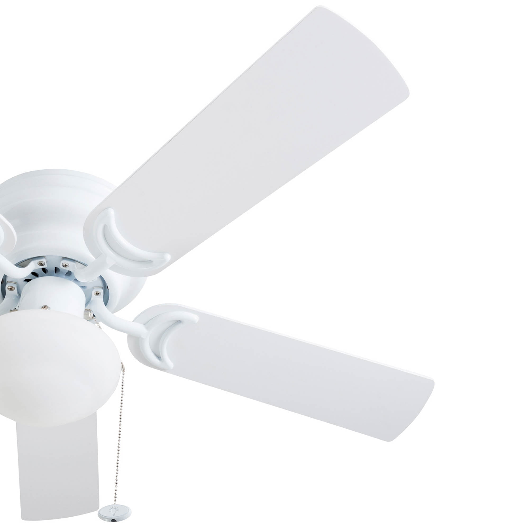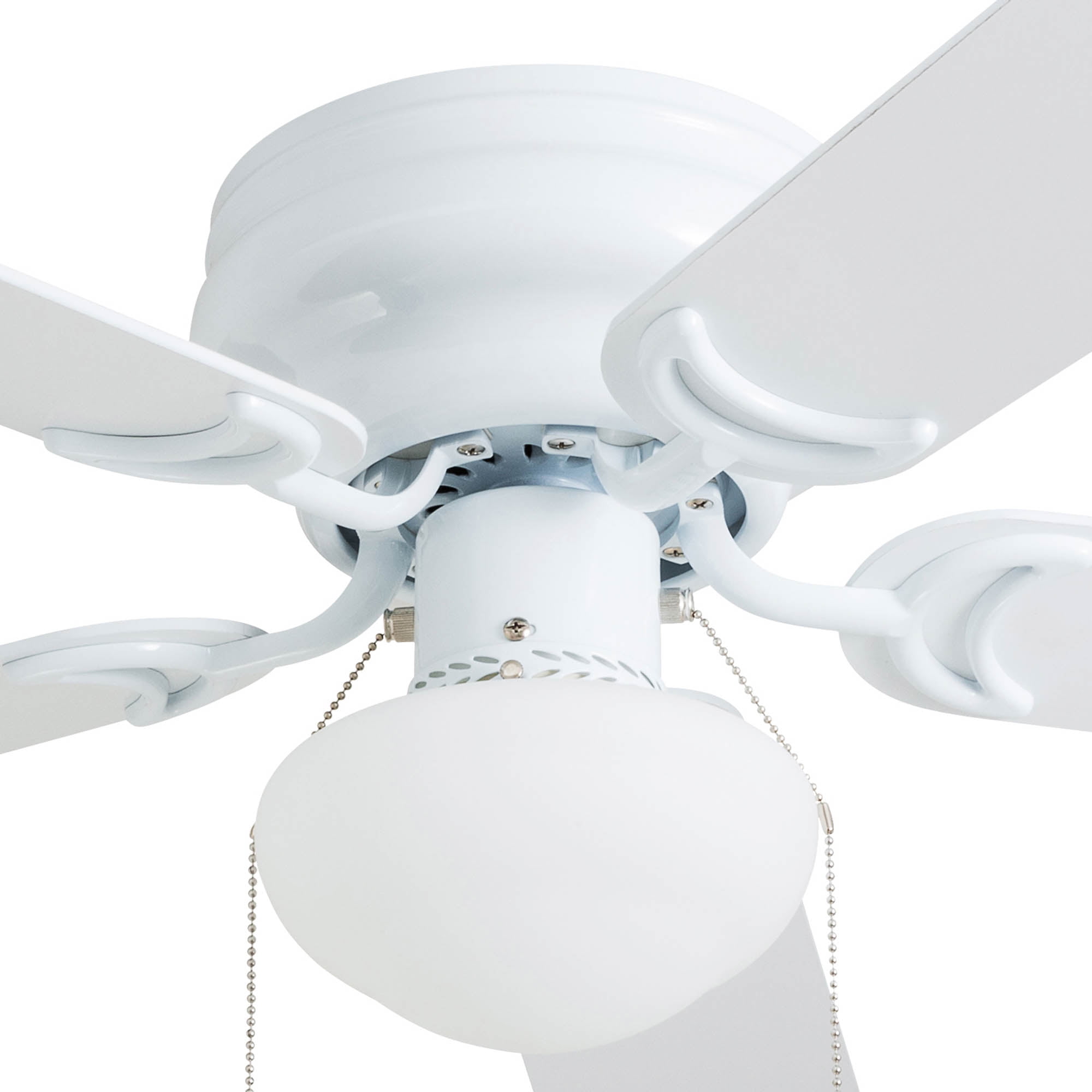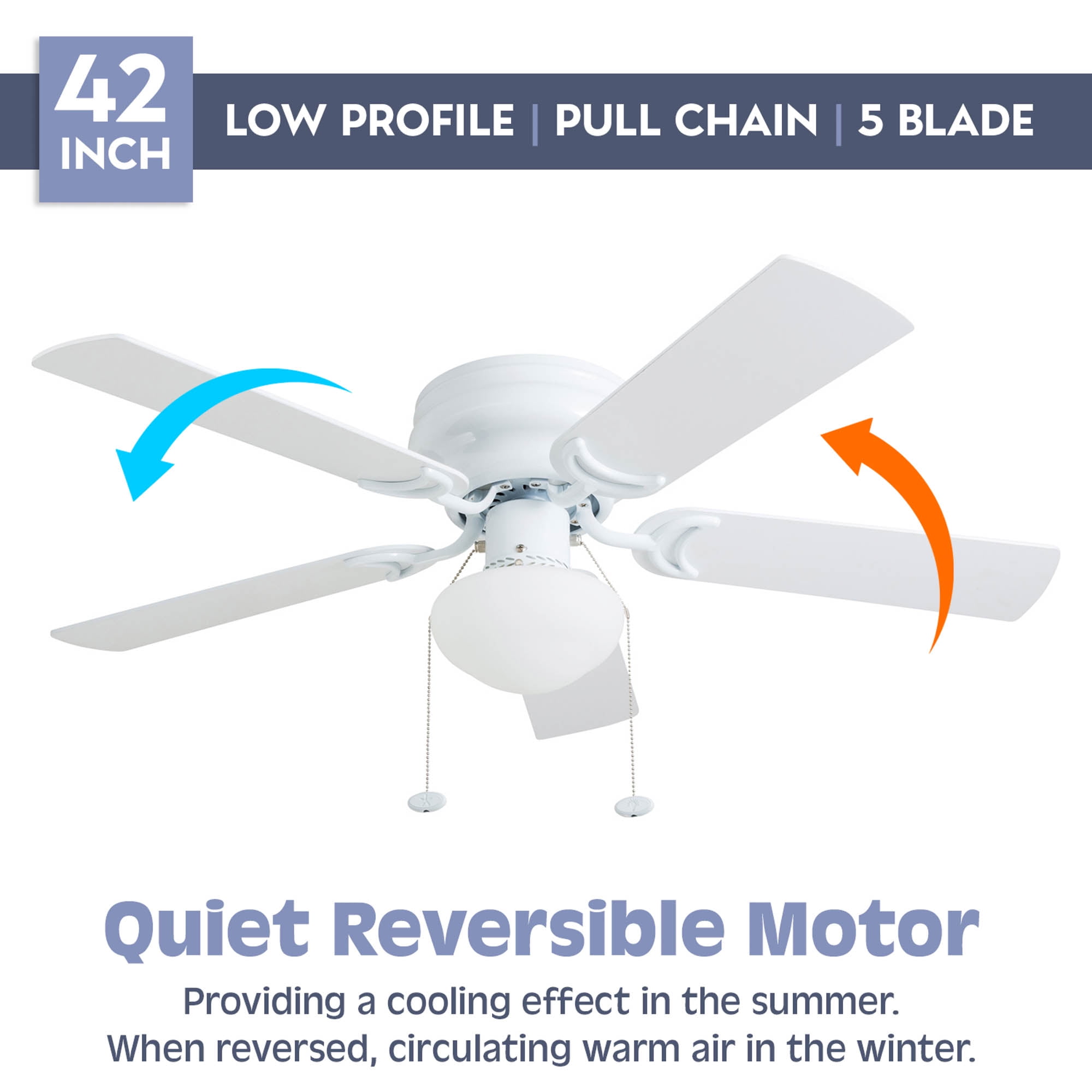 LOW PROFILE DESIGN: Hugger ceiling fan, built for rooms where extra space is needed. SMALL TO MEDIUM SIZED ROOMS: Perfect for rooms around 350 square feet such as living rooms, bedrooms, dining rooms or family rooms. QUIET, REVERSIBLE MOTOR: Conveniently quiet, 3 speed – reversible motor. Can be run in the winter to aid in rotating warm air and cutting down on energy costs. TWO-SIDED CEILING FAN BLADES: Get the perfect finish match with our reversible ceiling fan blades. Each side has a unique finish. FLUSH MOUNT: Two piece CRS hugger mounting system included PULL-CHAINS INCLUDED: Included for quick and easy on/off adjustments. This fan is also compatible with universal ceiling fan remote controls. FROSTED OPAL GLOBE LIGHT: One A15 /E26 (included) with purchase HANGING MEASUREMENTS: This fan measures 14.49 inches from ceiling to bottom of fan