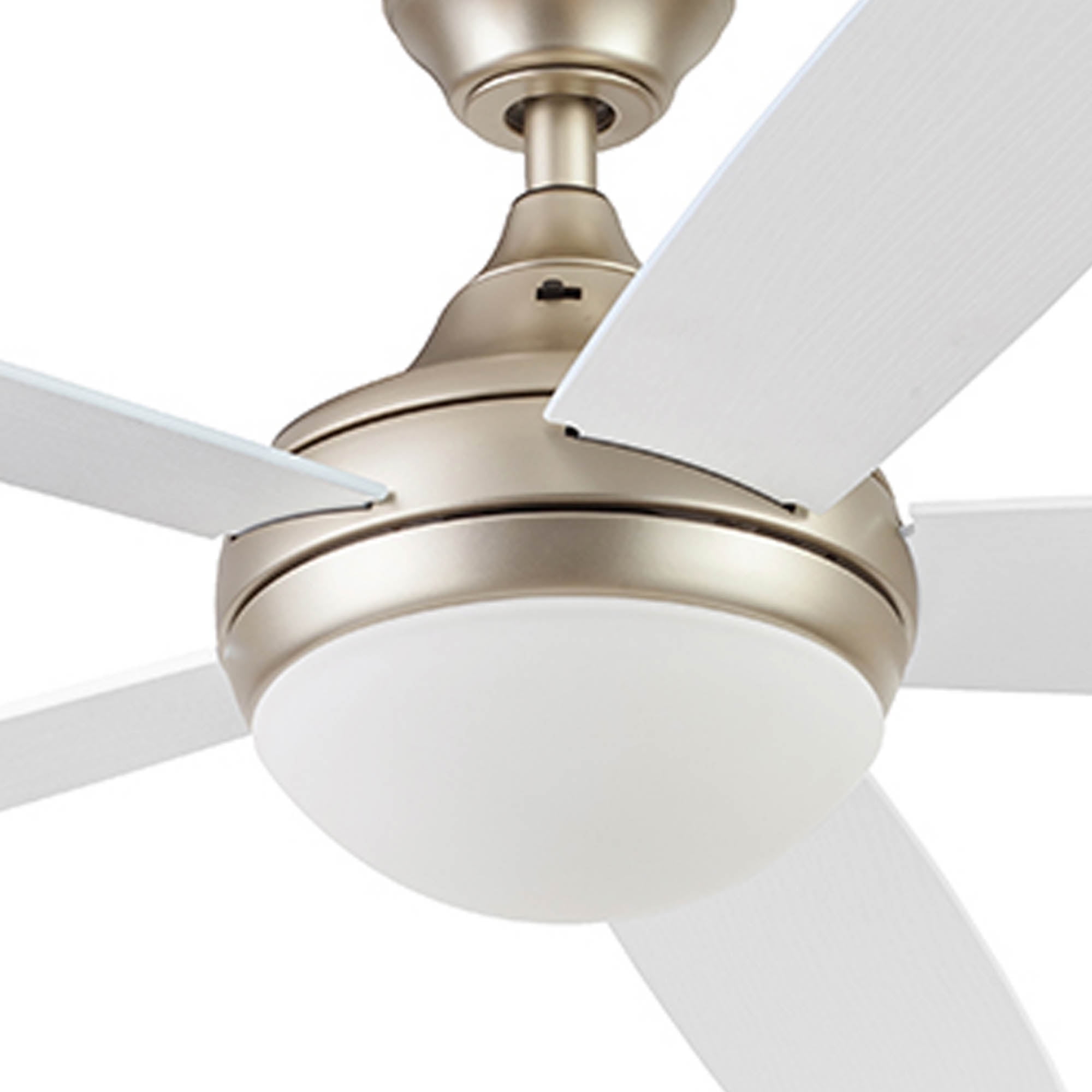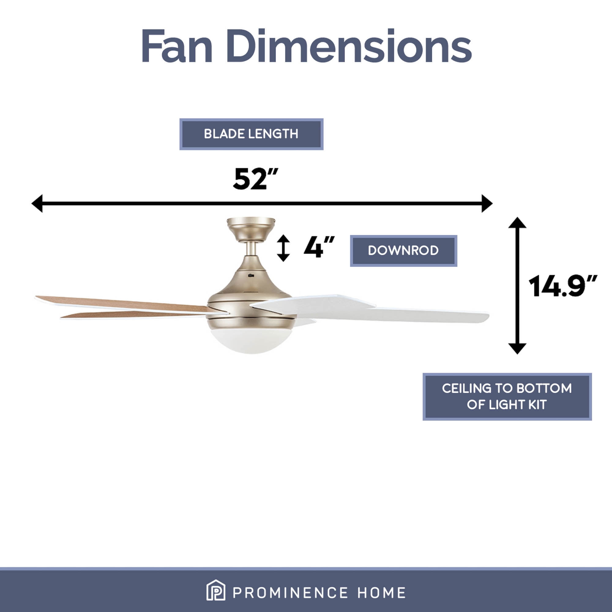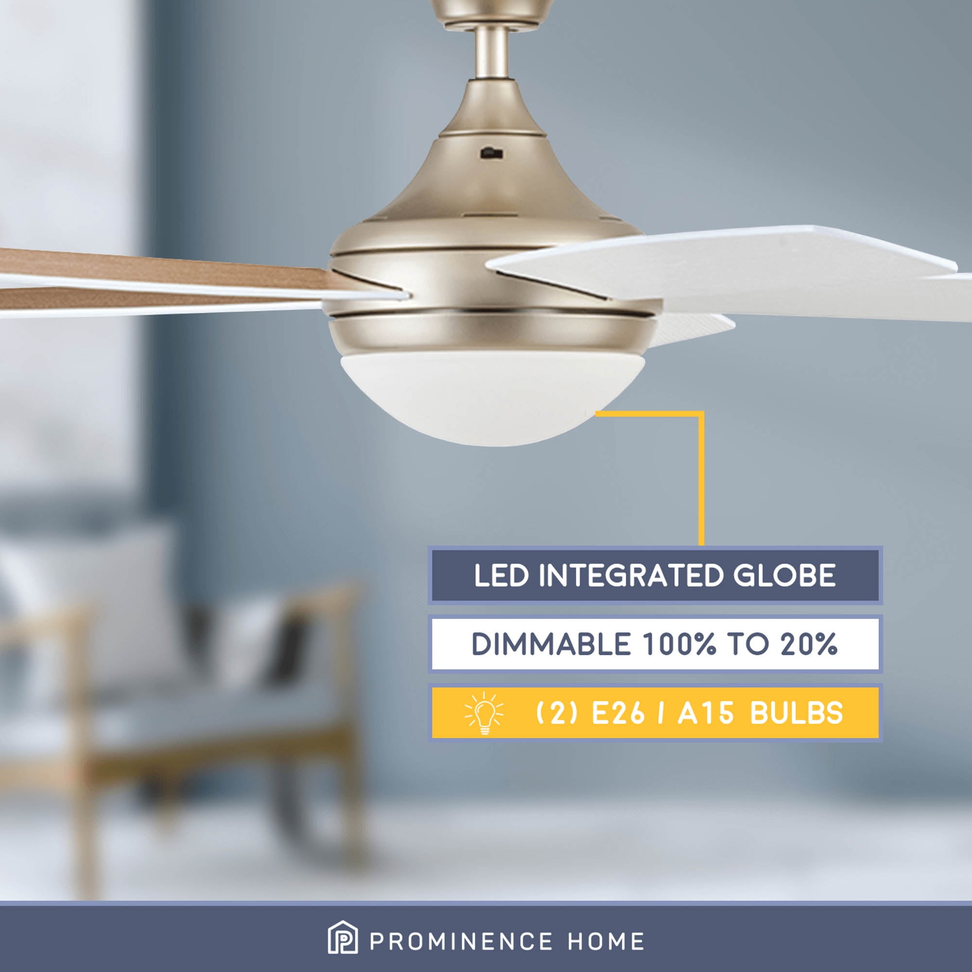 Sleek and modern with a glamorous flair, the 52-inch Prominence Home Ashby will easily become a conversation starter in any room it graces. This chic ceiling fan features a dazzling champagne finish with 5 reversible blades expertly designed to enhance the look and provide the perfect complement to your piece. These blades feature a white finish on one side and a honey oak finish on the other. Adjusting the blades is easy and the choice is yours! Its spherical housing features a powerful integrated LED globe with the lumens to light up a room but dimmable to create the perfect ambiance for your mood. The robust motor and design provide adjustable, reversible air movement that is ultra-efficient whether you want to cool down on those sweltering summer days or circulate warm air in the cold months of winter. The included remote controls the power, 3 speed settings of the fan, the reversible airflow and light for the ultimate convenience. . The Prominence Home Ashby gives you all the quality functions you deserve while providing the impressive eye-catching style you crave.