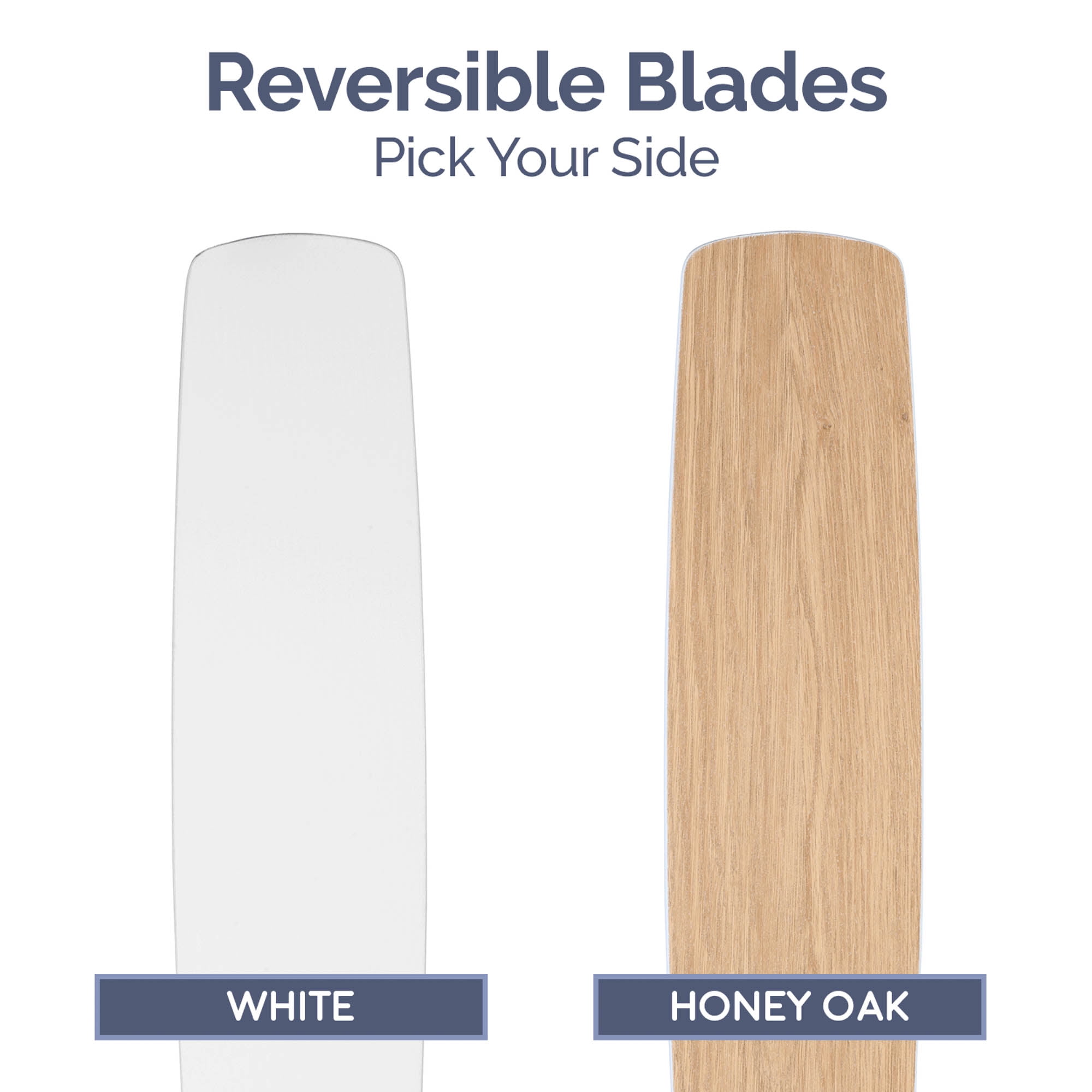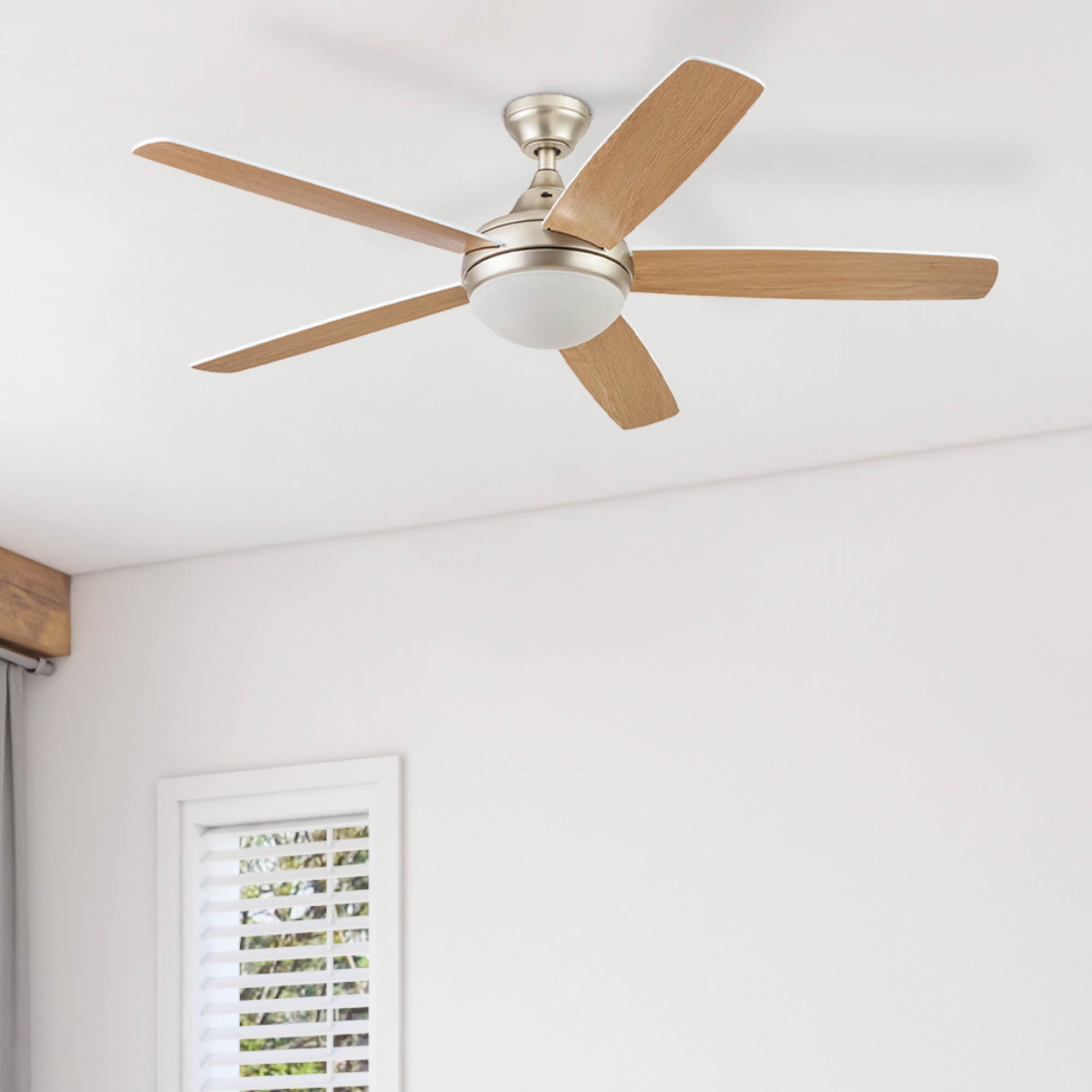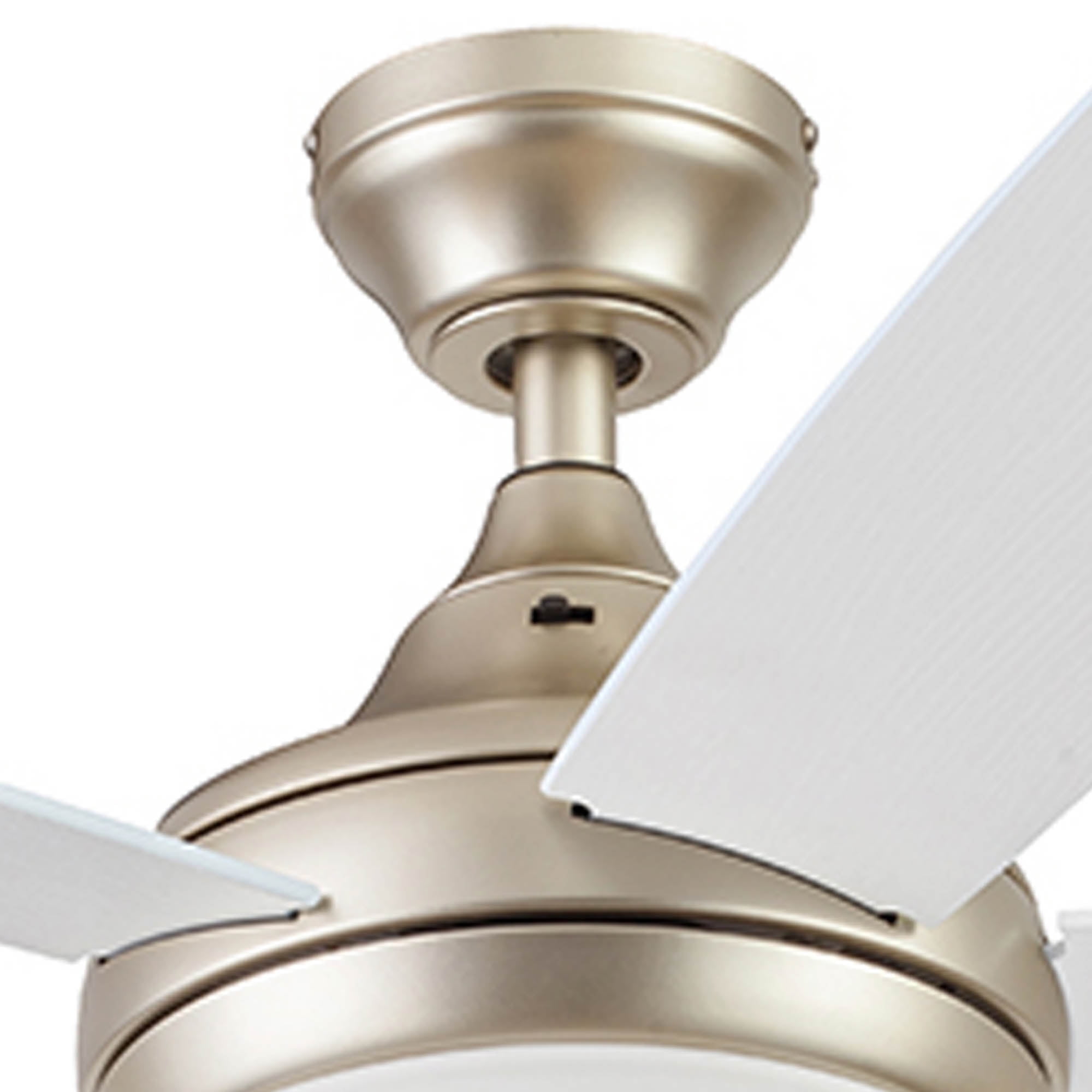 Sleek and modern with a glamorous flair, the 52-inch Prominence Home Ashby will easily become a conversation starter in any room it graces. This chic ceiling fan features a dazzling champagne finish with 5 reversible blades expertly designed to enhance the look and provide the perfect complement to your piece. These blades feature a white finish on one side and a honey oak finish on the other. Adjusting the blades is easy and the choice is yours! Its spherical housing features a powerful integrated LED globe with the lumens to light up a room but dimmable to create the perfect ambiance for your mood. The robust motor and design provide adjustable, reversible air movement that is ultra-efficient whether you want to cool down on those sweltering summer days or circulate warm air in the cold months of winter. The included remote controls the power, 3 speed settings of the fan, the reversible airflow and light for the ultimate convenience. . The Prominence Home Ashby gives you all the quality functions you deserve while providing the impressive eye-catching style you crave.