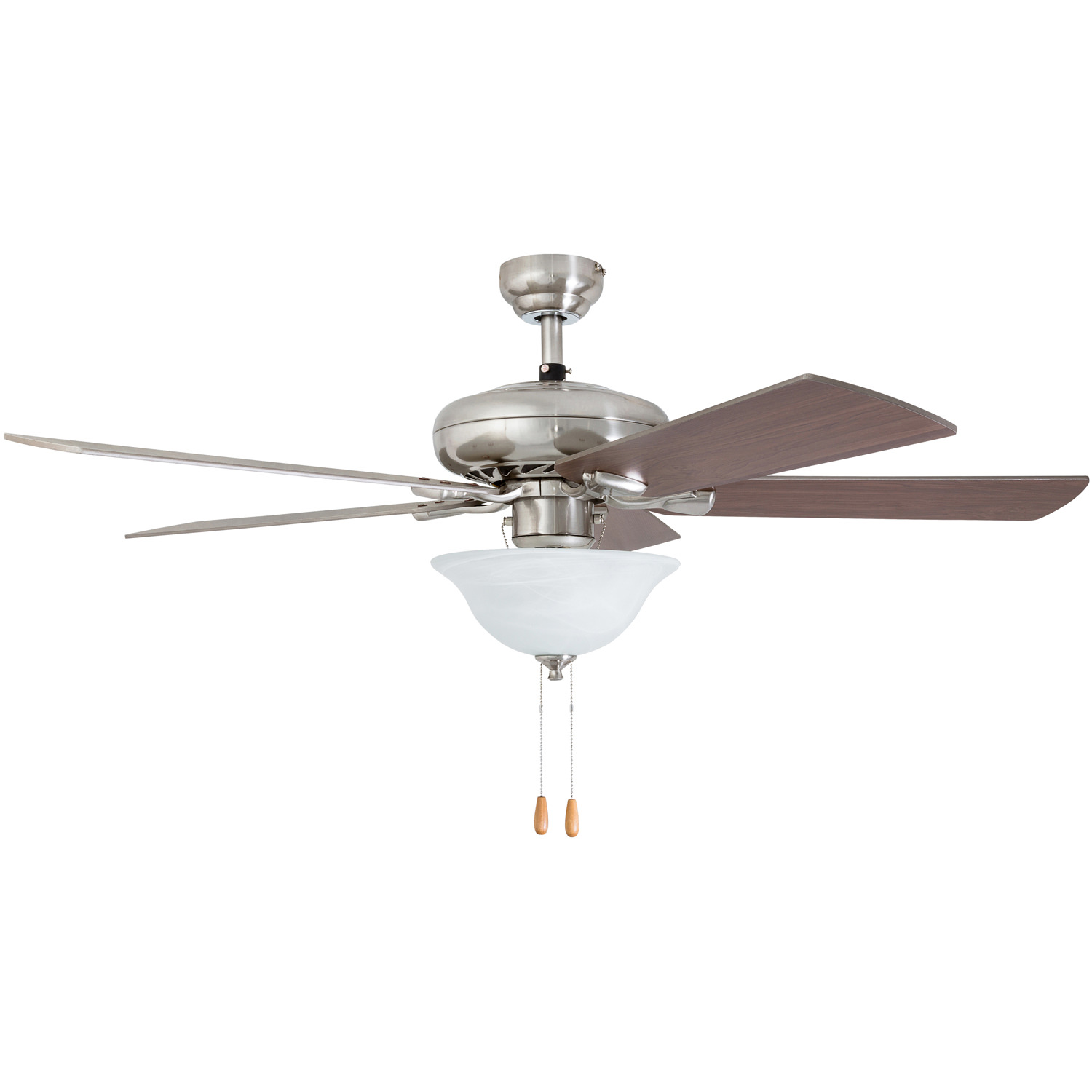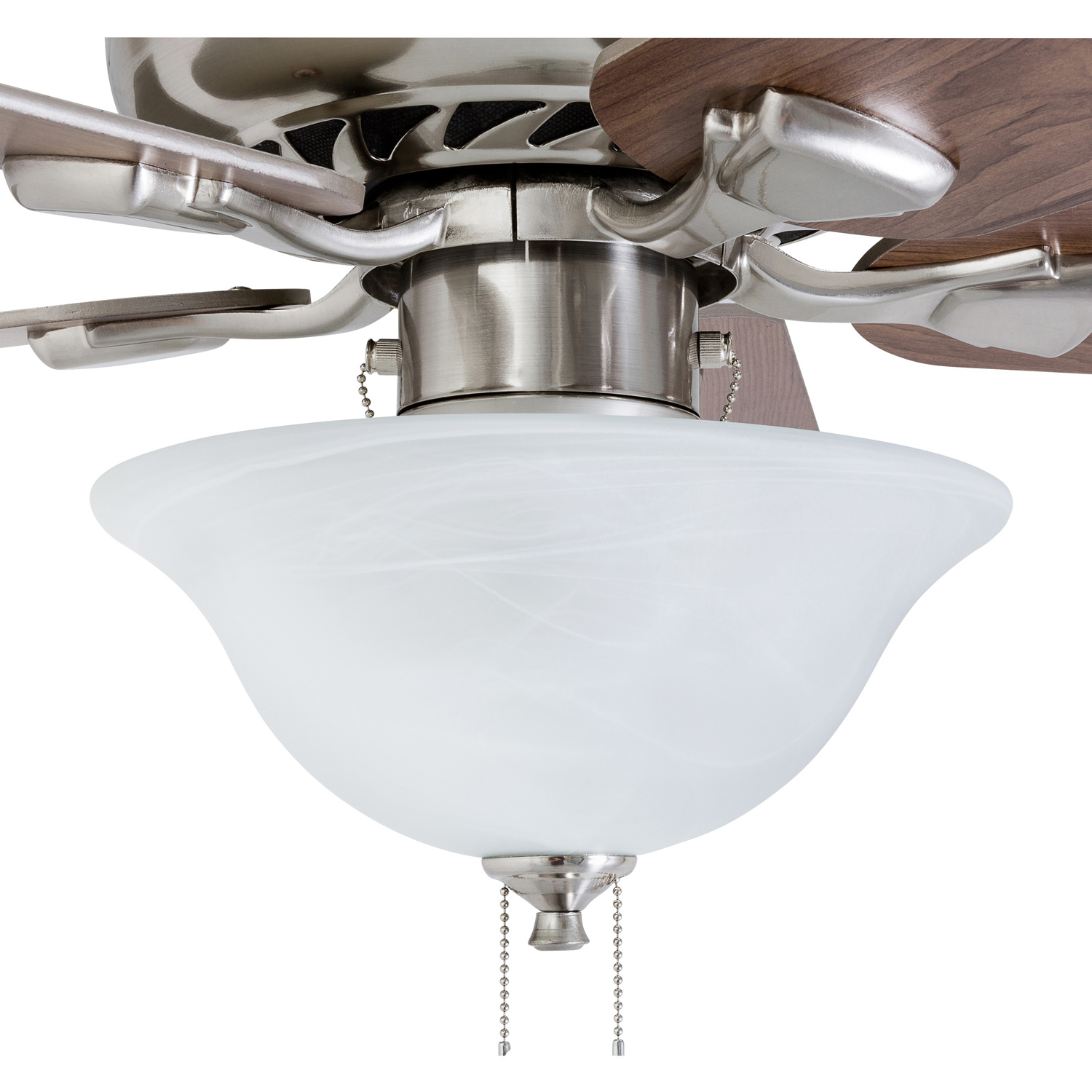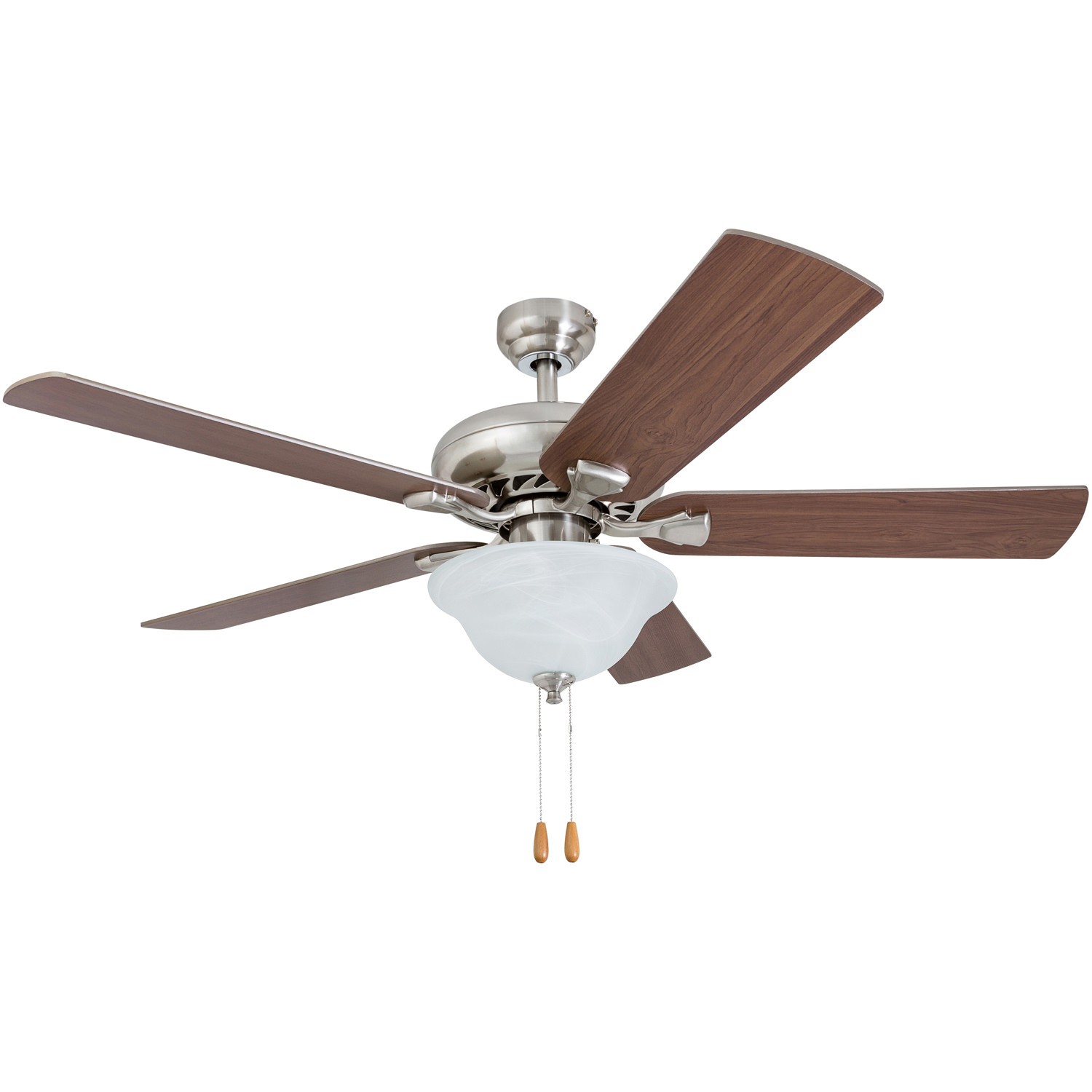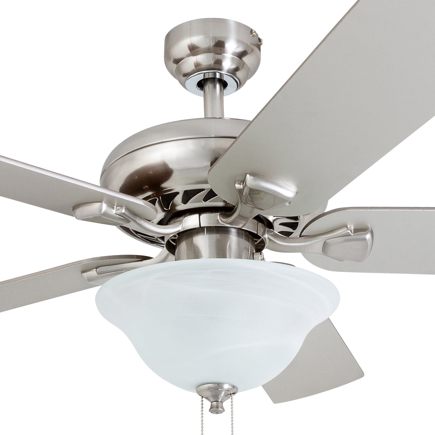 Prominence Home 52” Brushed Nickel Traditional Ceiling Fan with LED Bowl Light and Remote Control High air-flow design for a refreshing breeze Three speed settings for customizable comfort Quiet, reversible motor for year-round use Ideal for medium-sized rooms up to 350 square feet Reversible blades with two unique finishes for versatile styling LED bowl light for energy-efficient illumination