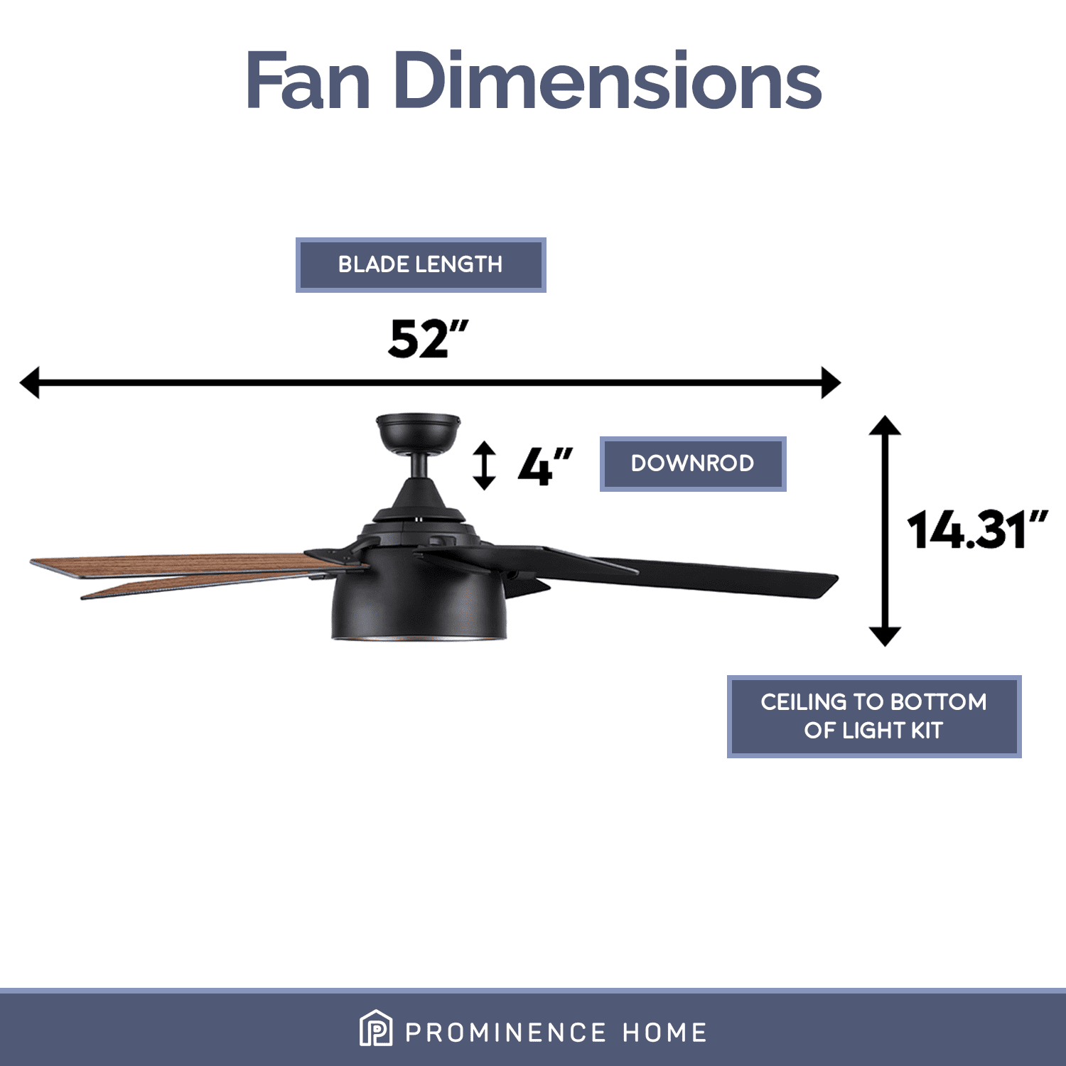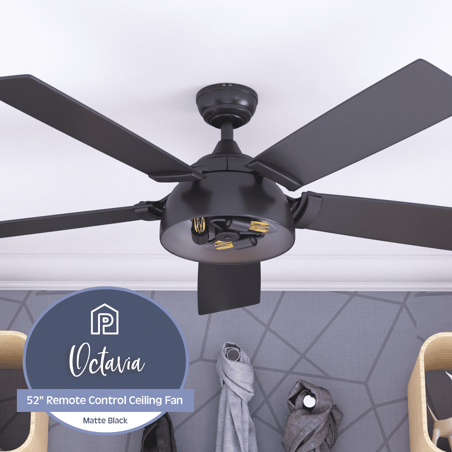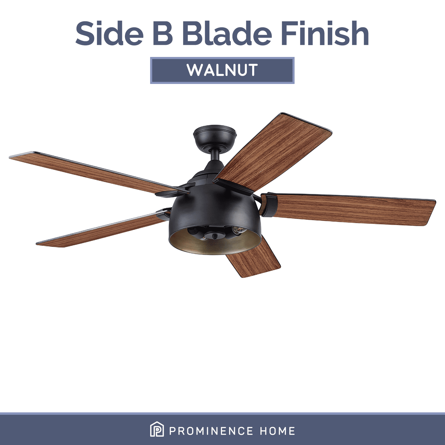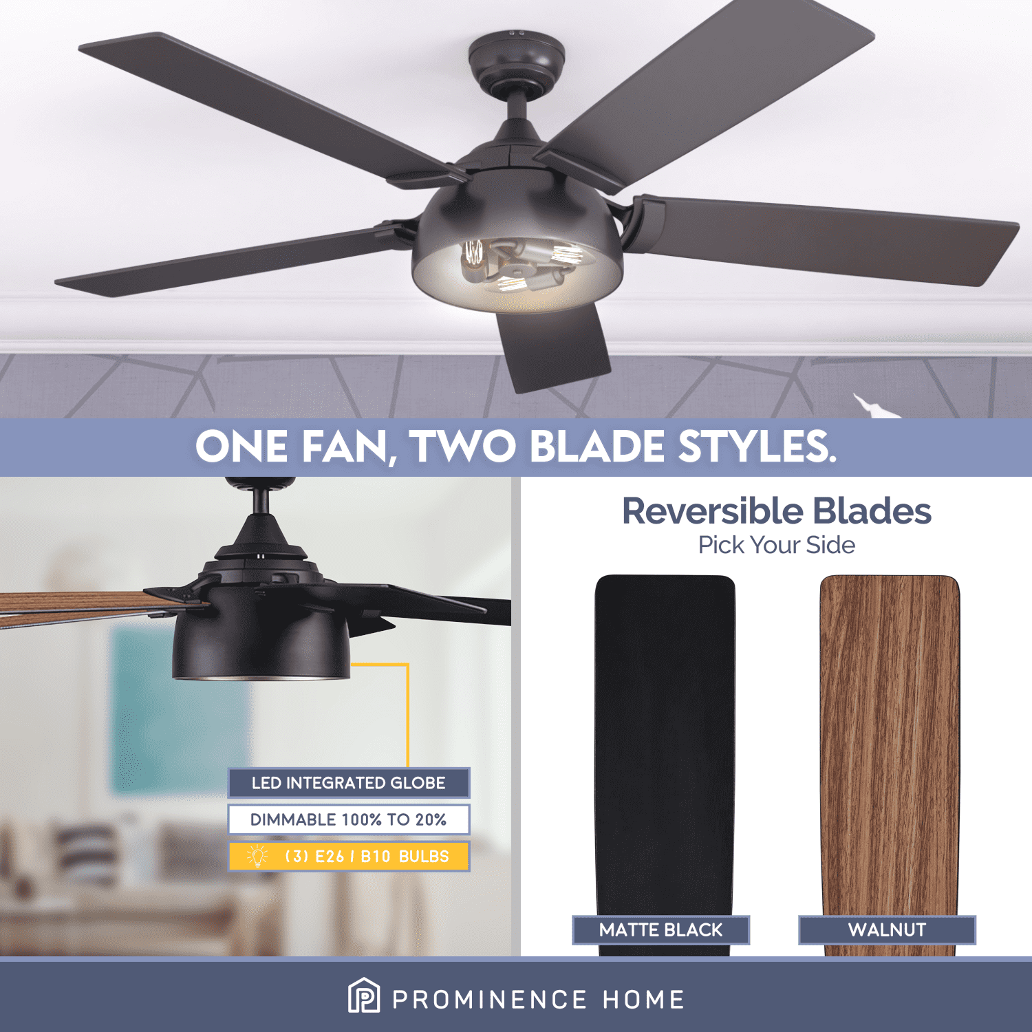 INDUSTRIAL MODERN – The Prominence Home Octavia provides the ultimate fusion of style to elevate and illuminate your indoor spaces. Having a blade span of 52 inches, this industrial ceiling fan is perfect for large to medium rooms such as bedrooms, living rooms, offices and much, much more!! EDISON BULBS: This beautiful lantern-style light has the power to light up room but also dimmable to adjust to your moods! Ample, fully-integrated LED light fixture with 3 E26/B10 bulbs (included with purchase). This ceiling fan is 450 lumens, 5 watts – 90 lumens per watt. The color temperature is 2700K and its dimmable 20%-100%. DUAL-FINISH REVERSIBLE BLADES: The style is up to you! This ceiling fan comes with a different finish on each side of the blades. One side comes in a beautiful Matte Black finish, while the other side showcases a lovely Walnut finish. Pick the look that best fits your space!