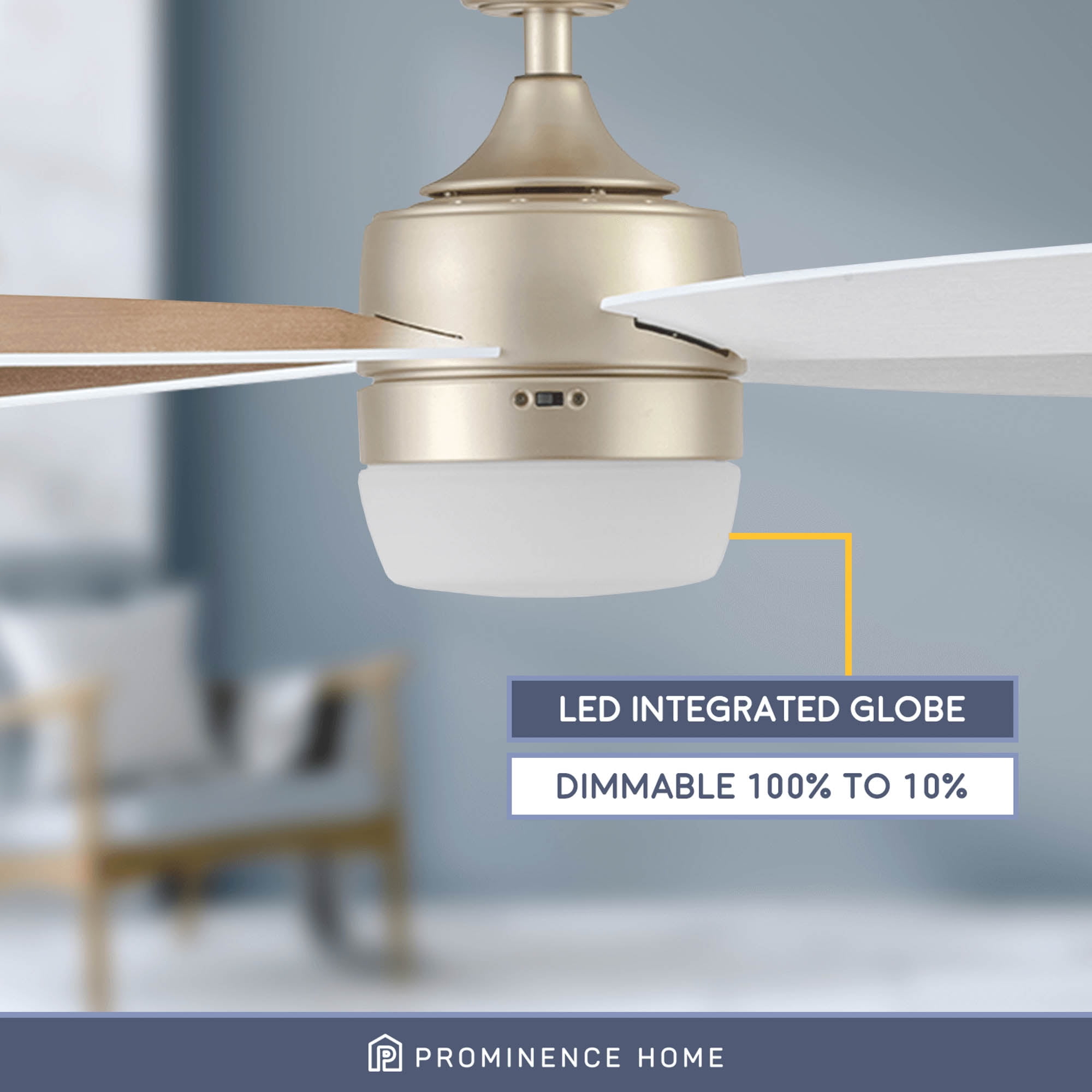 MODERN CEILING FAN: Boasting a sleek glamorous champagne finish, the Prominence Home Atlas ceiling fan brings a clean and contemporary look to your indoor spaces. MEDIUM SIZED: Having a blade span of 44 inches, this modern ceiling fan is perfect for your medium to large rooms such as bedrooms, dining rooms and more! INTEGRATED LED: Power to light up a room but also dimmable! Ample, fully-integrated LED board. This ceiling fan is 1400 lumens, 18 watts, 2700K color temperature and dimmable 10% to 100% DUAL-FINISH REVERSIBLE BLADES: The style is up to you! This ceiling fan comes with a different finish on each side of the blades. One side comes in a beautiful white finish, while the other side showcases a lovely honey Oak finish. Pick the look that best fits your space! REMOTE CONTROL INCLUDED: Control the 3 speed settings and light output with handhled remote control with wall mount