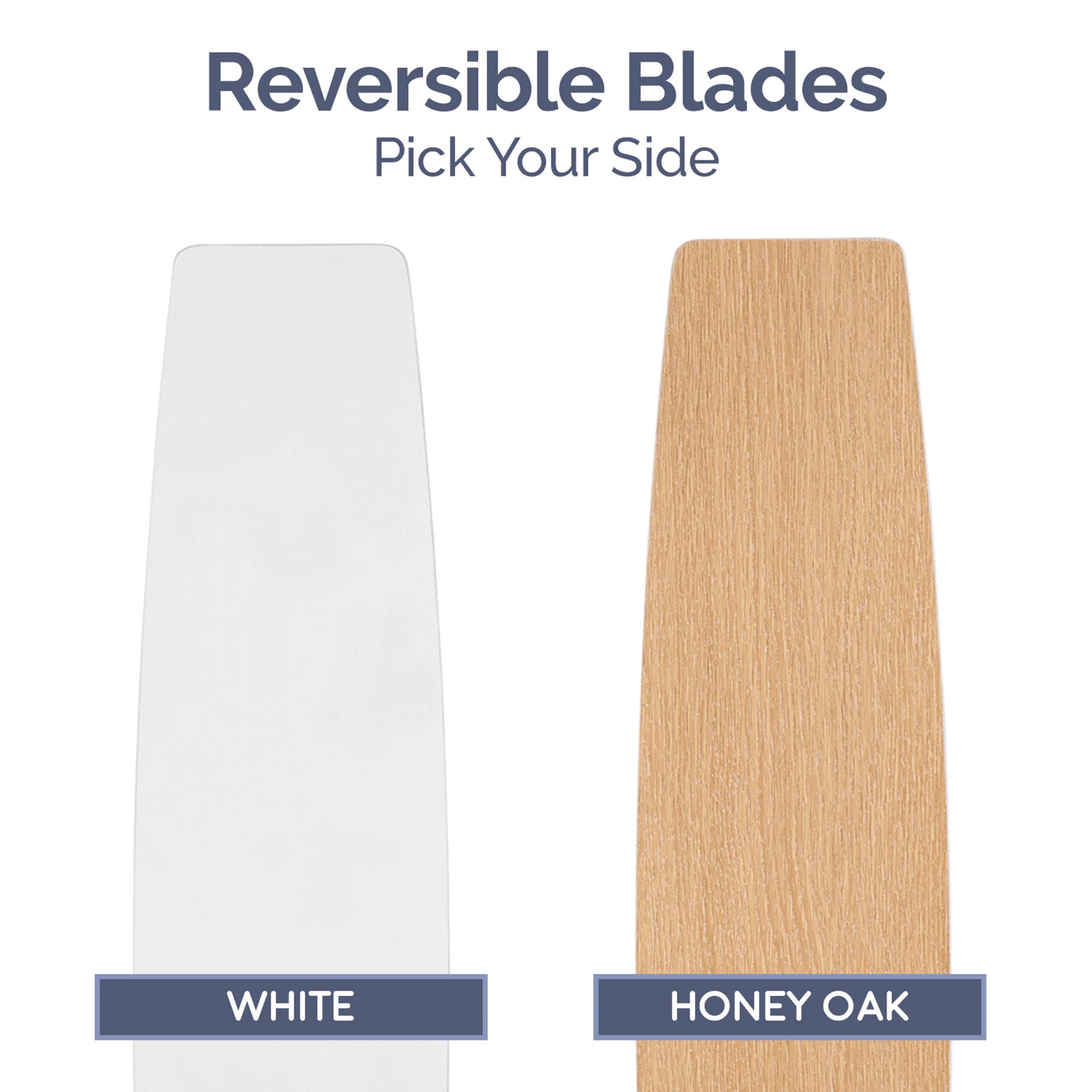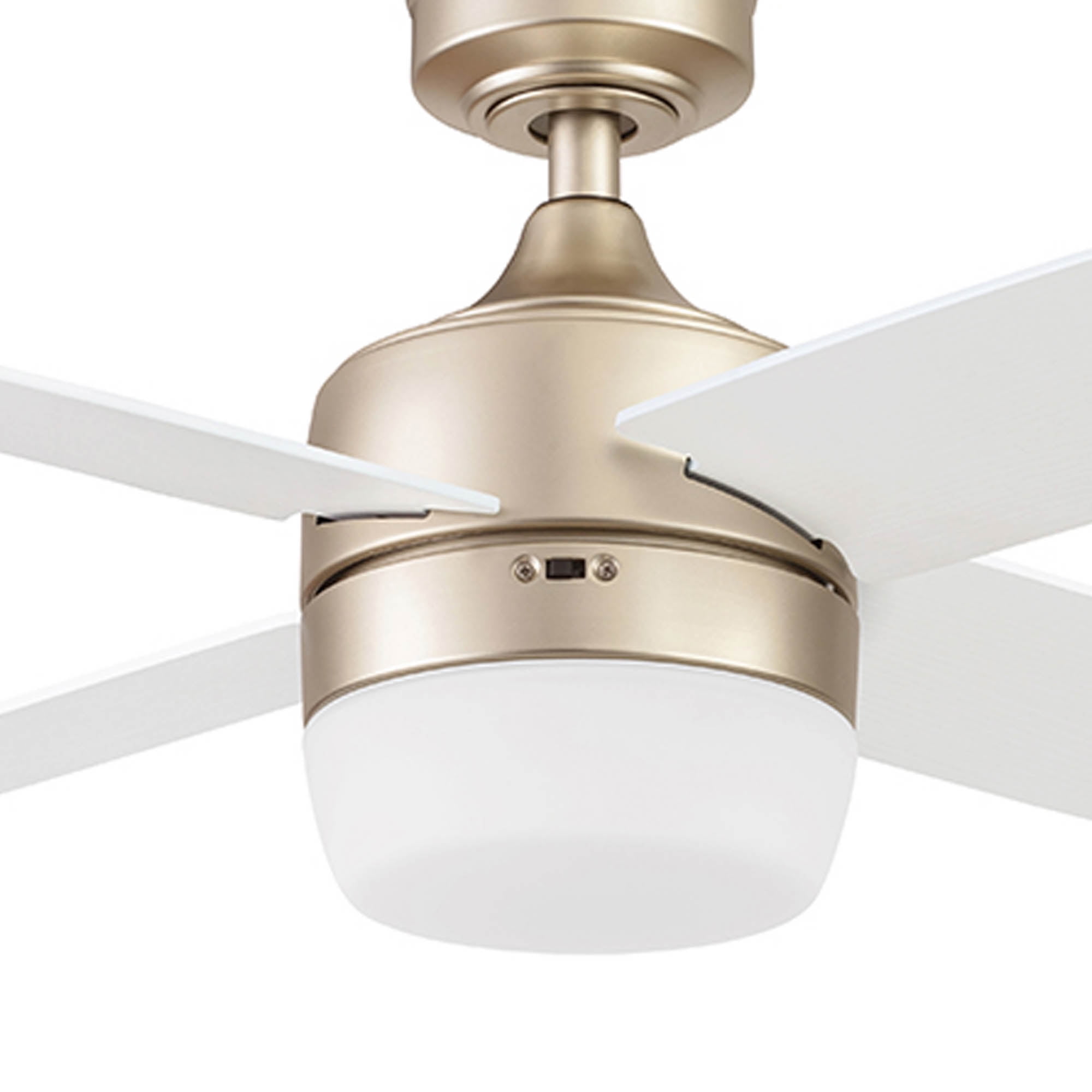 The Prominence Home Atlas has a soft, modern appeal certain to fit flawlessly in your contemporary spaces. This 44-inch champagne gold ceiling fan is sculpted with rounded edges perfectly balanced by high contrasting blade angles. Its sleek cylindrical body houses a powerful, integrated dimmable LED light adding simplicity to style. The Atlas was expertly designed with four clean-lined, reversible blades in white and honey oak. Adjusting the blades is quick and easy- the choice is yours! The robust motor and design provides adjustable, reversible air movement that is ultra-efficient whether you want to cool down on those sweltering summer days or circulate warm air in the cold months of winter. The included remote controls the power, 3 speed settings of the fan, the reversible airflow and light output. The Prominence Home Atlas gives you all the quality functions you deserve while providing the impressive eye-catching style you crave.